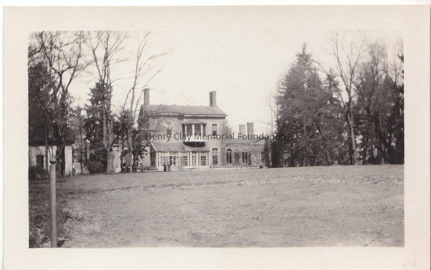Black and white photograph of the rear of Ashland, in the 1920's. Visible the winter garden, and a bow window upstairs (now gone).