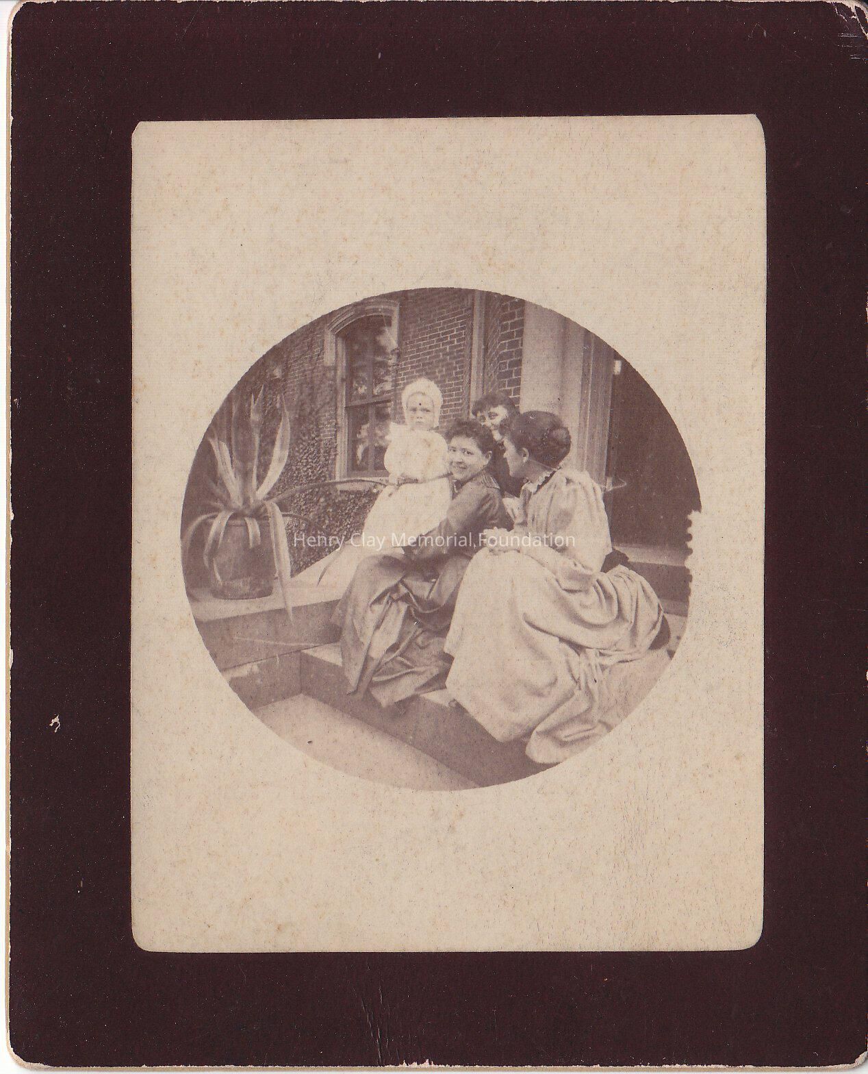 A black and white photograph of three woman, and a baby, sitting on stones steps.