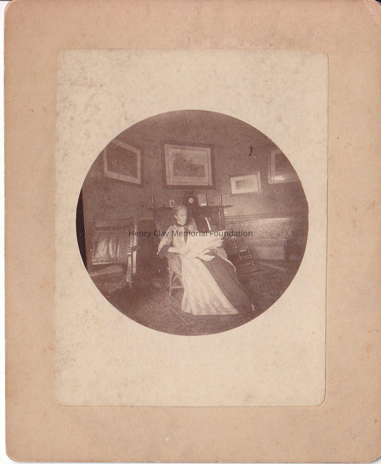 Black and white photograph of a woman sitting on a chair reading a newspaper. She is wearing a long striped dress, whit an opening in the middle of a dark color.Dimensions