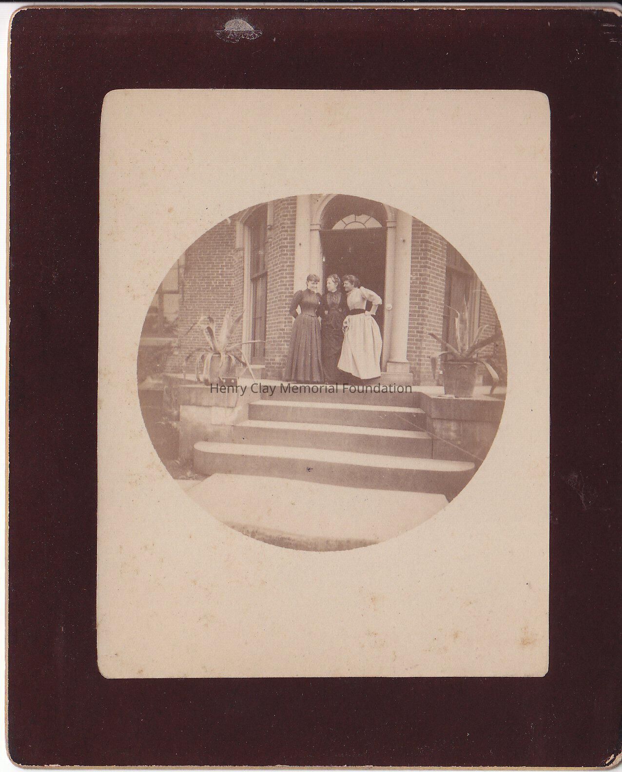 A black and white photograph depicting three women standing in front of the entry door at Ashland. Two are wearing two dark dresses, and one light.Dimensions