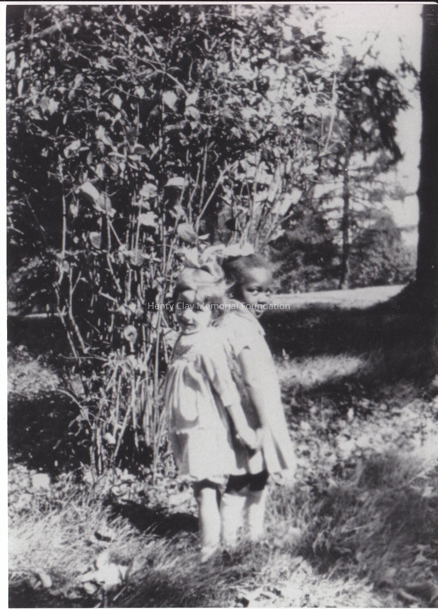 A black and white photograph of two little girls, giving each other back, holding hands in a yard.