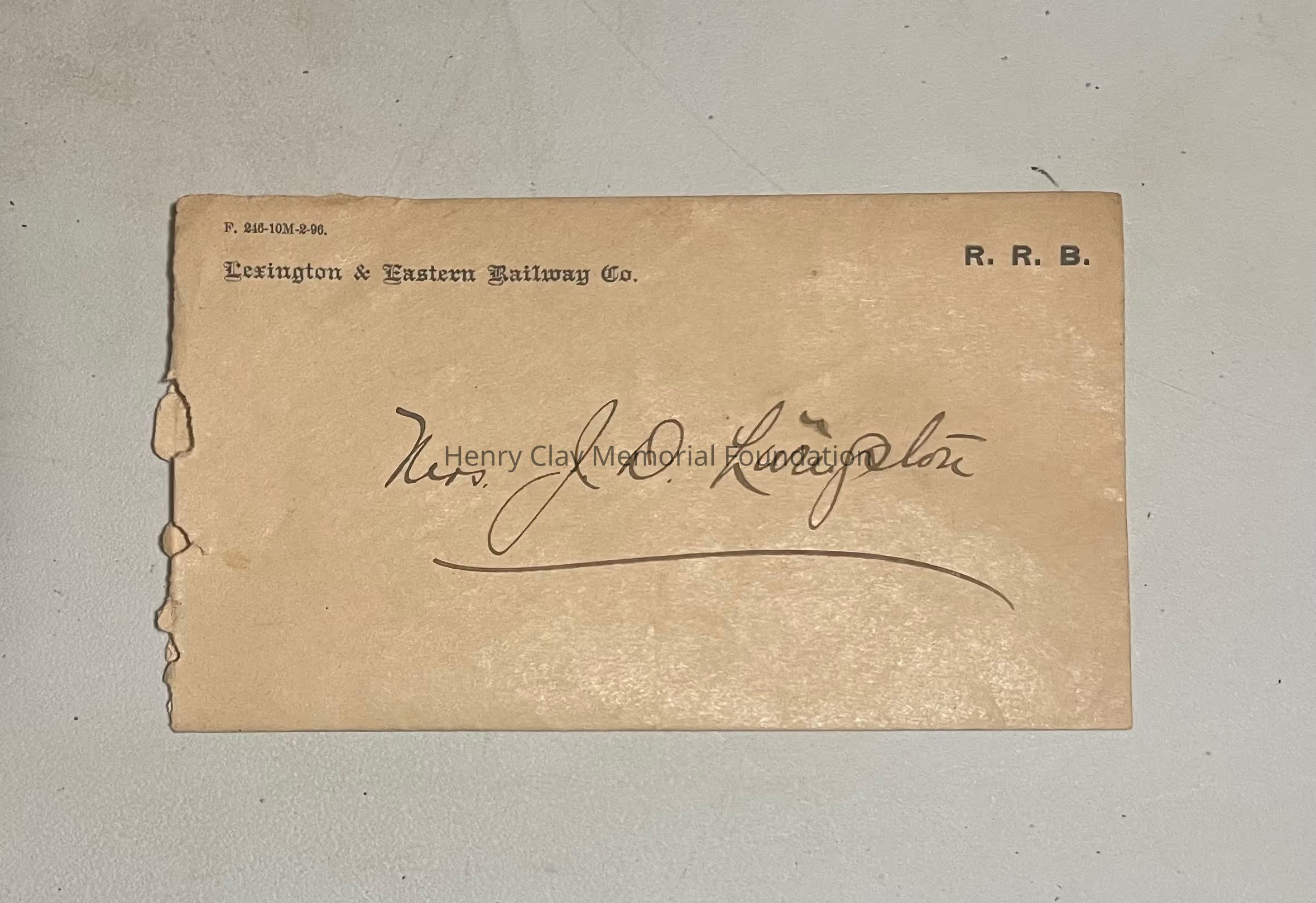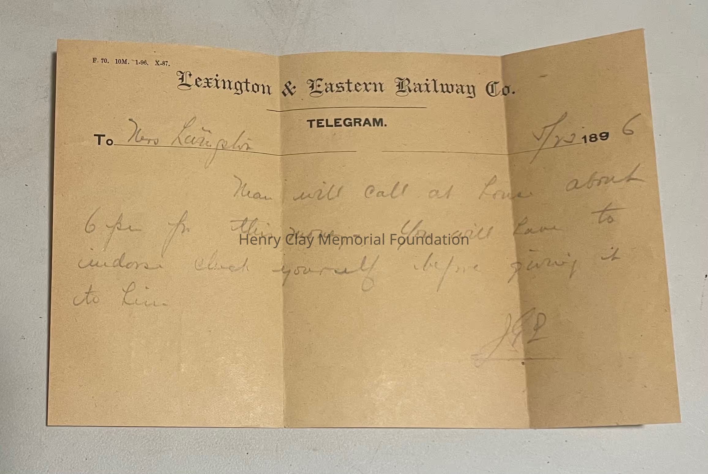A telegram and its envelope dated 5/22/1896 from the Lexington and Eastern Railway Co.Dimensions