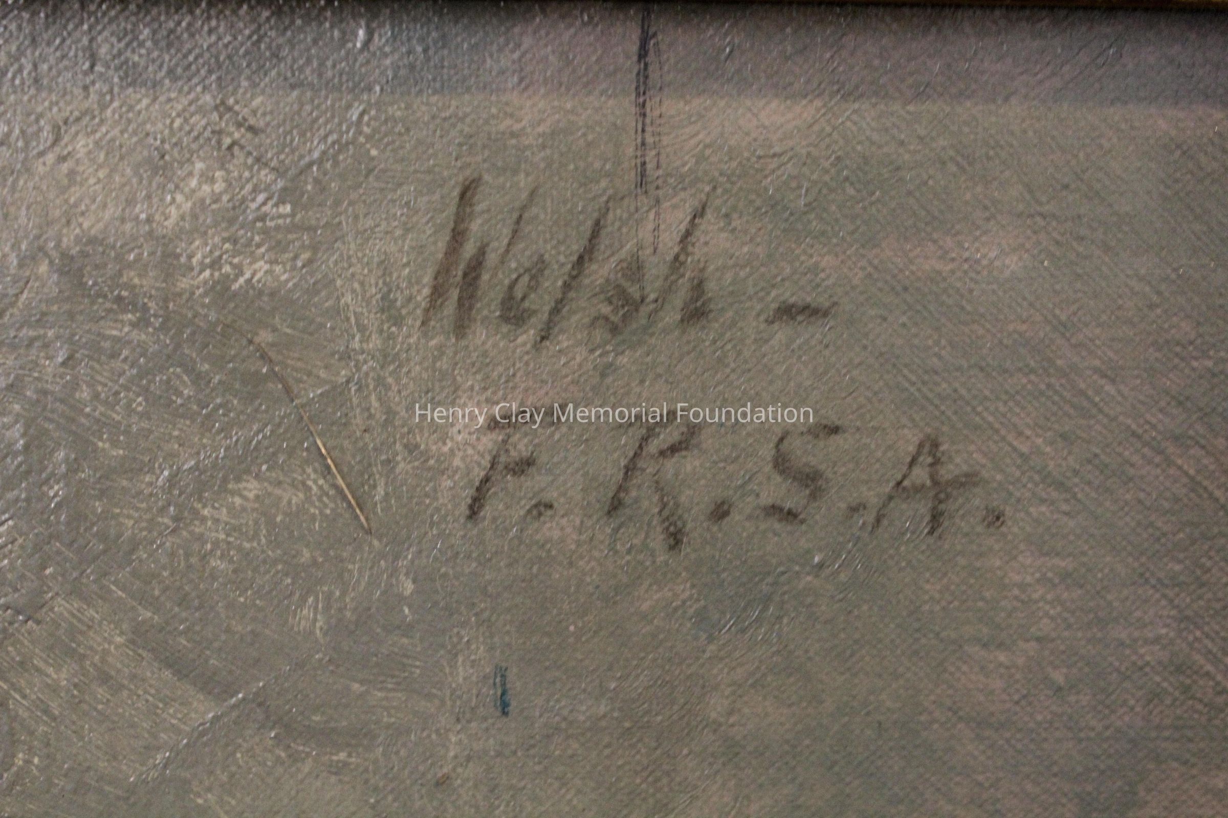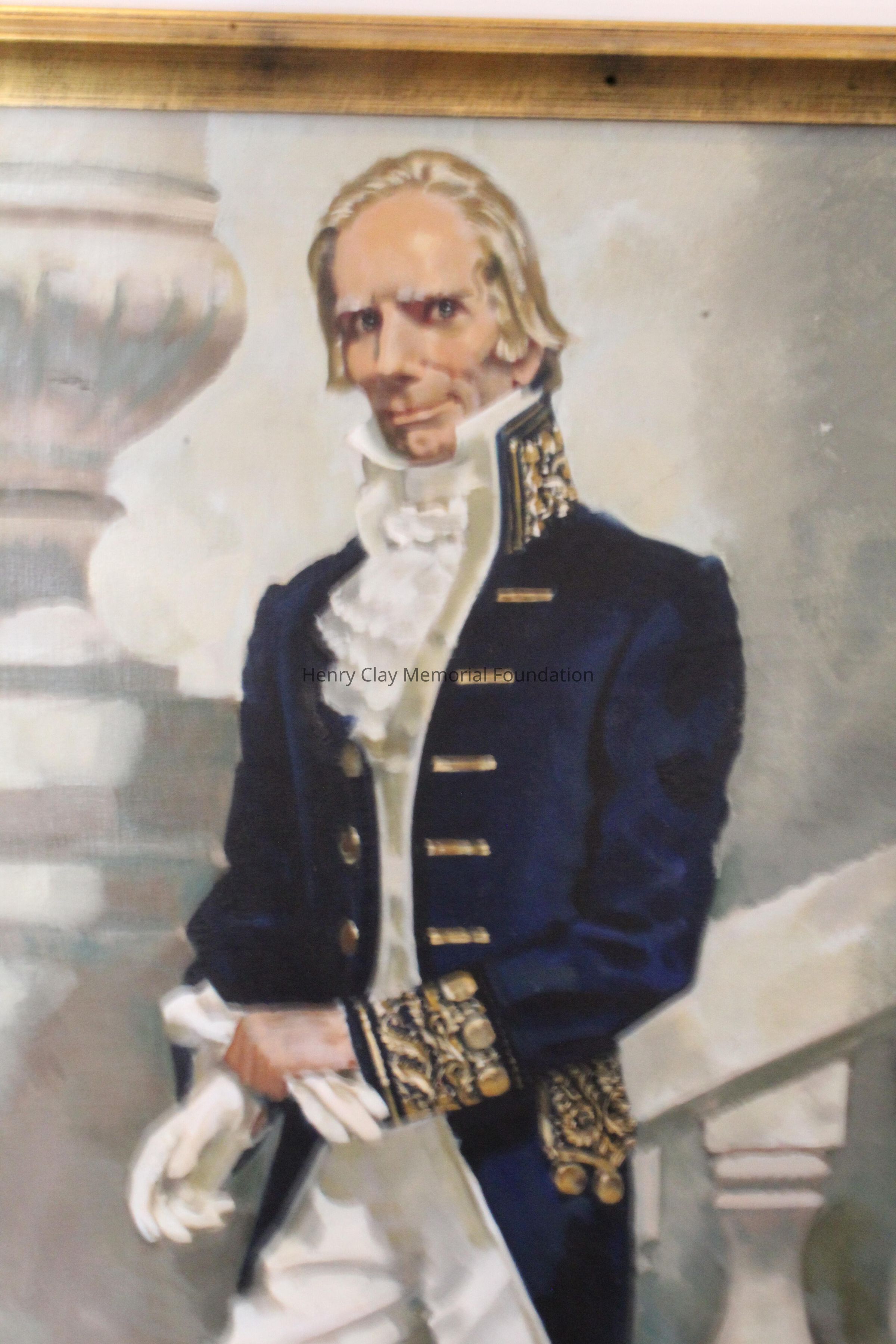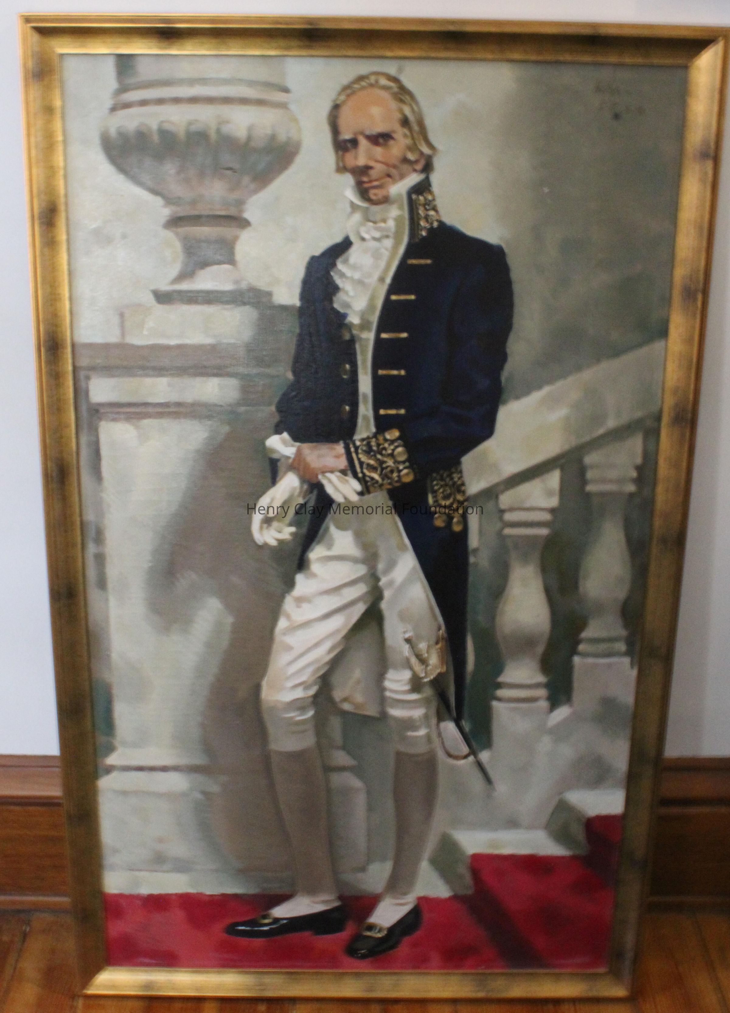 Full-length portrait depicting Clay in his uniform at the Signing of the Treaty of Ghent, 1814. Clay is wearing a blue tailcoat with high collar trimmed with decorative gold embroidery, white trouser, white shirt and cravat, and black shoes. He is pulling a white glove on his right hand and is standing in front of a banister and column. Red carptet on the floor and gray background. Signed in gray in the upper right corner, "Welsh-- / F.R.S.A." Framed in very plain white-washed frame.Dimensions