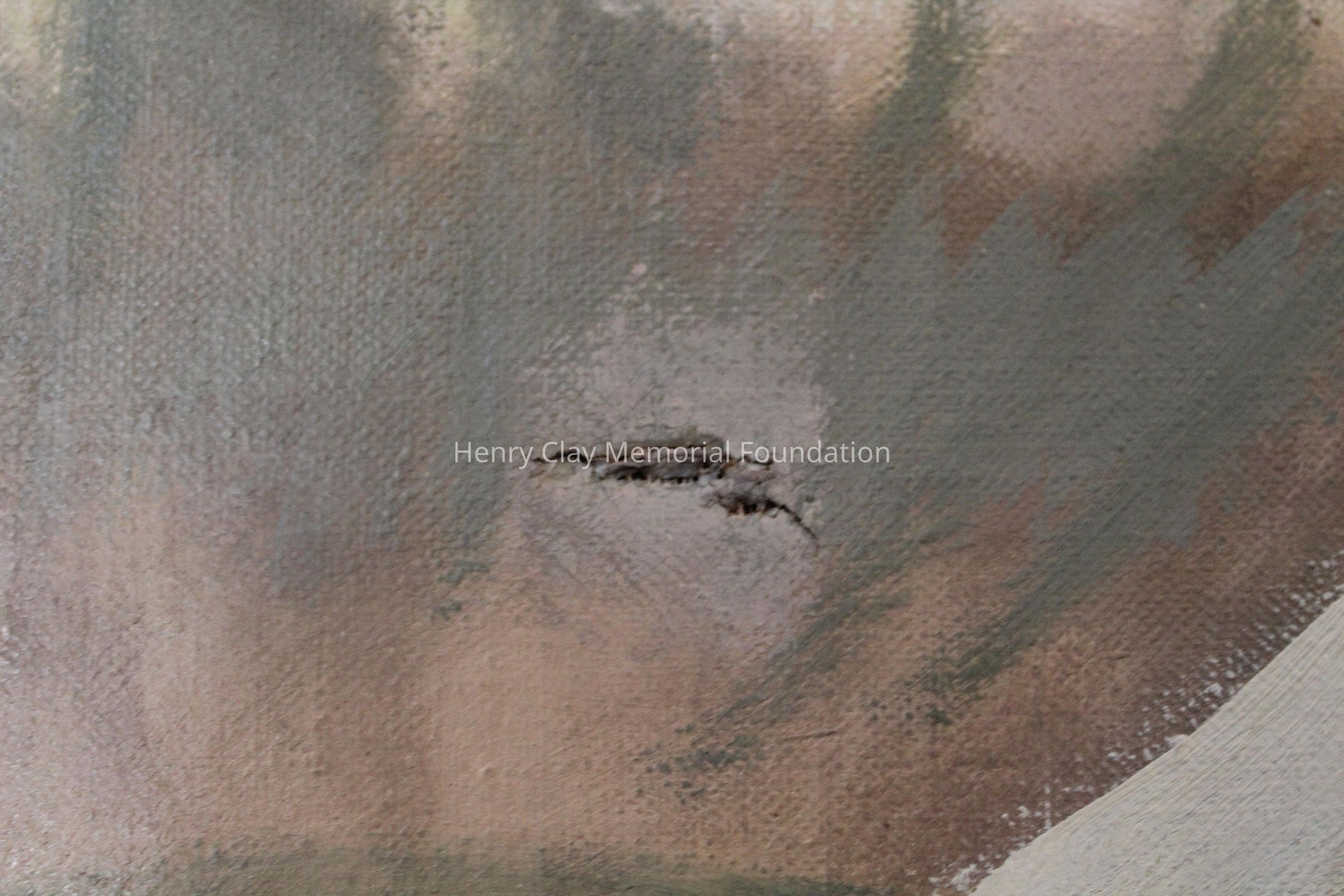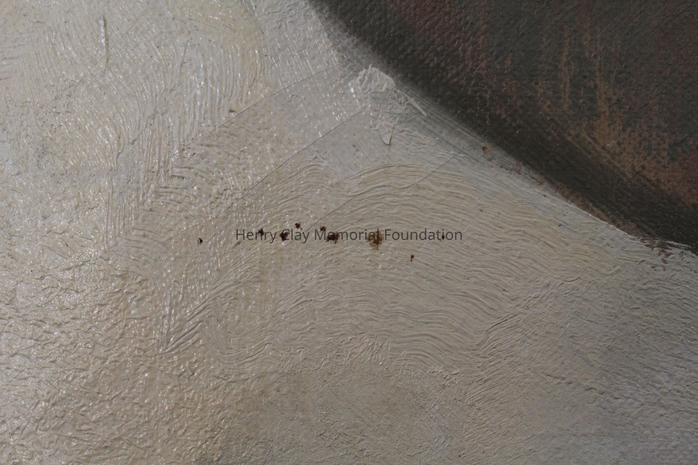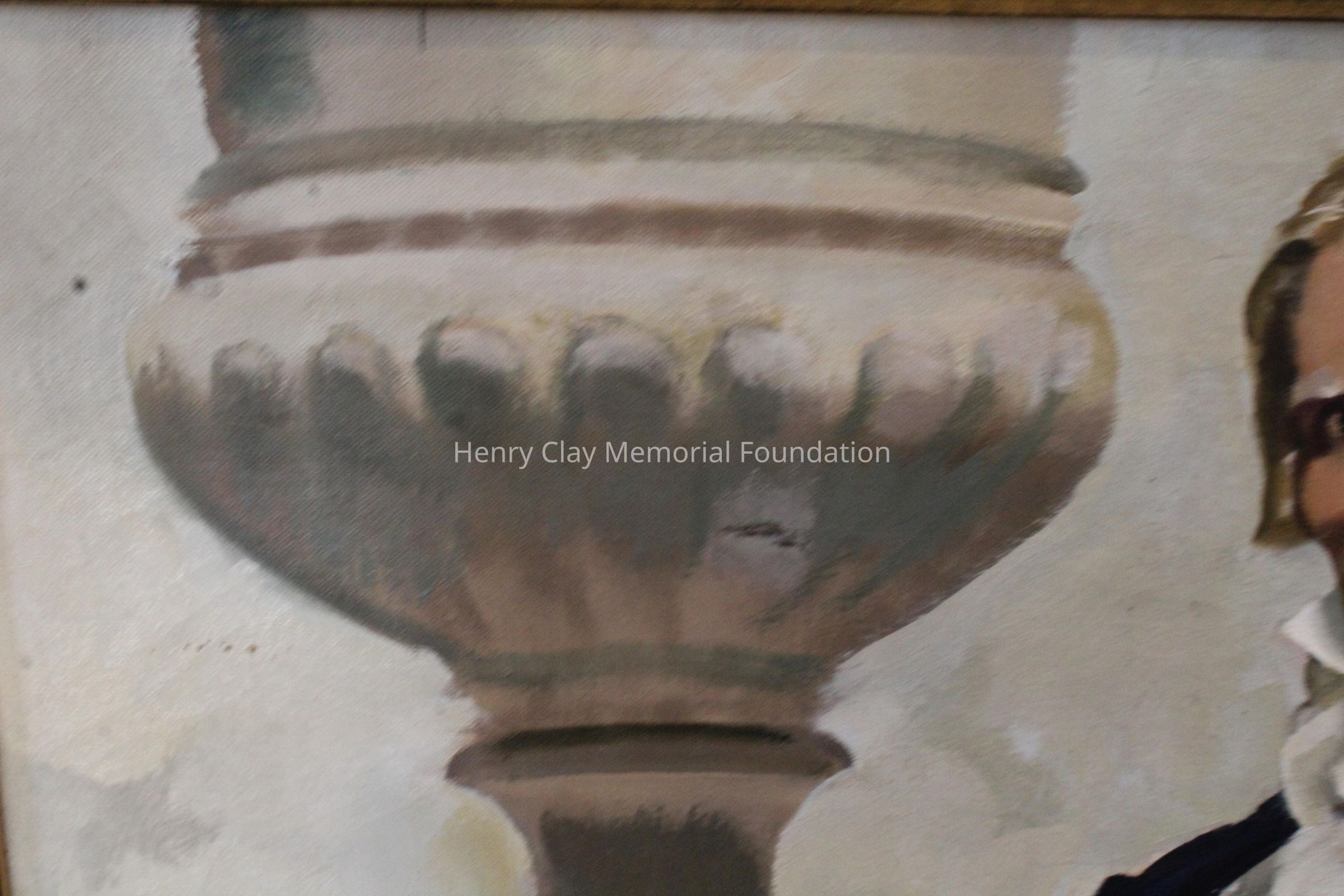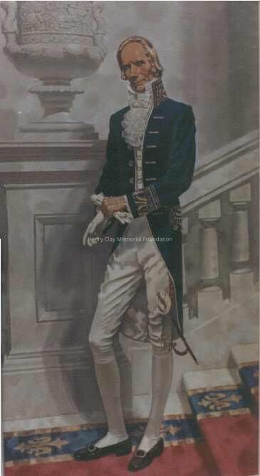 Full-length portrait depicting Clay in his uniform at the Signing of the Treaty of Ghent, 1814. Clay is wearing a blue tailcoat with high collar trimmed with decorative gold embroidery, white trouser, white shirt and cravat, and black shoes. He is pulling a white glove on his right hand and is standing in front of a banister and column. Red carptet on the floor and gray background. Signed in gray in the upper right corner, "Welsh-- / F.R.S.A." Framed in very plain white-washed frame.Dimensions