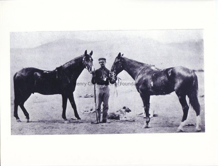 A black ans white copy of a photograph of two horses held by a man in uniform, at his feet a sitting dog.