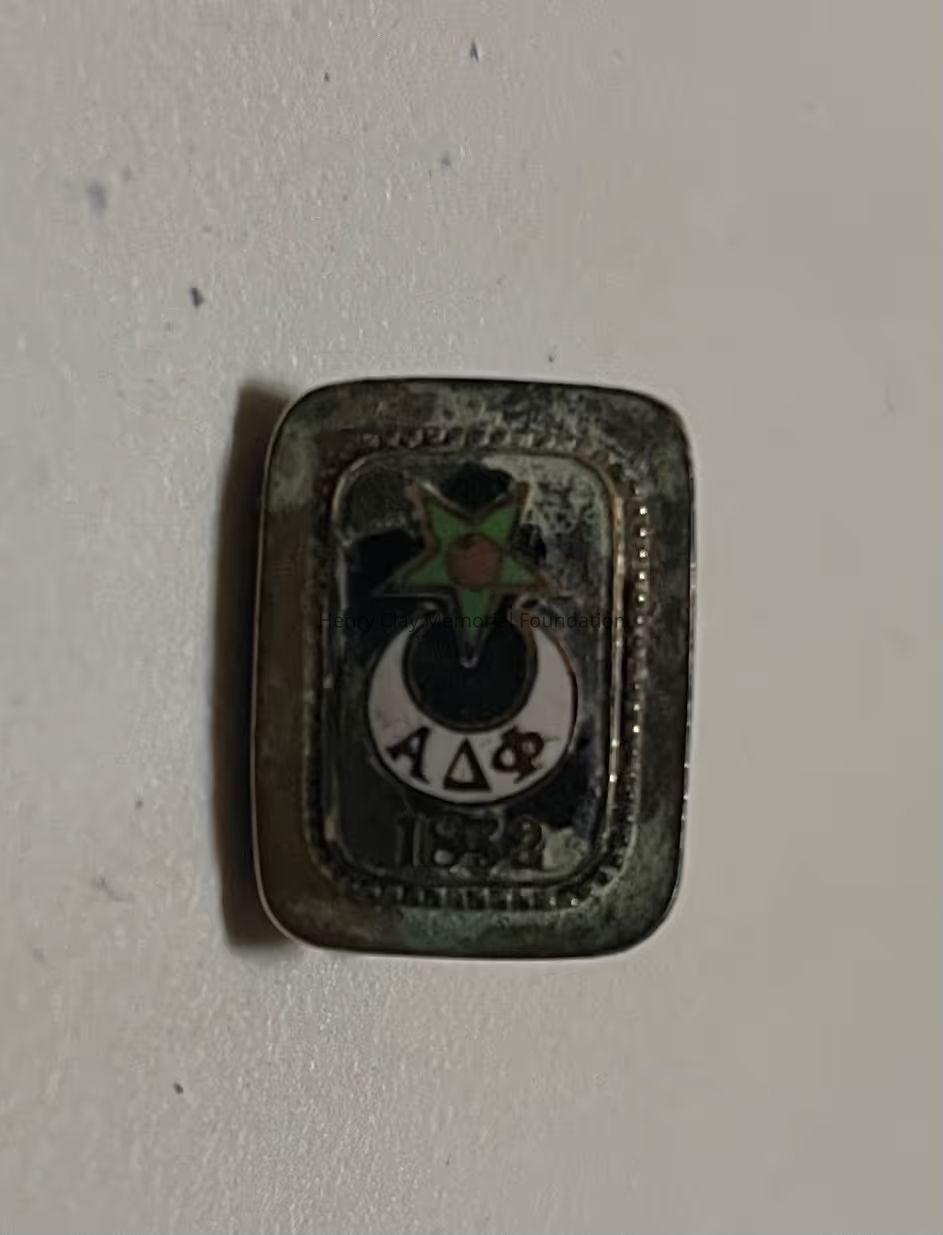 a small pin displaying the logo and greek letters of the Alpha Delta Phi fraternity, along with its founding year, 1832