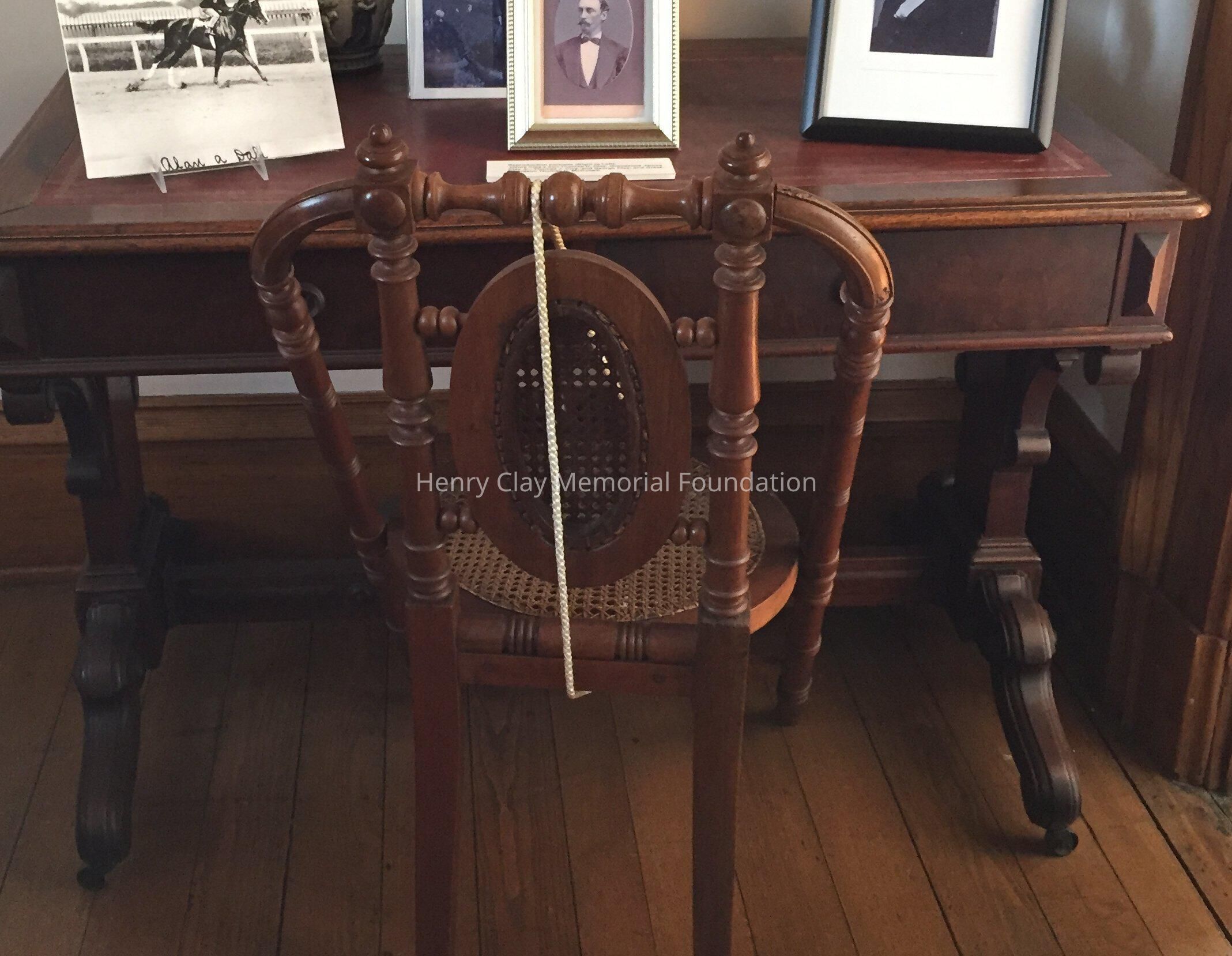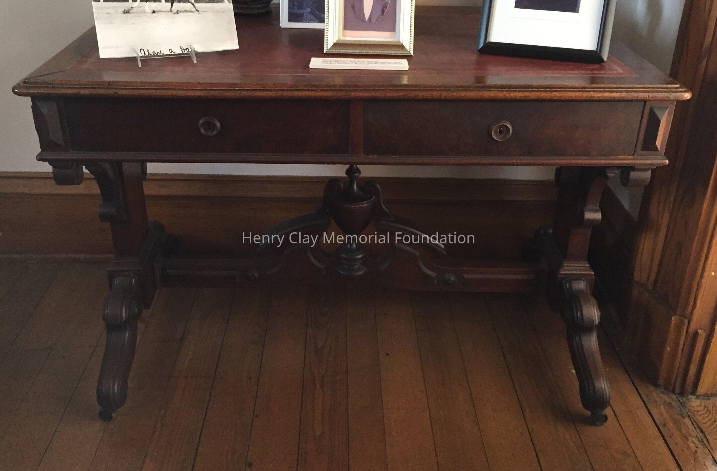 Partner's Desk. Oak with 2 drawers, one opens to the front, one opens to the back, red leather inset on top, tooled around the edge. Numbered inside right drawer.