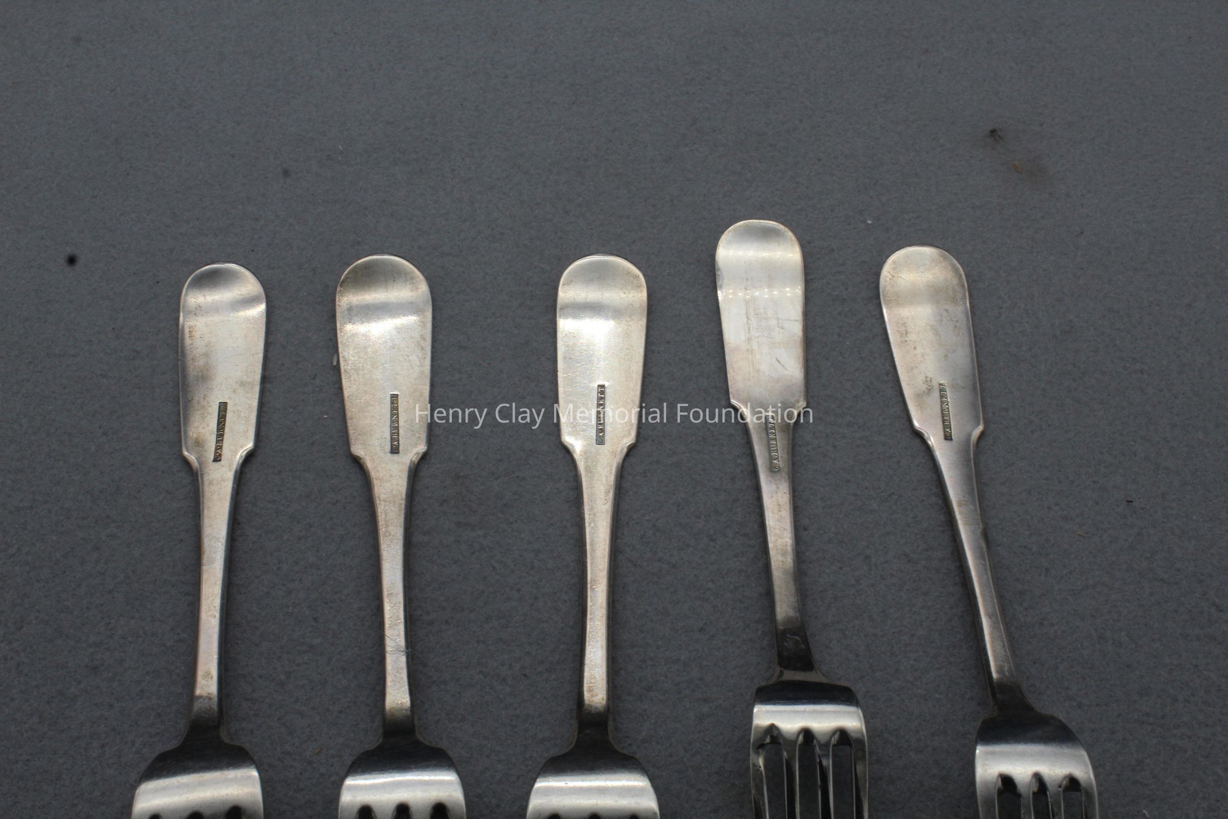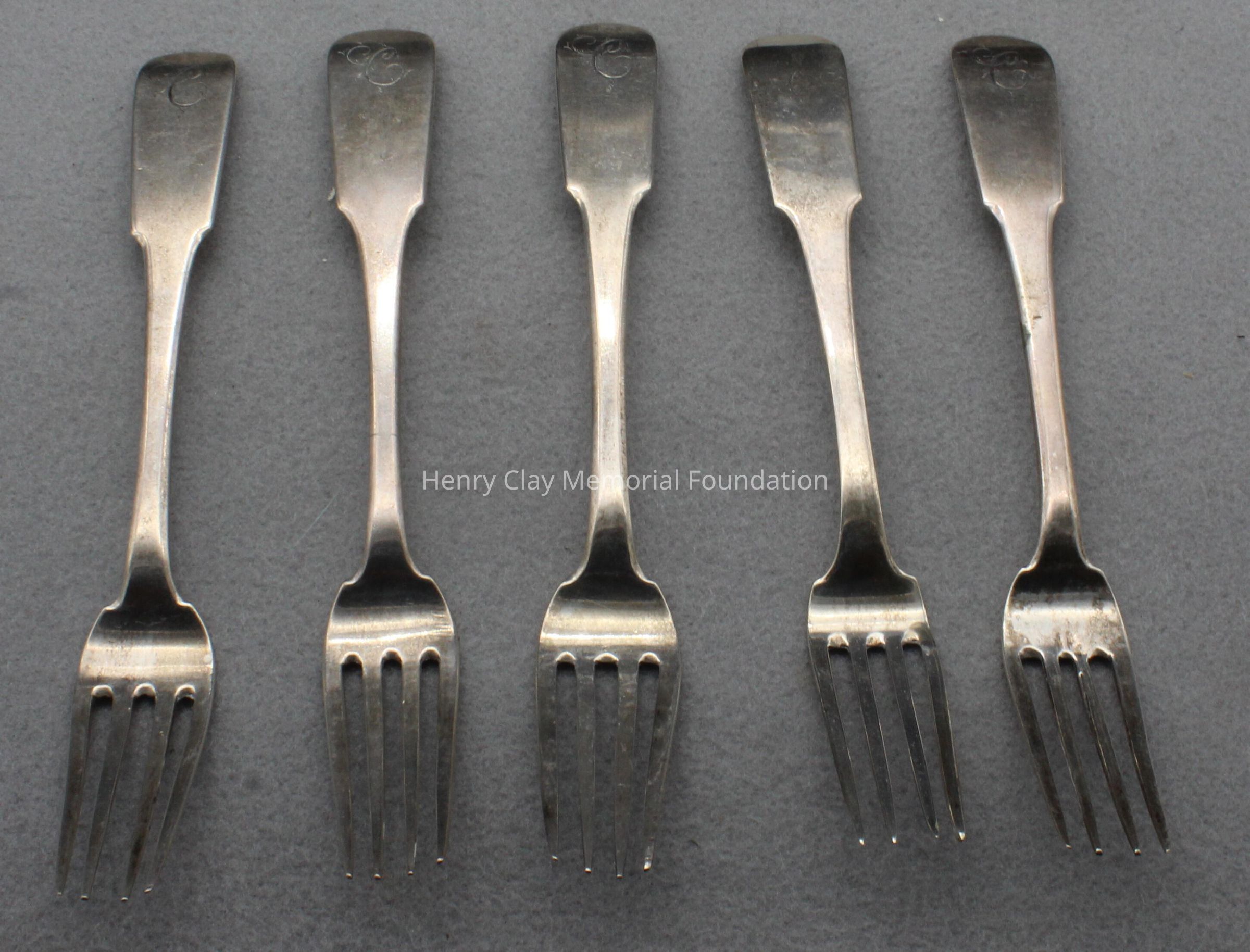 Set of five coin silver dinner forks. Each has 4 tines and a rounded rectangualr end monogrrammed with the letter "C". Each has the CA Burnett maker's mark on the reverse.Dimensions