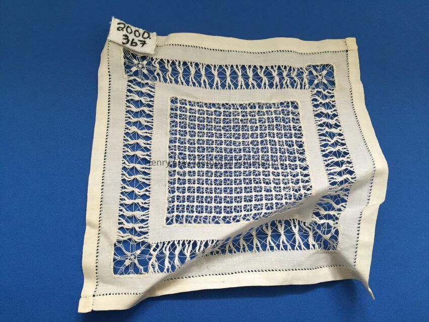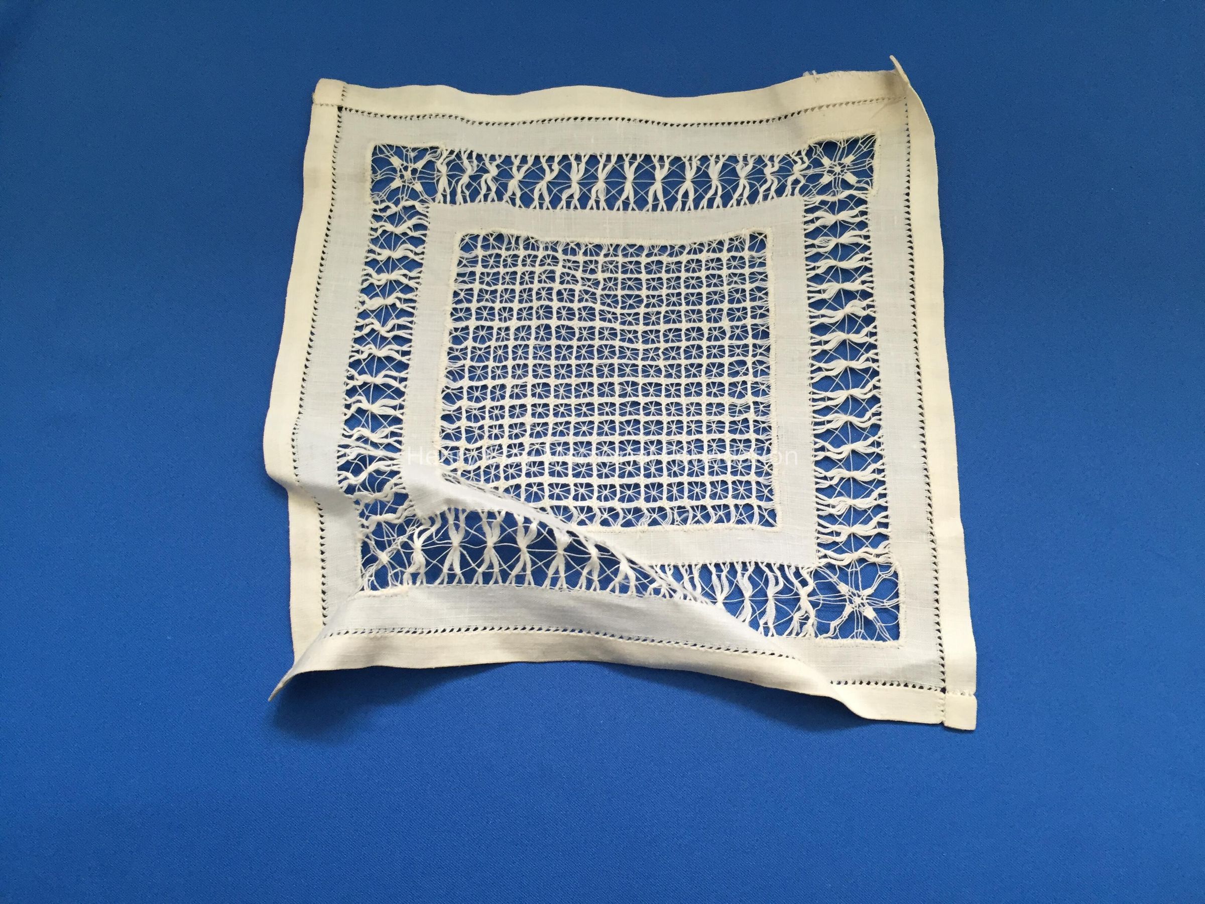 Square linen crocheted doily. It is binded around the edge. The outline is in stitches. The cut work and crocheted design is made around the edge of the larger square in center.