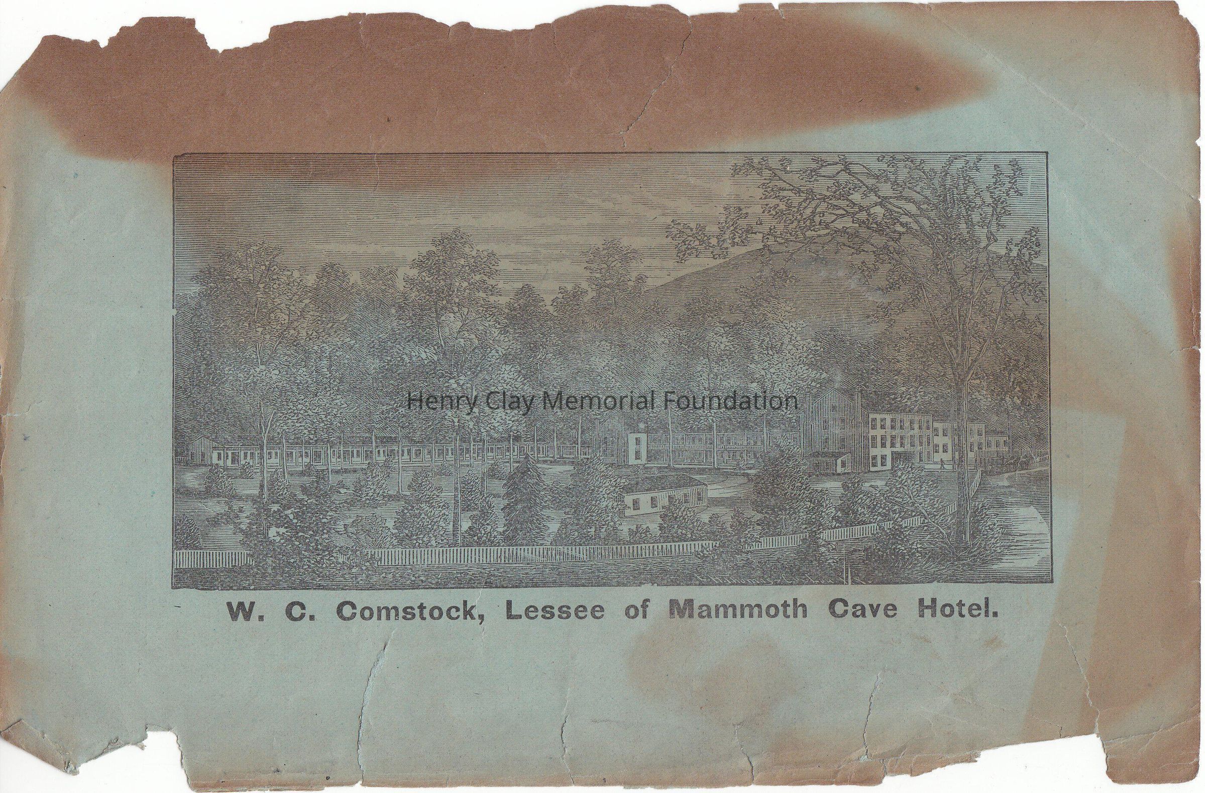 The Drawing depicts W.C Comstock, Lessee of Mammoth Cave Hotel. In the rear an exhaustive explanation about the Hotel.