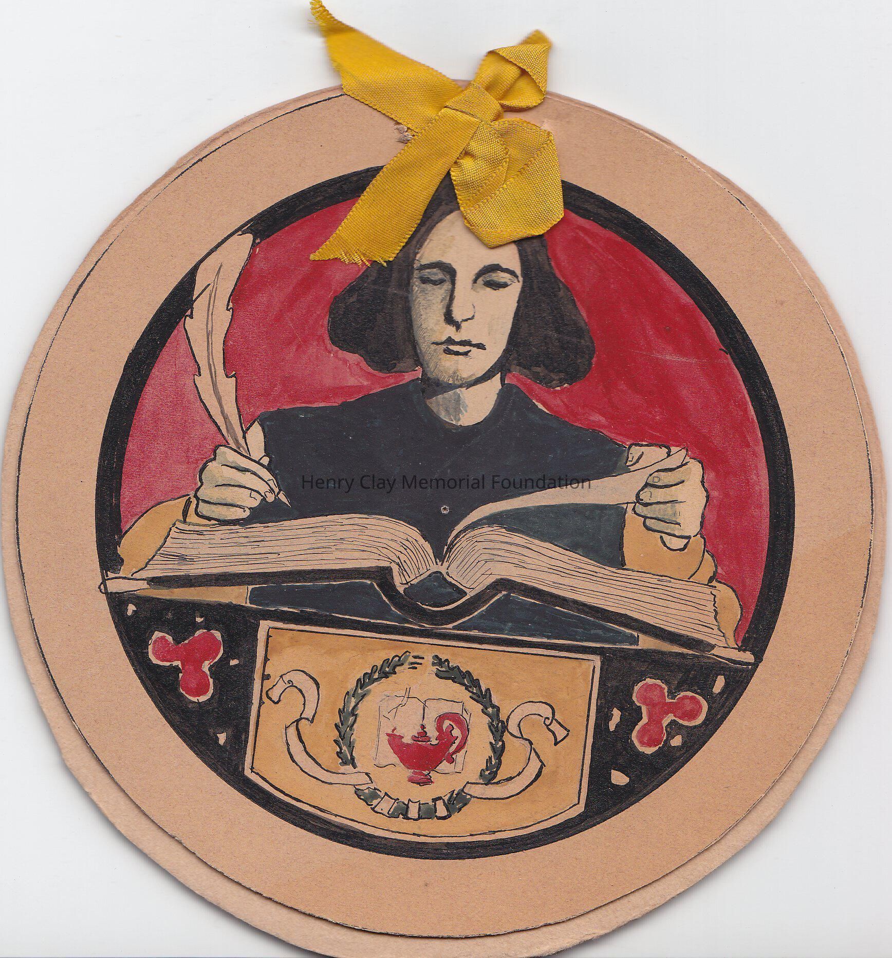 A cardboard circle, with another layer of paper with a drawing. A woman, writing in a book with a quill. The book is on a stand with a wreath, with a white ribbon. The layers of cardboard and paper are thight togheter with a yellow satin ribbon.