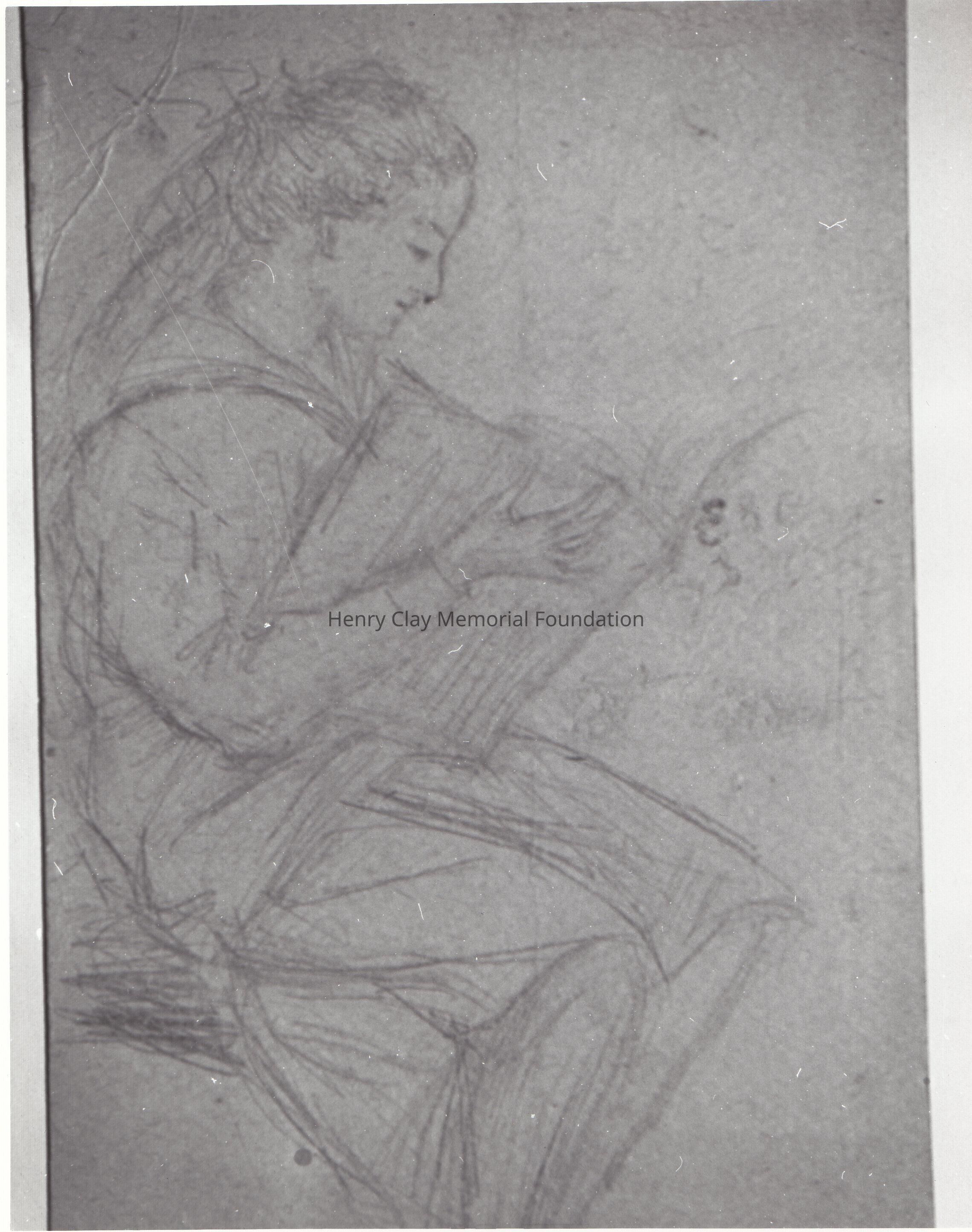 A photograph of a sketch made by Susan Clay Sawitzky of her sister Elizabeth (Metzie). Metzie is reading a book.