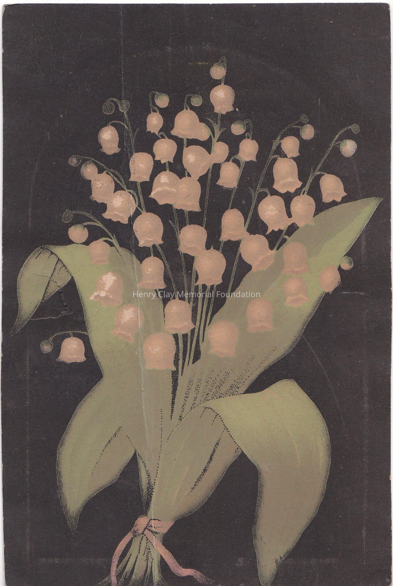 A drawing of a small bouquet of Lily of the Valley, held togheter by a pink string.