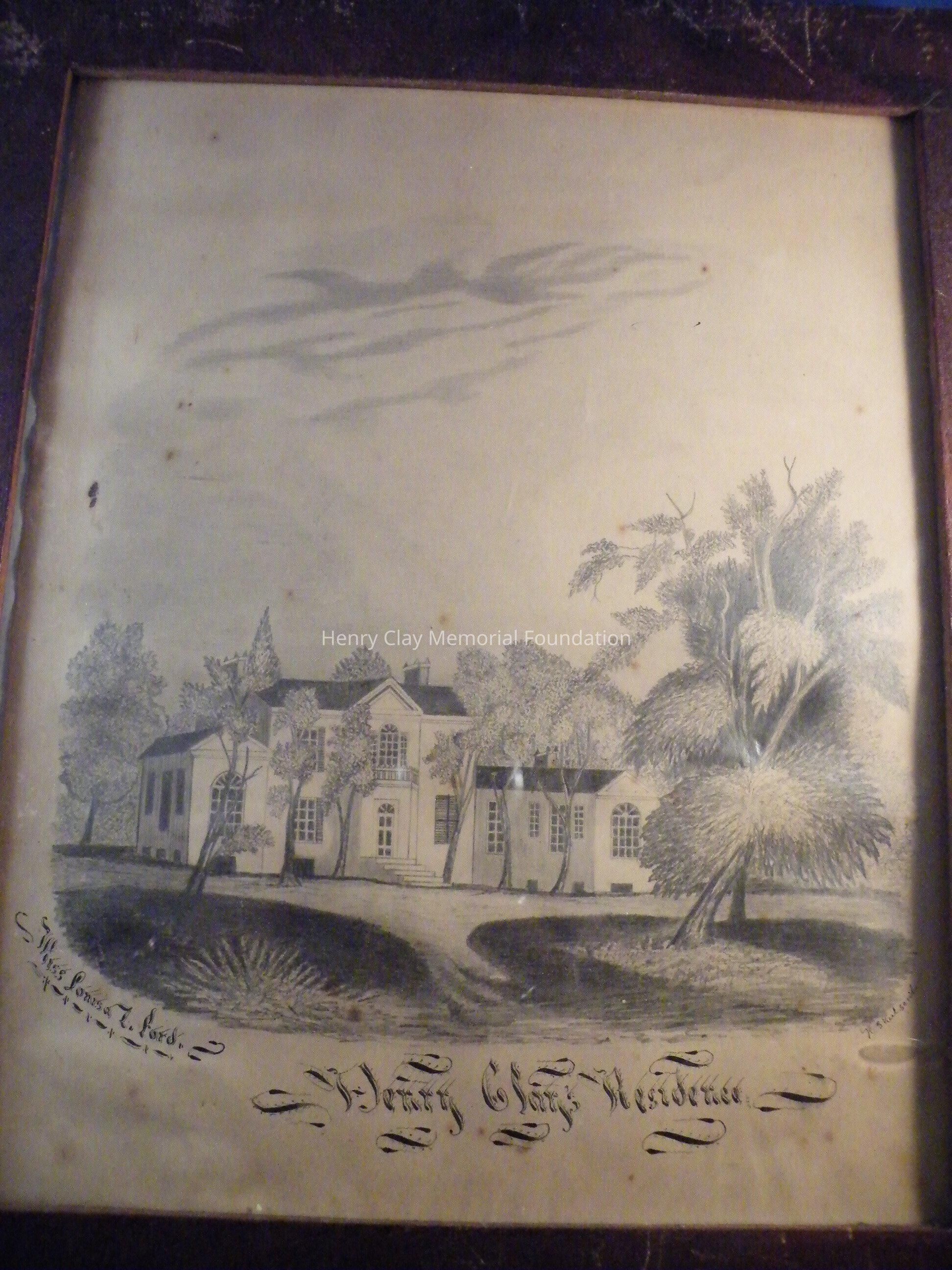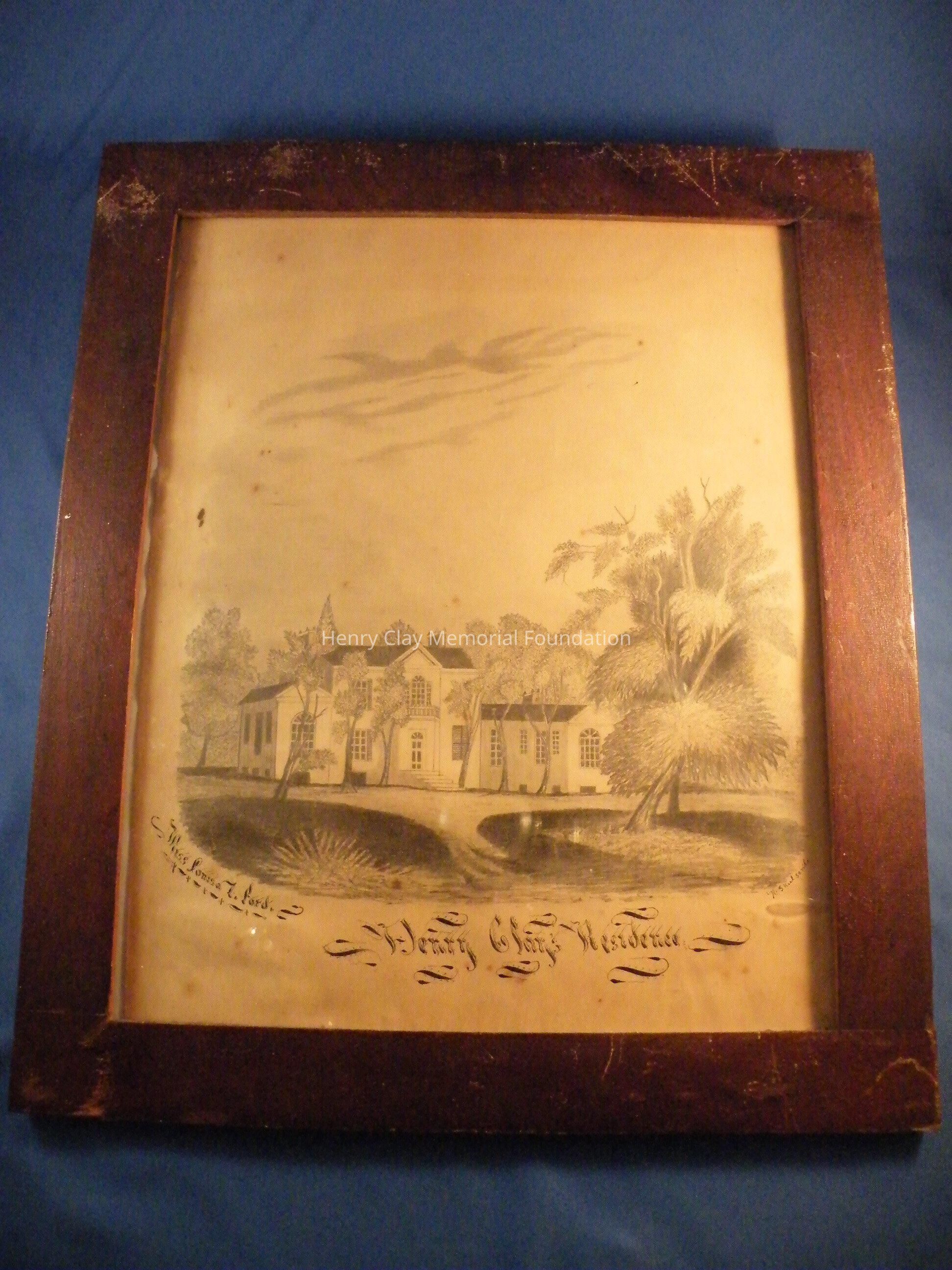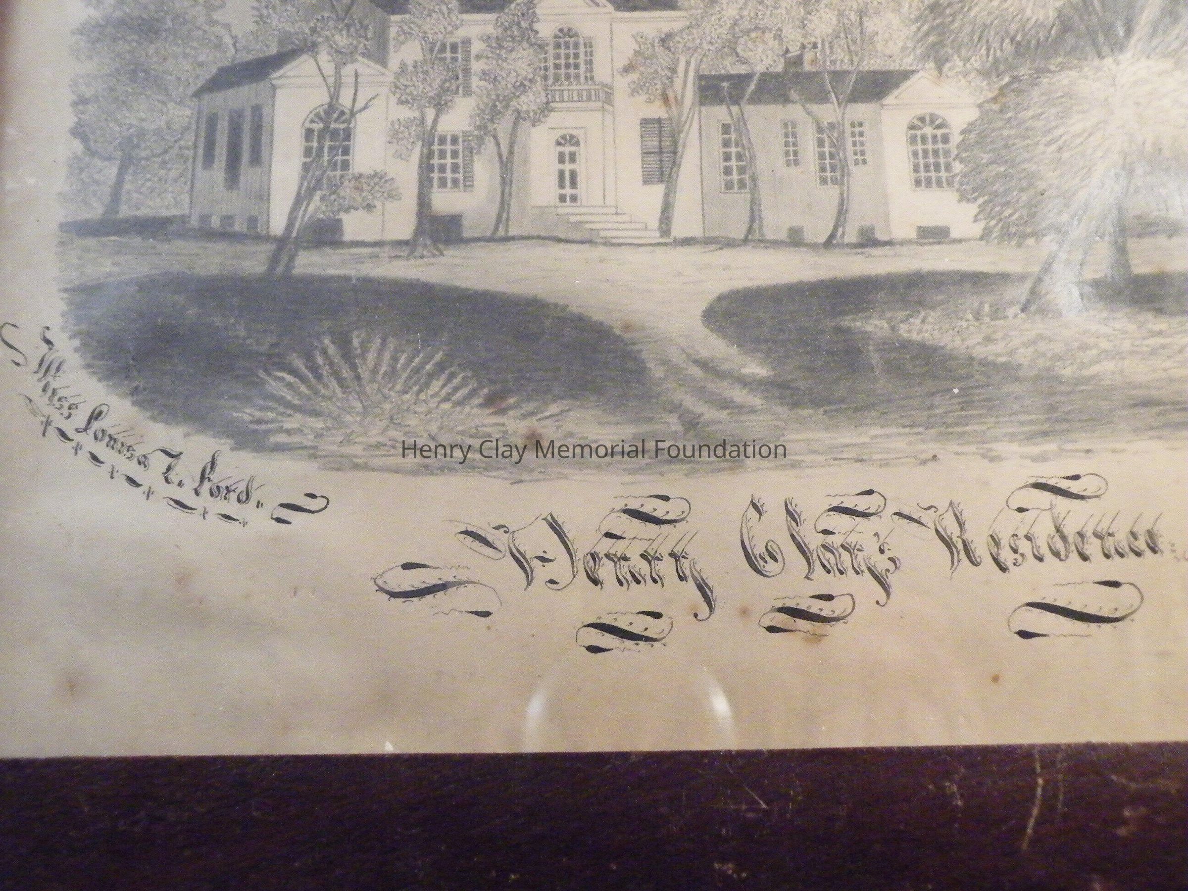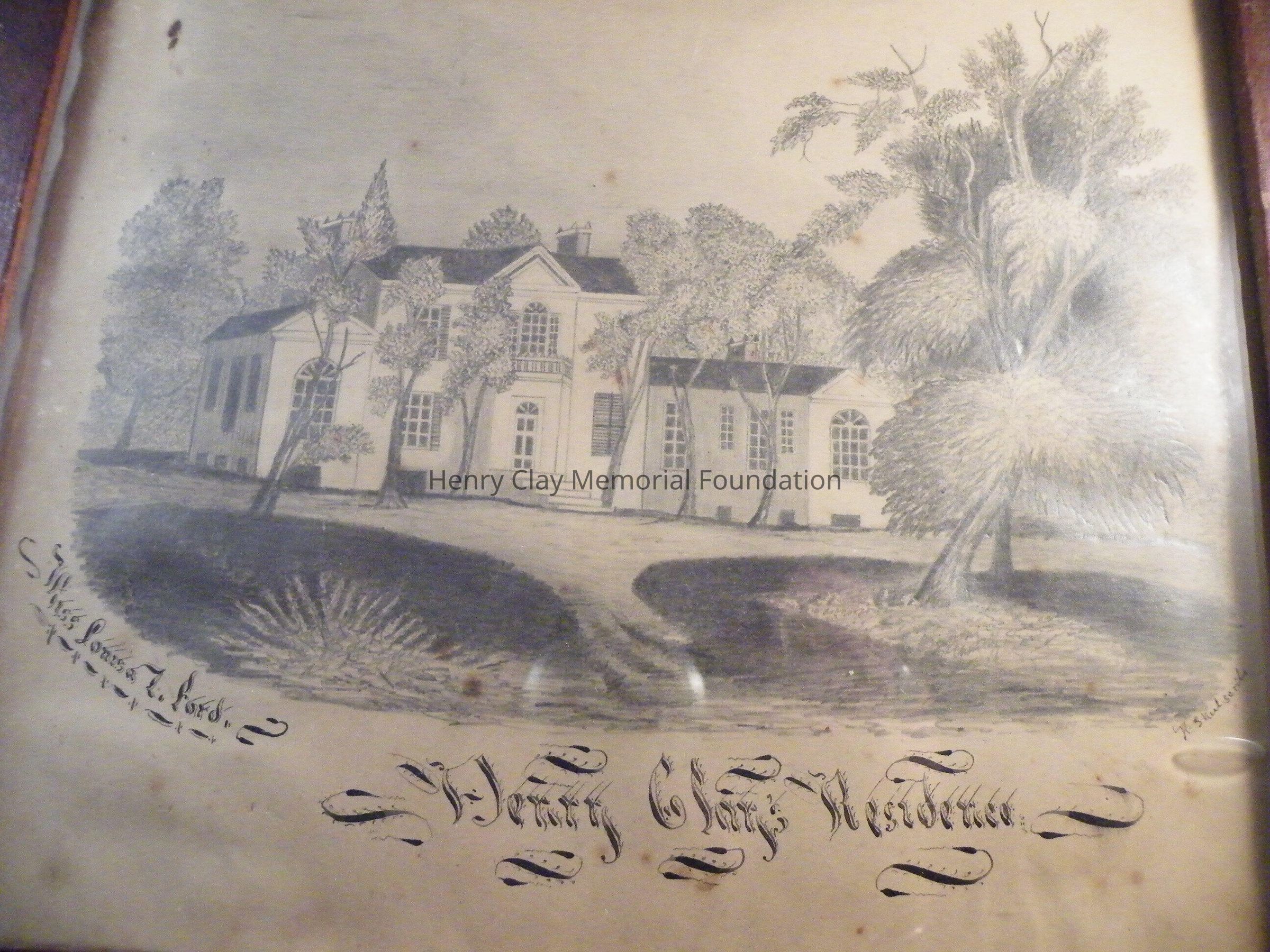 This drawing on paper is of the mansion at Ashland. The drawing is in pencil and shows the house, part of the driveway, and many trees and shrubs. Beneath the picture is the name "Miss Louisa T.(?) Ford" and the title "Henry Clay Residence" in large fancy calligraphy, to the bottom right of the image is the inscription "H.S. Kiel Scribe" in very small letters.