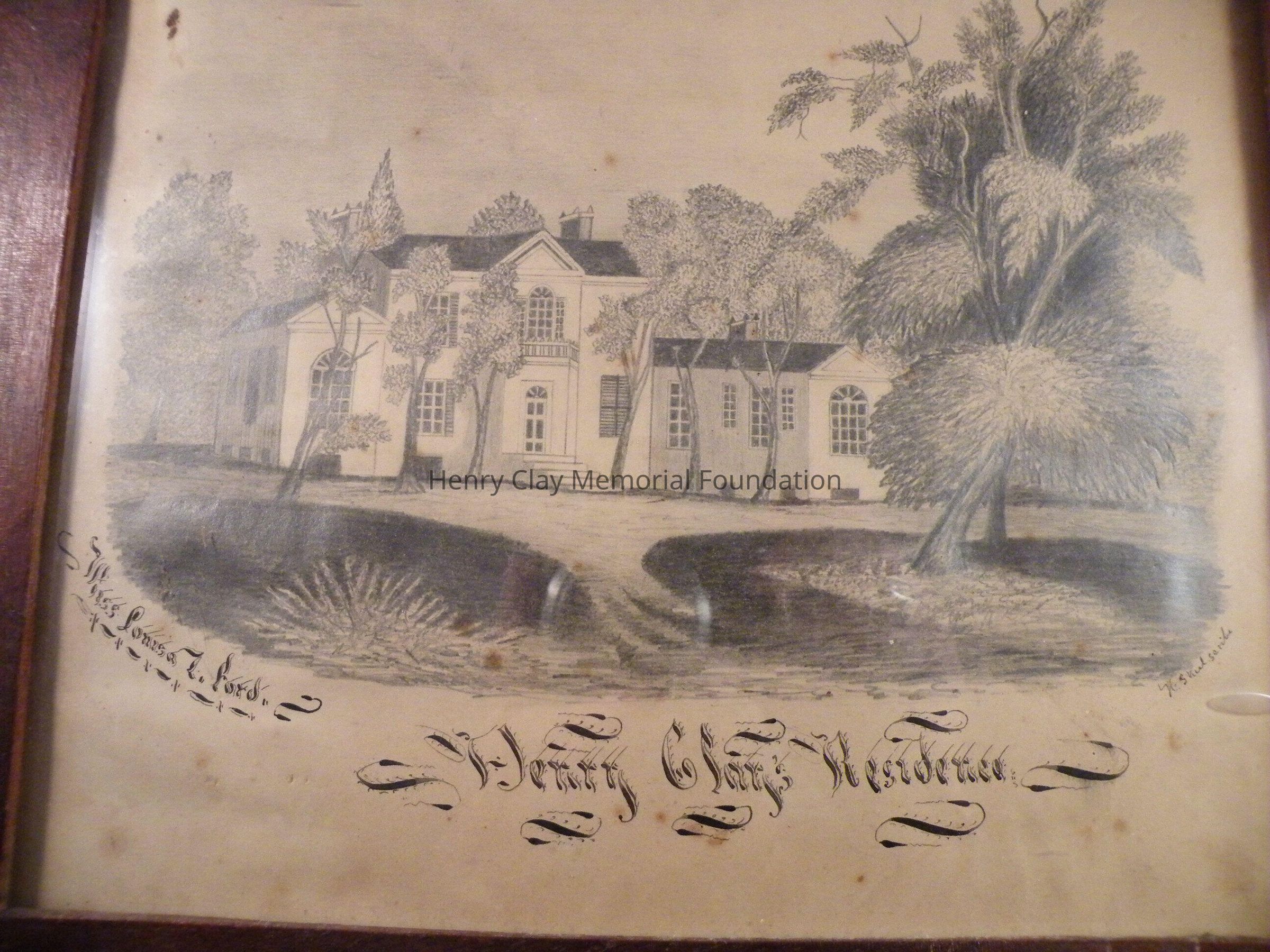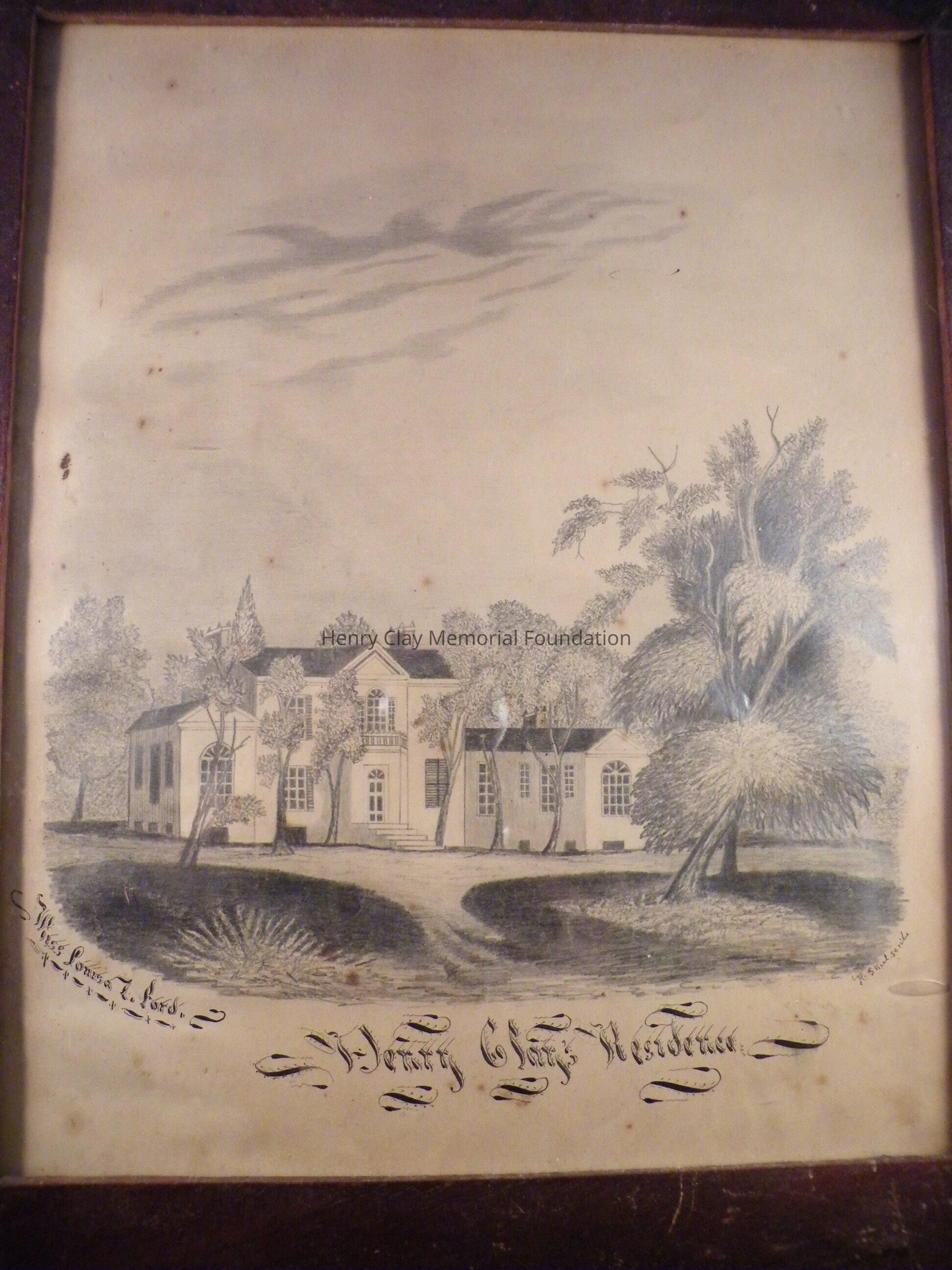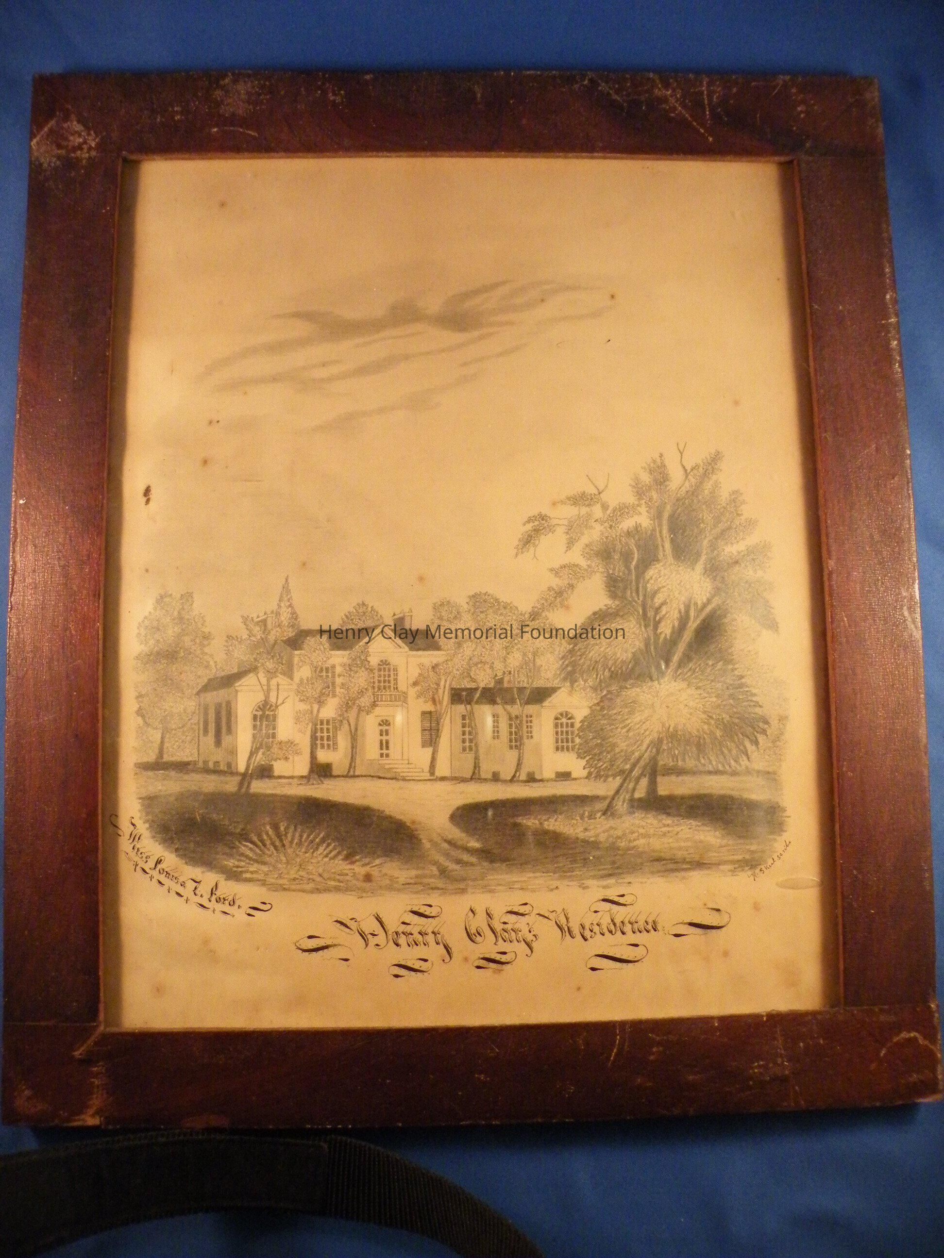 Pencil drawing of the original Ashland. The mansion is shown amongst trees. The picture is labeled in ink "Henry Clay's Residence". Below the picture at the left is the artist's name "Miss Louisa L. Ford". Below the picture at right is the signature of the Calligrapher "H.S. Keel Scribe". The picture is framed in a plain wood frame of the period of the picture.