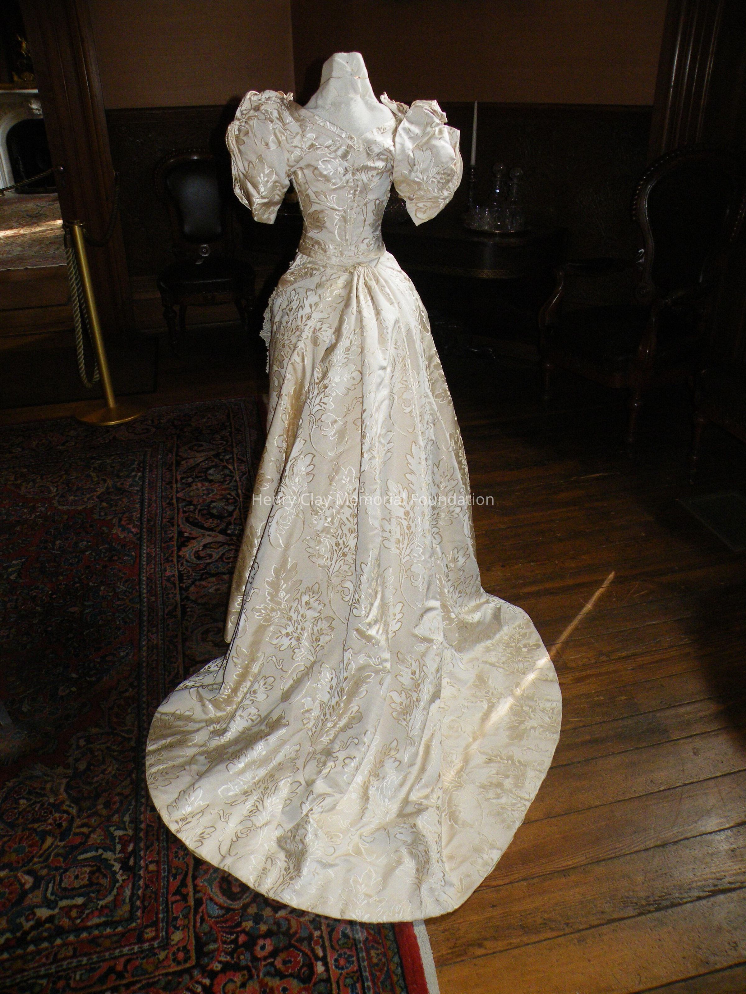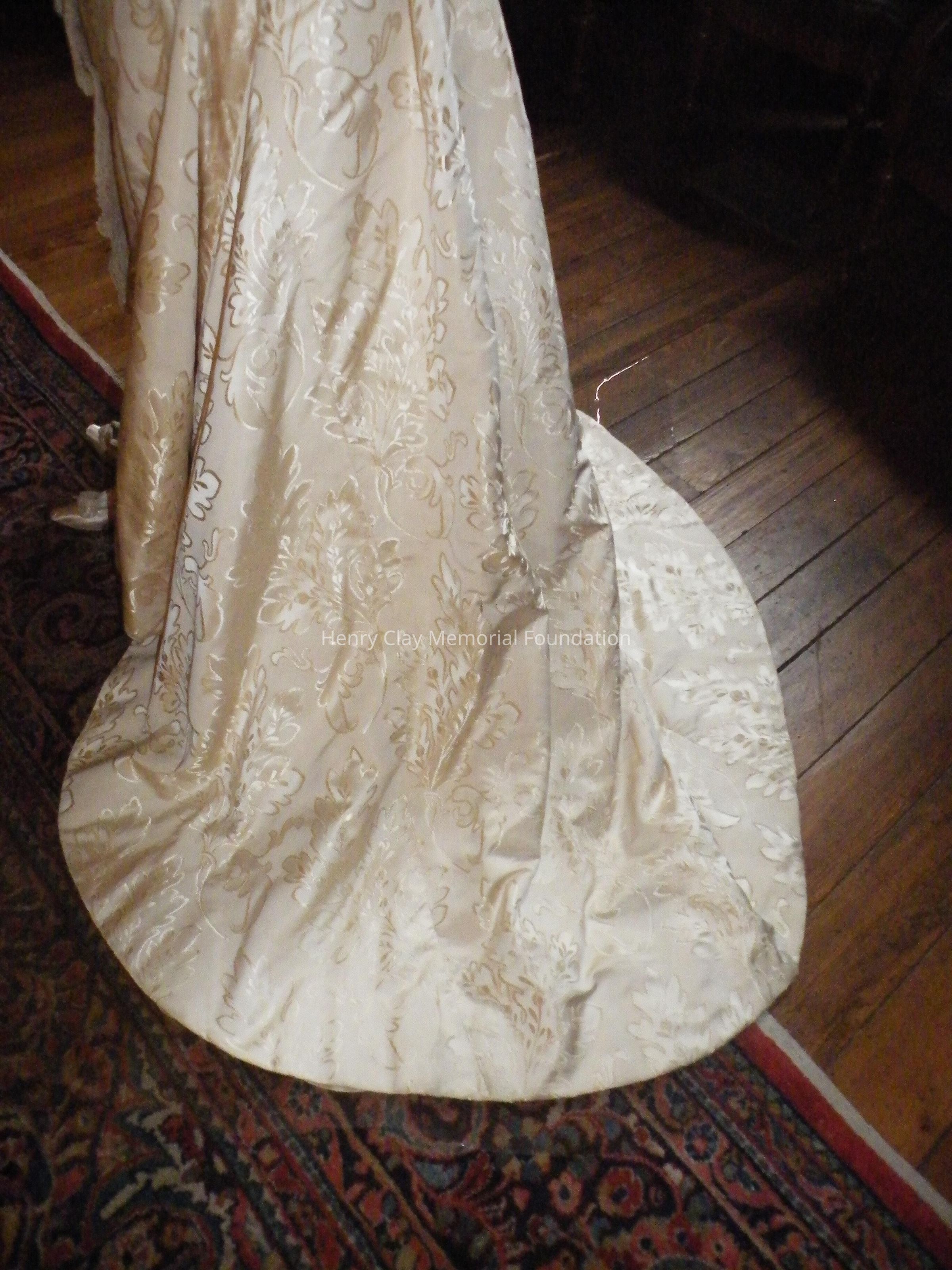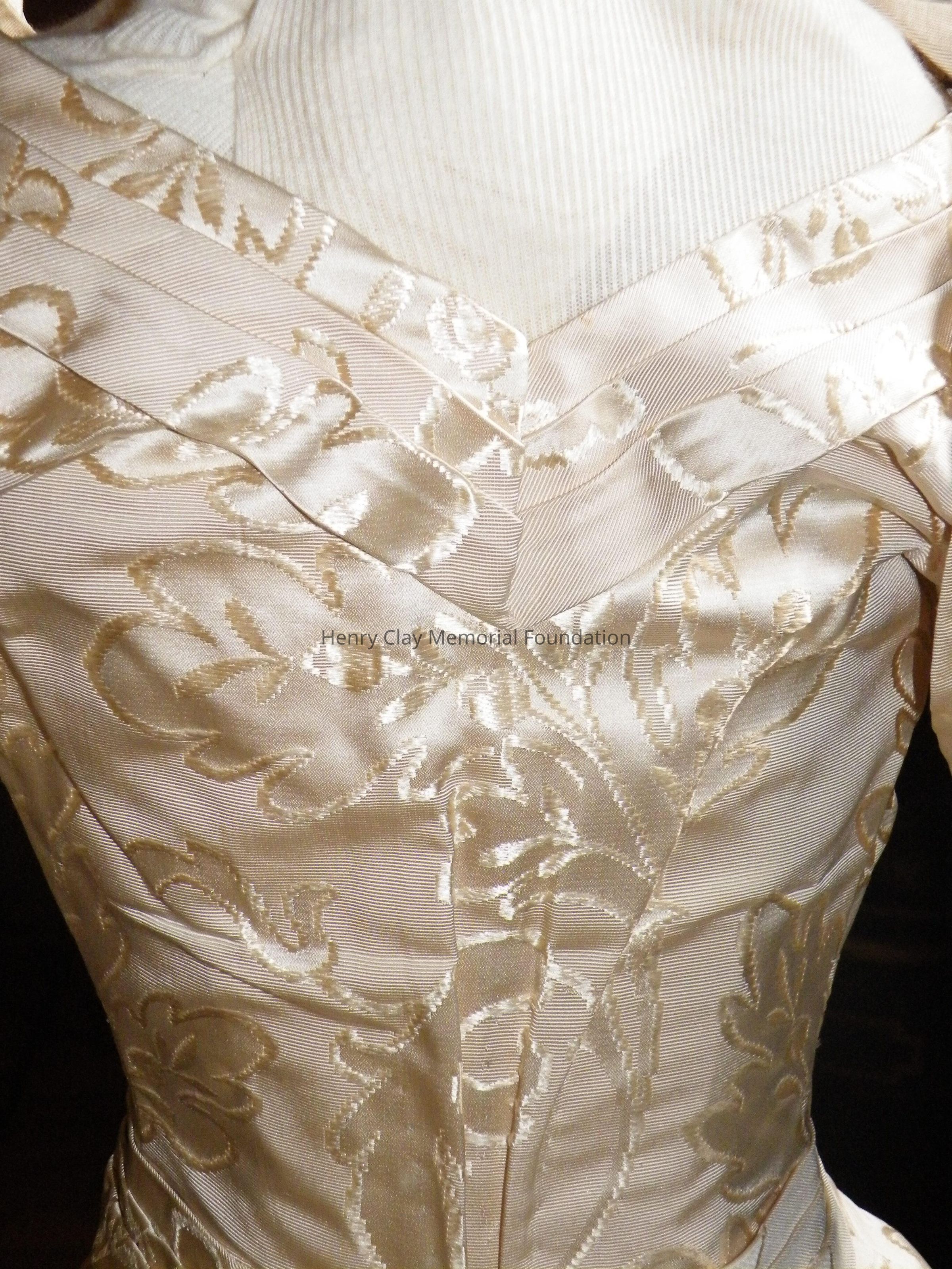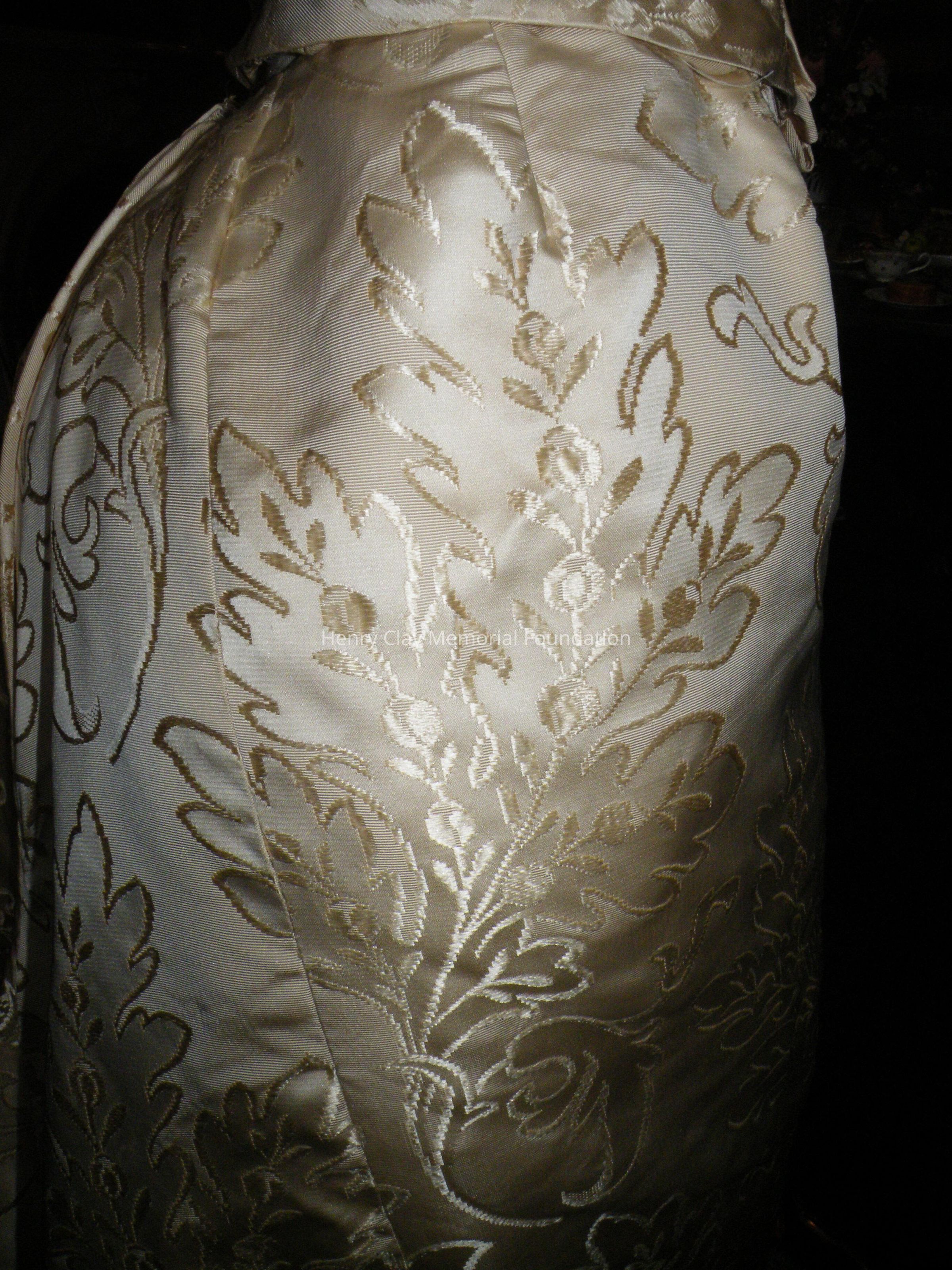 It is a two piece ivory brocade satin gown consisting of a top and a skirt with a design of stylized leaves. The top has short puffed sleeves and each shoulder has a three-cornered bow of satin. The bodice is low cut with a loose lace collar which is sewn on one end and attaches with eyes and hooks on the other side. The top portion of the gown clasps with non-visible hooks and eyes. The lace hangs asymmetrical down to the pleated waist where there is another three-cornered bow. The collar is tiered and V-shaped. There are stays sewn onto the inside of the top. The lace continues down one side of the dress and has four more three-cornered bows. The lace panel also goes around the front bottom of the skirt. A ruffle is sewn inside the skirt above the knees.Dimensions