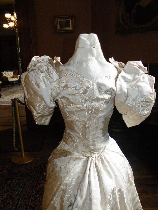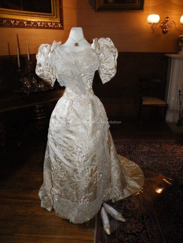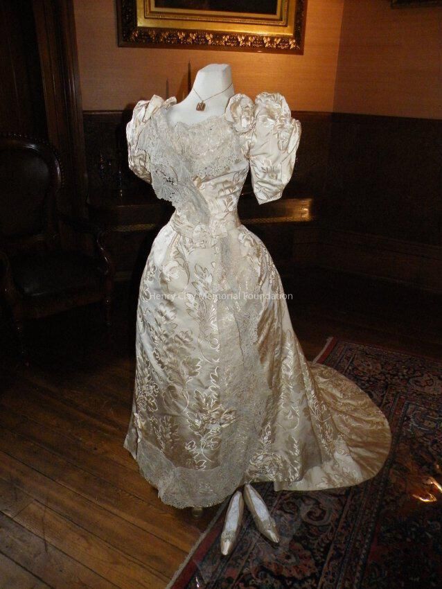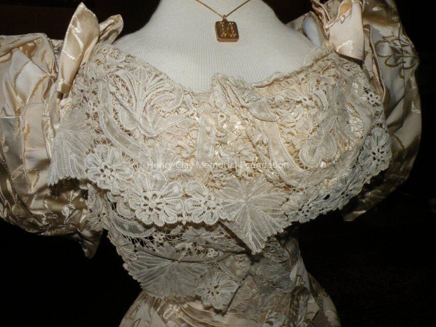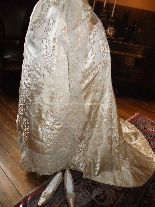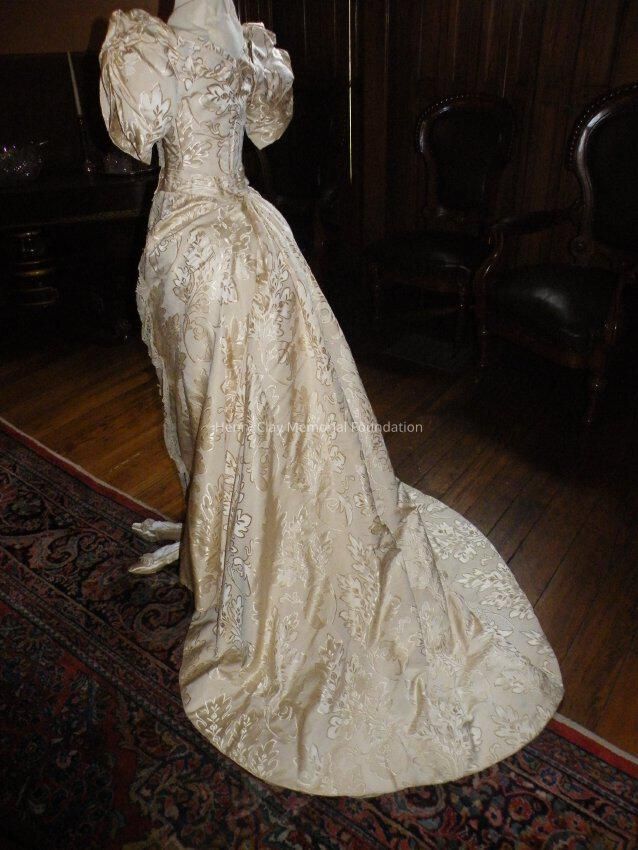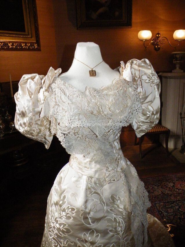 It is a two piece ivory brocade satin gown consisting of a top and a skirt with a design of stylized leaves. The top has short puffed sleeves and each shoulder has a three-cornered bow of satin. The bodice is low cut with a loose lace collar which is sewn on one end and attaches with eyes and hooks on the other side. The top portion of the gown clasps with non-visible hooks and eyes. The lace hangs asymmetrical down to the pleated waist where there is another three-cornered bow. The collar is tiered and V-shaped. There are stays sewn onto the inside of the top. The lace continues down one side of the dress and has four more three-cornered bows. The lace panel also goes around the front bottom of the skirt. A ruffle is sewn inside the skirt above the knees.Dimensions