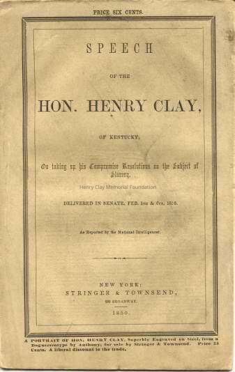 Titled "Hon. Henry Clay, of Kentucky, On Taking up His Resolutions on the Subject of Slavery." The speech consists of large folded sheets of printed paper bound by string and glue on the left side, the folds are still existent and do not allow for all the pages to be turned. At top of front cover is a price for 6 cents; at the bottom is an advertisement for a Henry Clay steel engraving from a dagguereotype by Anthony for 25 cents.