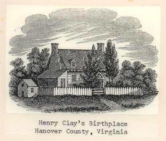 Laminated drawing, depicts Henry Clay's birthplace in Hanover Co, VA.