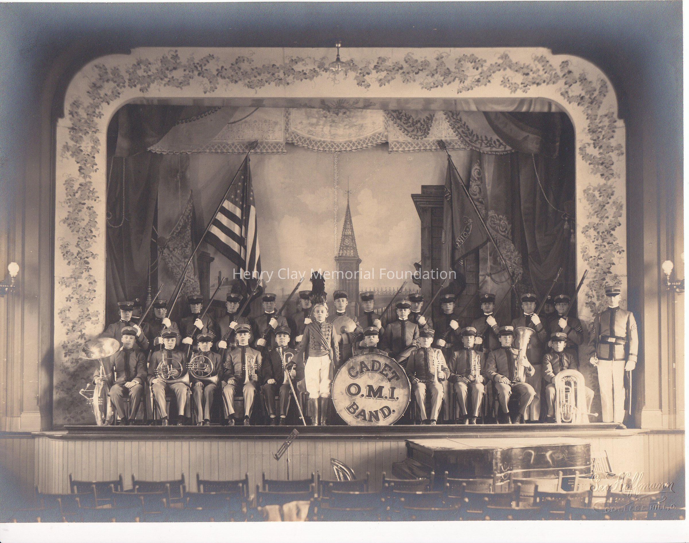 A black and white photograph of a band composed of children. In the center a drum with " Cadet O.M.I Band" wrote on it. The first raw composed of children with instruments, the second raw composed of men holding a rifle.Dimensions