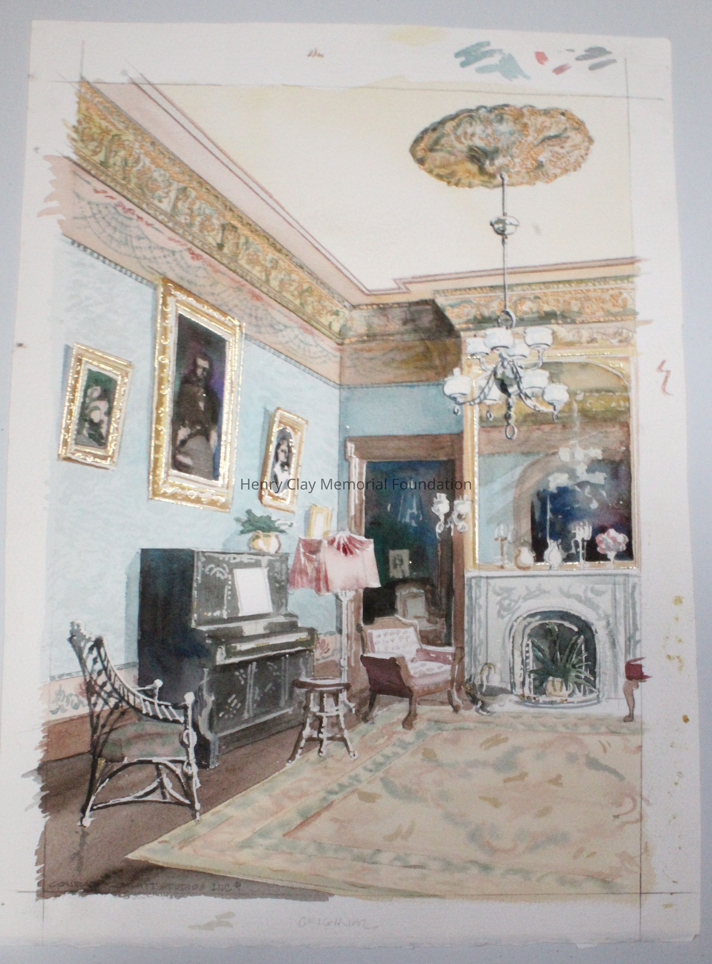 Painting of late Victorian parlor with three chairs, a lamp and a piano. There is a chandelier hanging from the ceiling and a fireplace on the back wall. There is an oriental rug on the floorDimensions