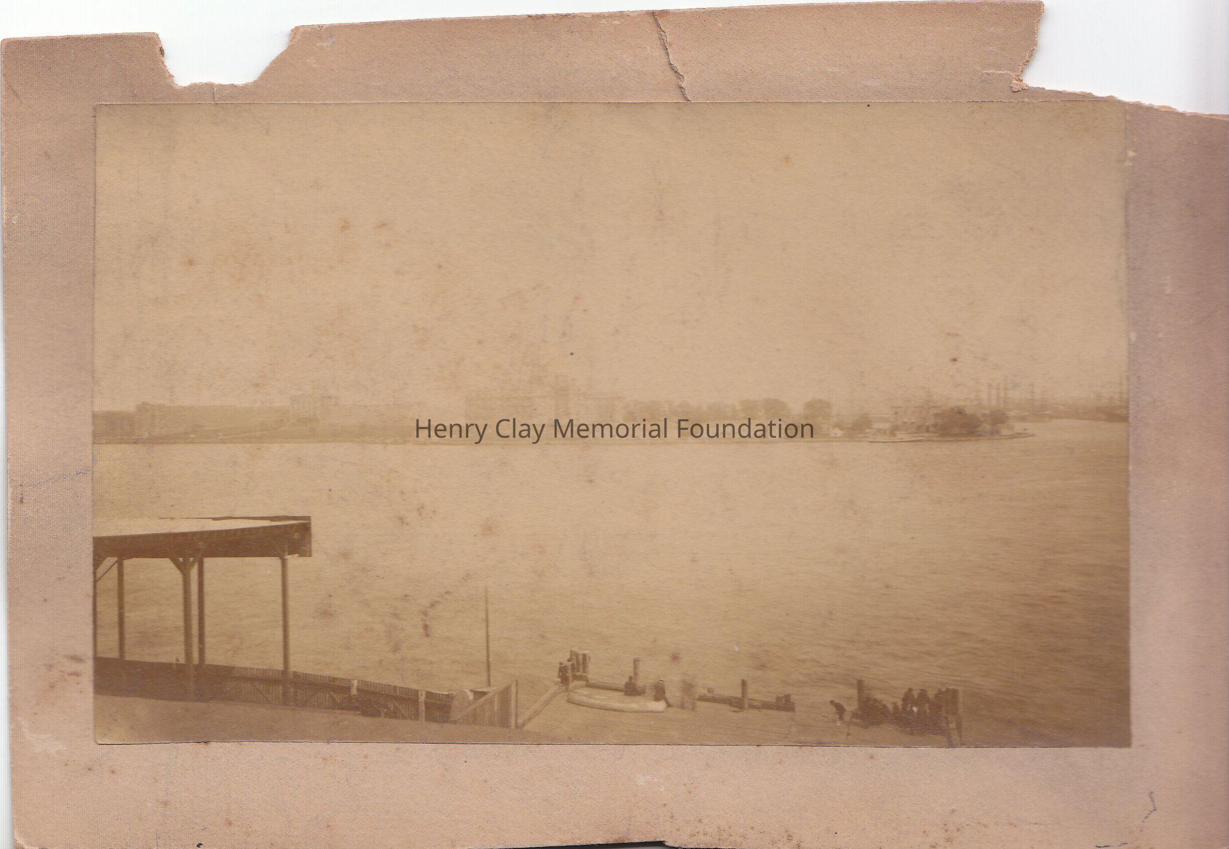 A black and white photograph of a river with few people on a pier. A city can be seen on the other side of river.