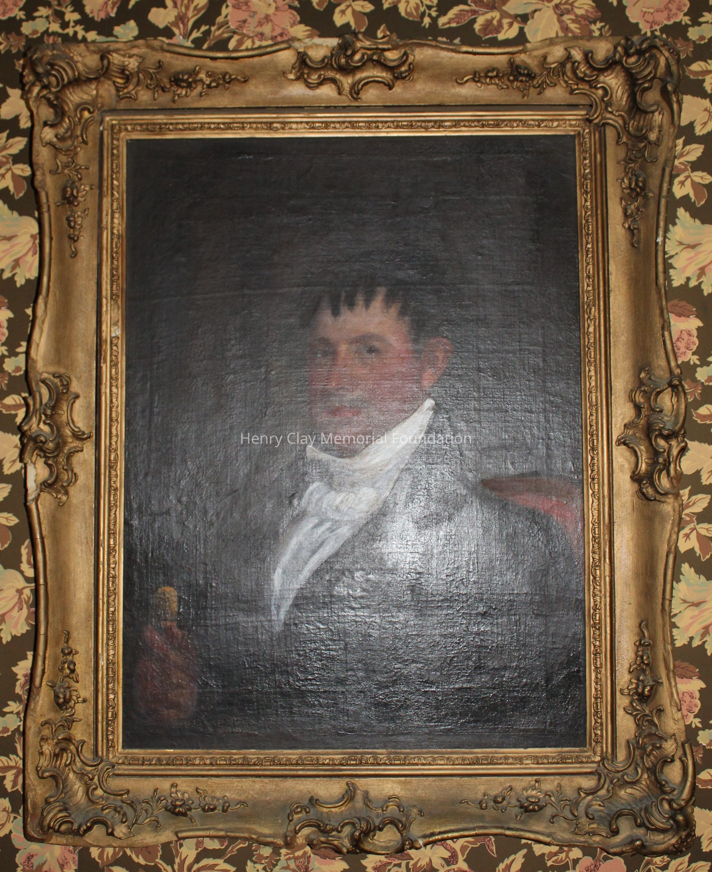 This portrait is of a man in a black coat, white shirt, and white cravat. His right hand is visible and in it he is holding a cane with a gold knob. The portrait is framed in a gilt gessoed Rococo frame. The man's hair is dark and cut into a jagged hairline. The man is seated in a dark wood chair with rose colored upholstery.Dimensions