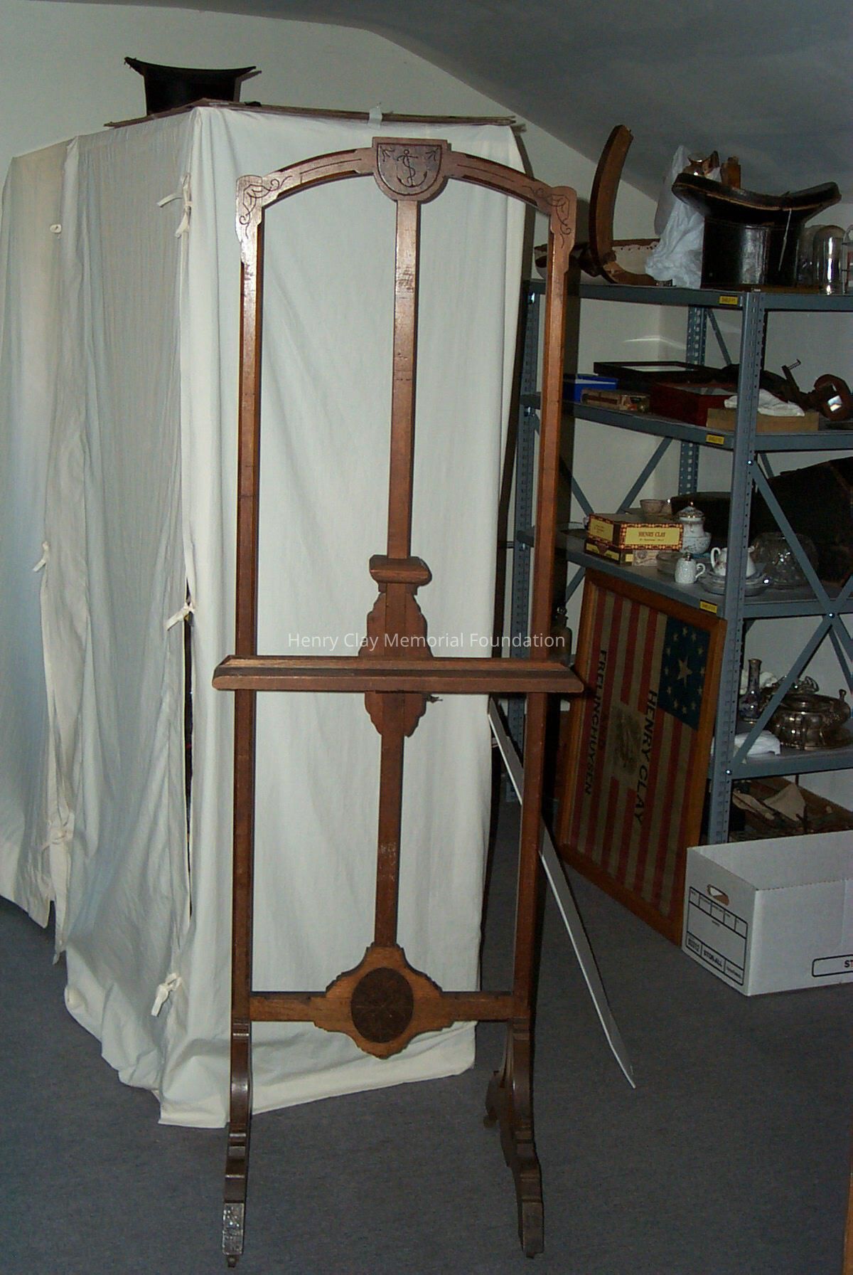 Split, three-slat stand with narrow horizontal tray across the center, which can be adjusted vertically on the center slat by loosening and tightening a screw on the back. There is also a slide on the center support to drop over the top edge of flat art resting in the tray. The easel has incised decoration on the front upper corners and an incised anchor design in the center upper medallion. There is also an incised design on a lower oval medallion. The easel has a split base with the legs extending front to back with castors on each corner.