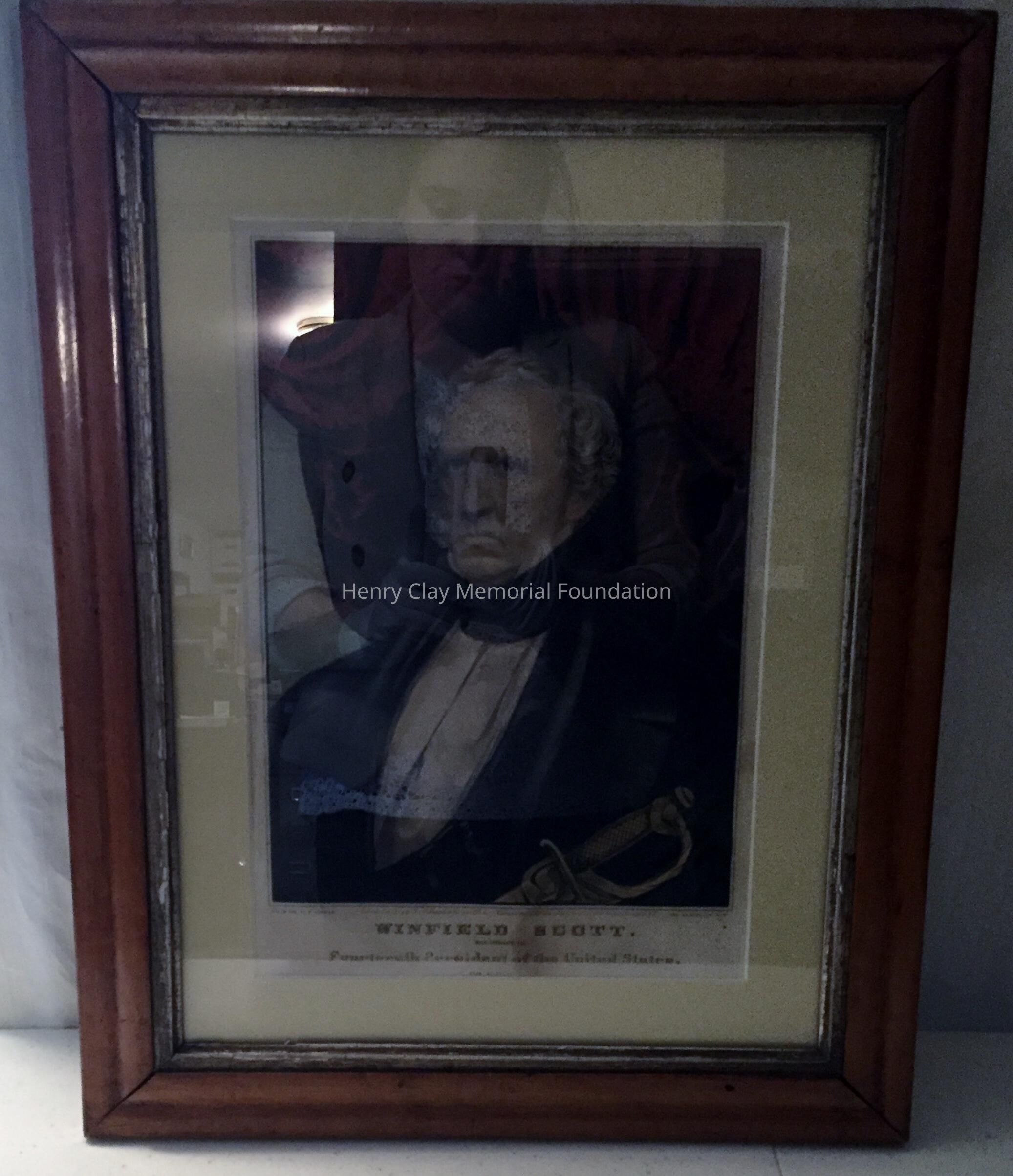 Engraving features a portrait of Winfield Scott. Beneath the portrait is the credit: "Lith & Pub. by N. Currier" and the notes: "Entered according to Act of Congress in the year 1852 by N. Currier in the Clerk's office of the District Court of the Souithern District of N.Y." and the address: "152 Nassau St. N.Y." Beneath that is the title: "Winfield Scott./ Whig Candidate for/ Fourteenth President of the United States./ from daguerrotype." Engraving is hand colored and framed.Dimensions