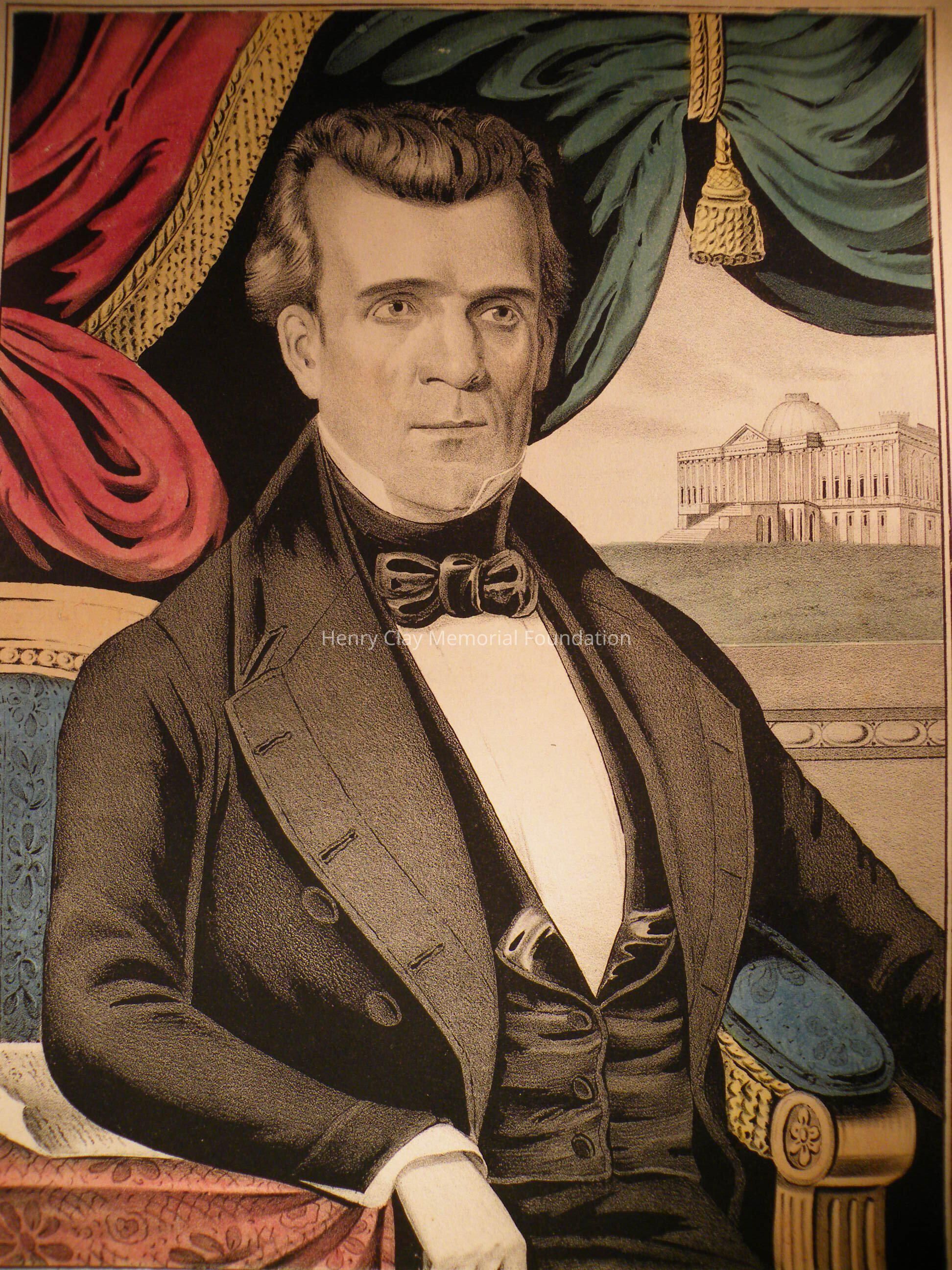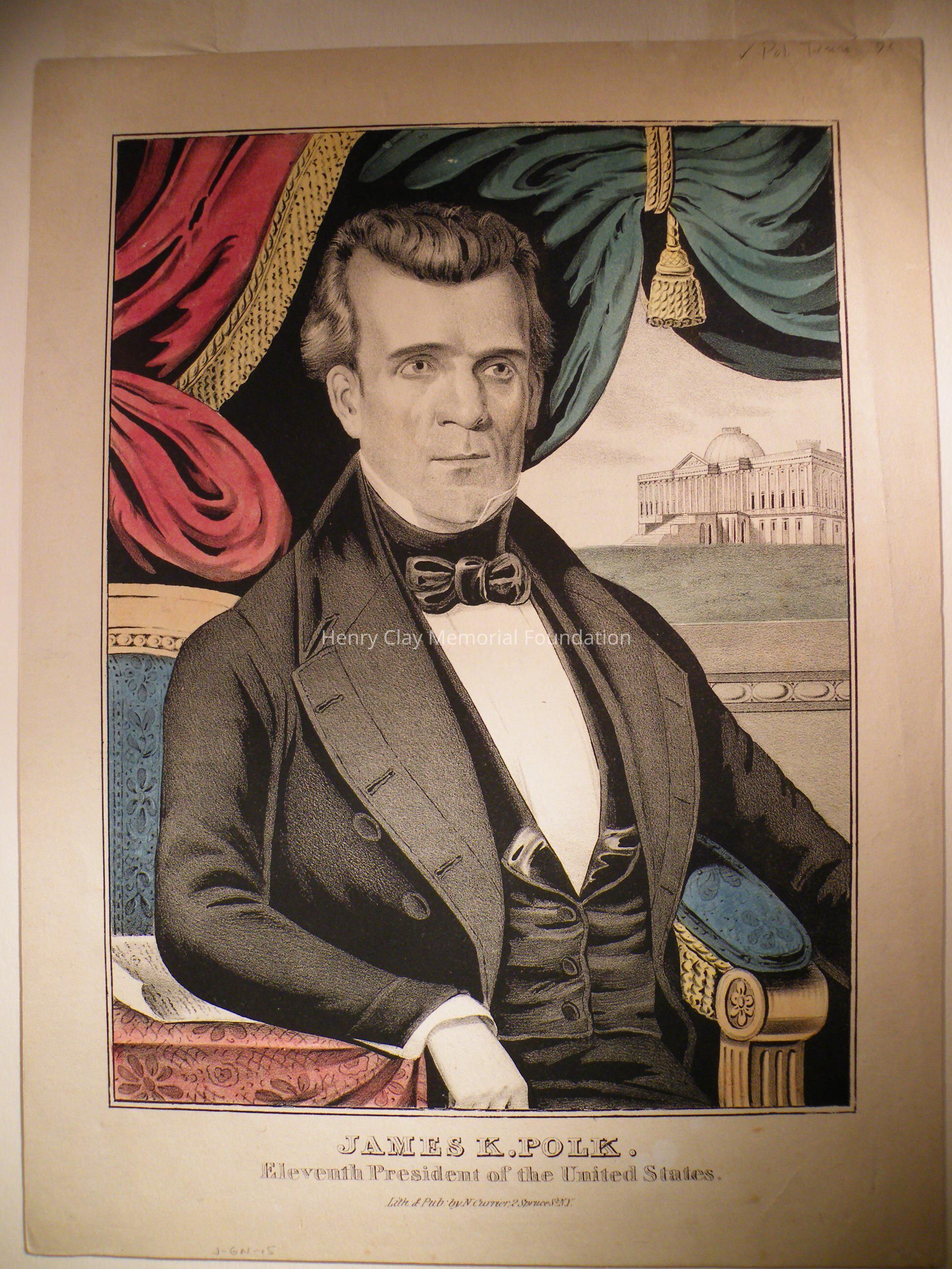This engraving features a portrait of James K. Polk. Polk is pictured sitting in a chair, framed by drapery, and with the Capitol (pre-completion) in the background. Beneath the portrait is the title: "James K. Polk./ Eleventh President of the Unites States." Beneath the title is the credit: "Lith & Pub: by N. Currier, 2 Spruce St. N.Y." The engraving has been hand colored. The engraving is contained in an archival matboard portfolio.Dimensions