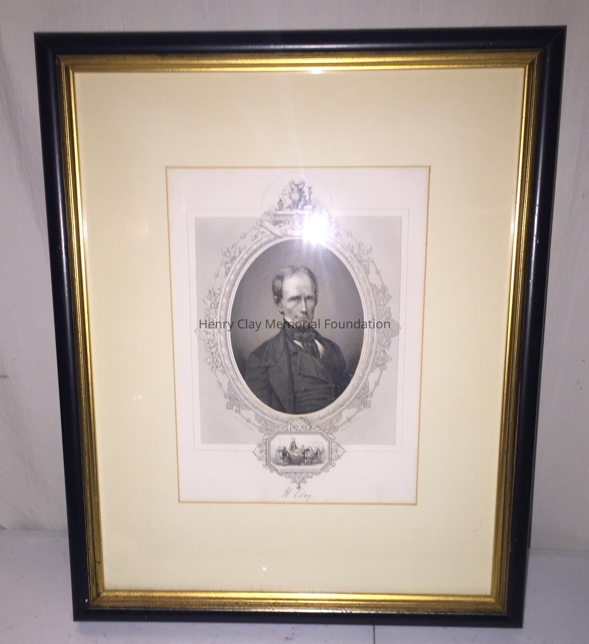 Intalgio of Henry Clay inside decorative oval frame with vignette at top of urn, bust of woman, books, etc. Under written: "Science / Arts / Manufacti..." Vignette at bottom depicts men seated around table, one standing with words "Peace negotiations at Ghent" underneath. Left side under picture: "Engd. by W. J. Edwards." At bottom, copy of Henry Clay's signature.