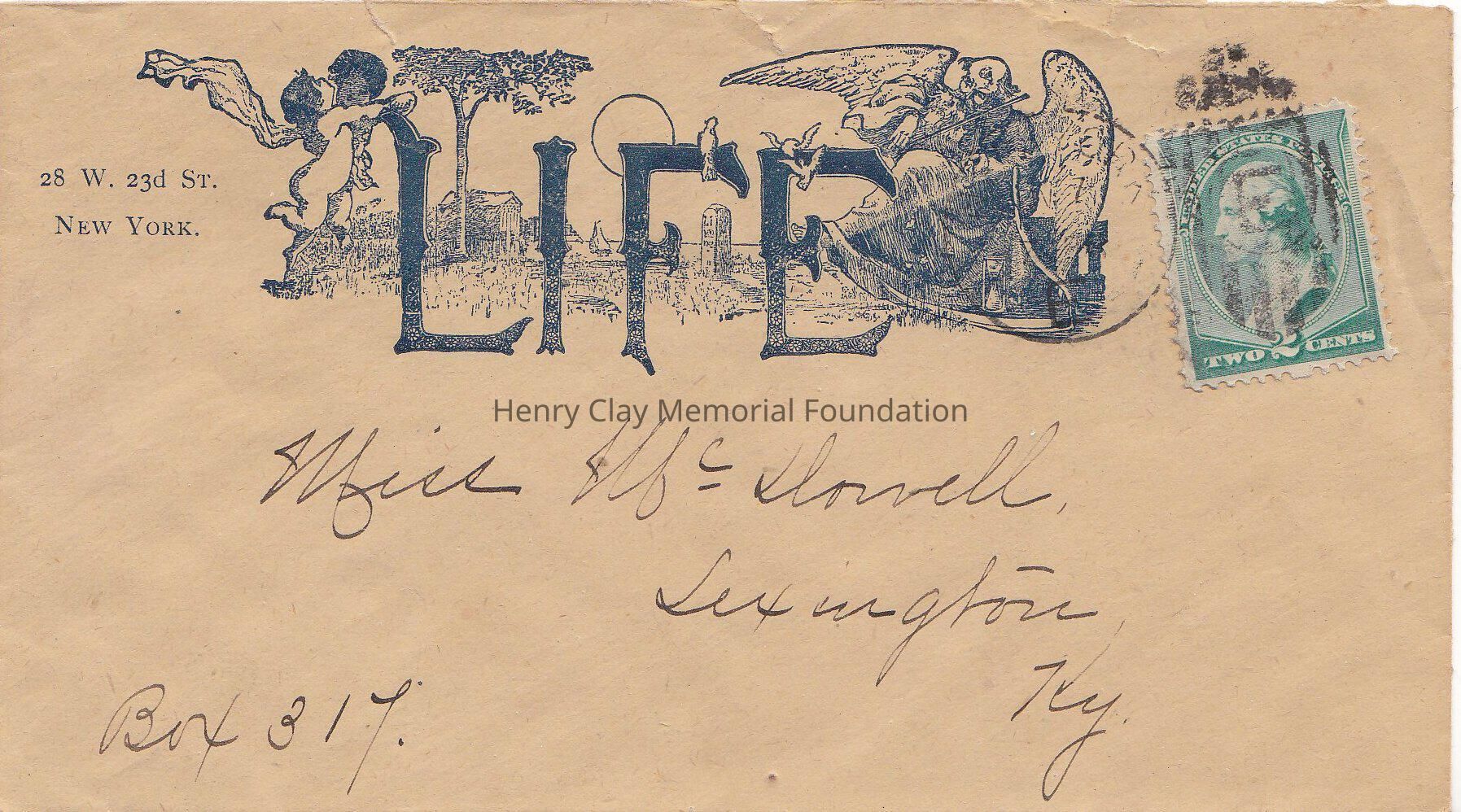 An envelope stamped for two cents. On the top center a stamped drawing of two angels, one on each side of the word LIFE. Behind in the background trees, houses, the sun and ocenan. Next tow writing on the top left " 28 W.23rd. St. New York." The envelope is adressed to " Miss McDowell, Lexington, KY.