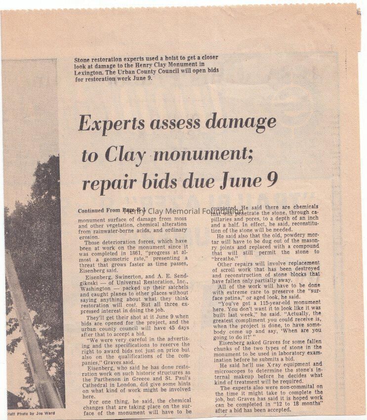 A newspaper clipping from the Courier-Journal about the restoation of the Henry Clay Monument. The experts established that the repairs will be done by june 9.