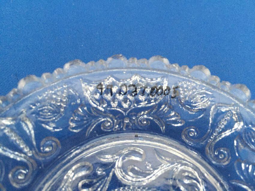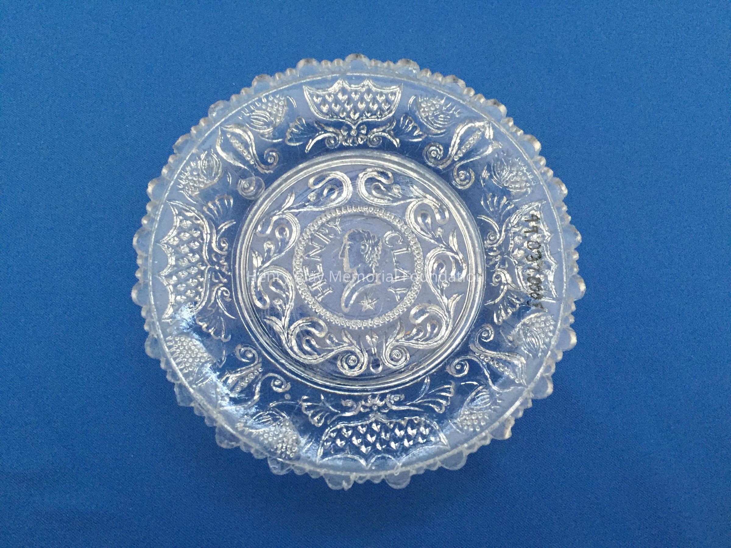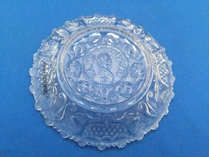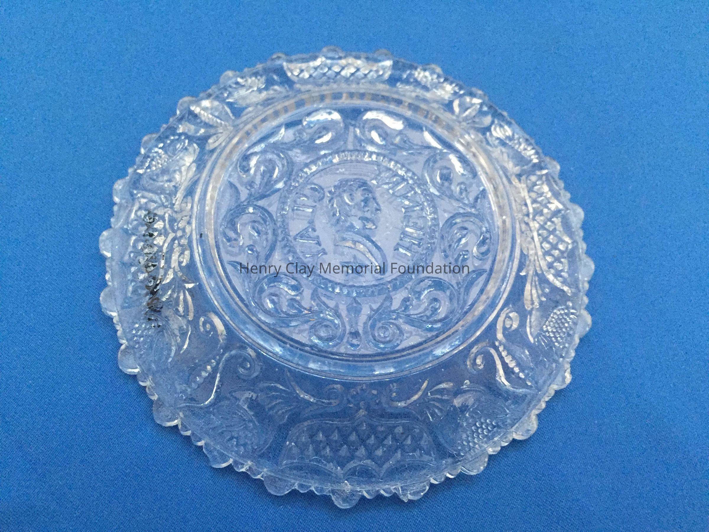 Clear pressed glass with a bust of Henry Clay, left profile, in the center. Bust is flanked by the words "Henry Clay." A single star is beneath the bust. Designs in an outer circle surround Clay. Scalloped edge on the outside, one large scallop followed by two small scallops is repeated.Dimensions