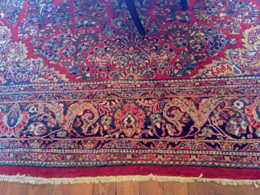 Typical floral blossom design with meandering vines. Prominent colors in shades of red and blue.