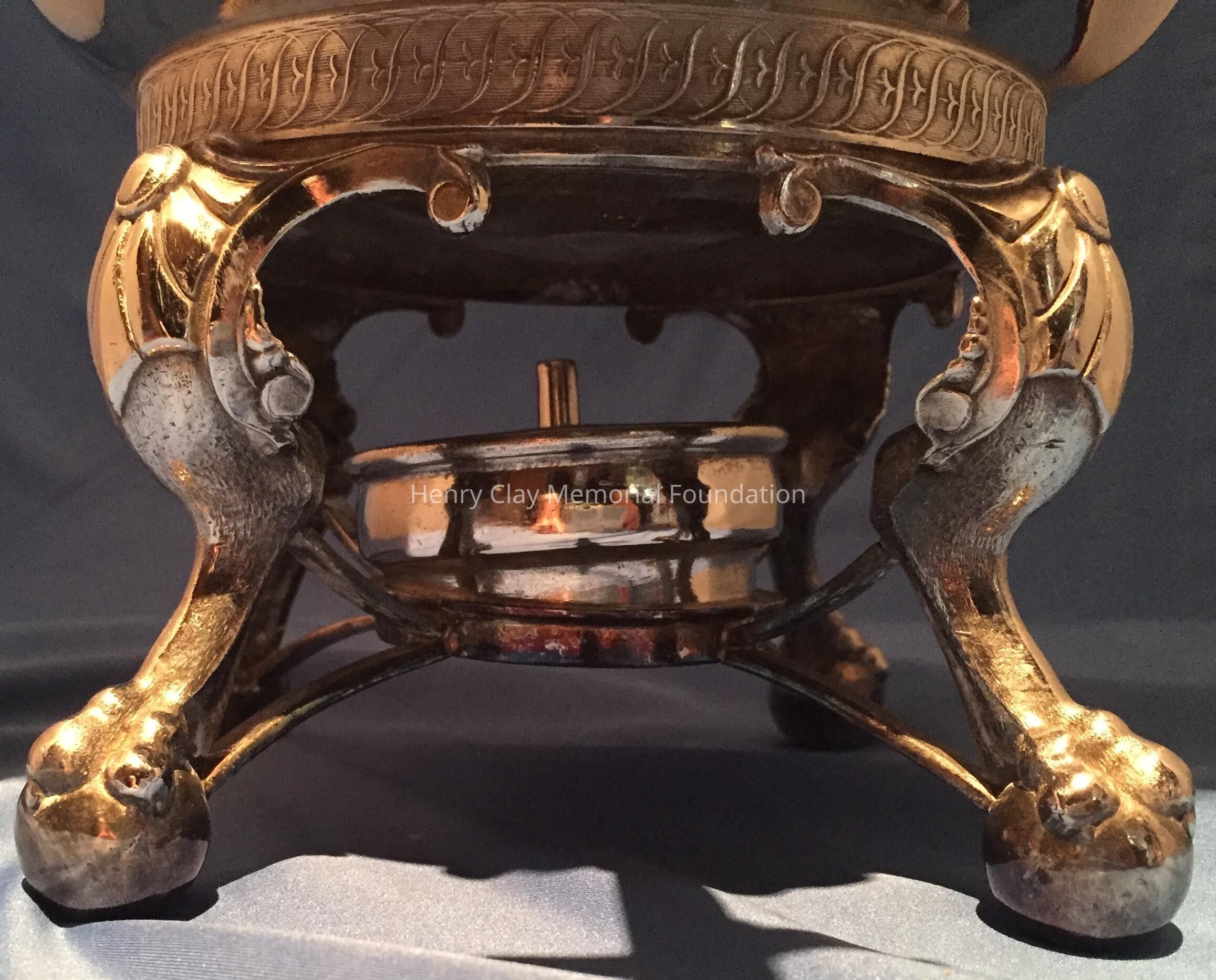 Silver plated coffe/tea urn with burner. Two dog heads hold wooden dowels to act as handles. The spout also has a wooden handle and protrudes from a lion's head; the four legs of the urn are designed as lion's paws and have cross bars to accommodate the burner. A pelican is on top of the lid. Marked on the bottom, "Eureka -- PATd -- 1382 -- 888."