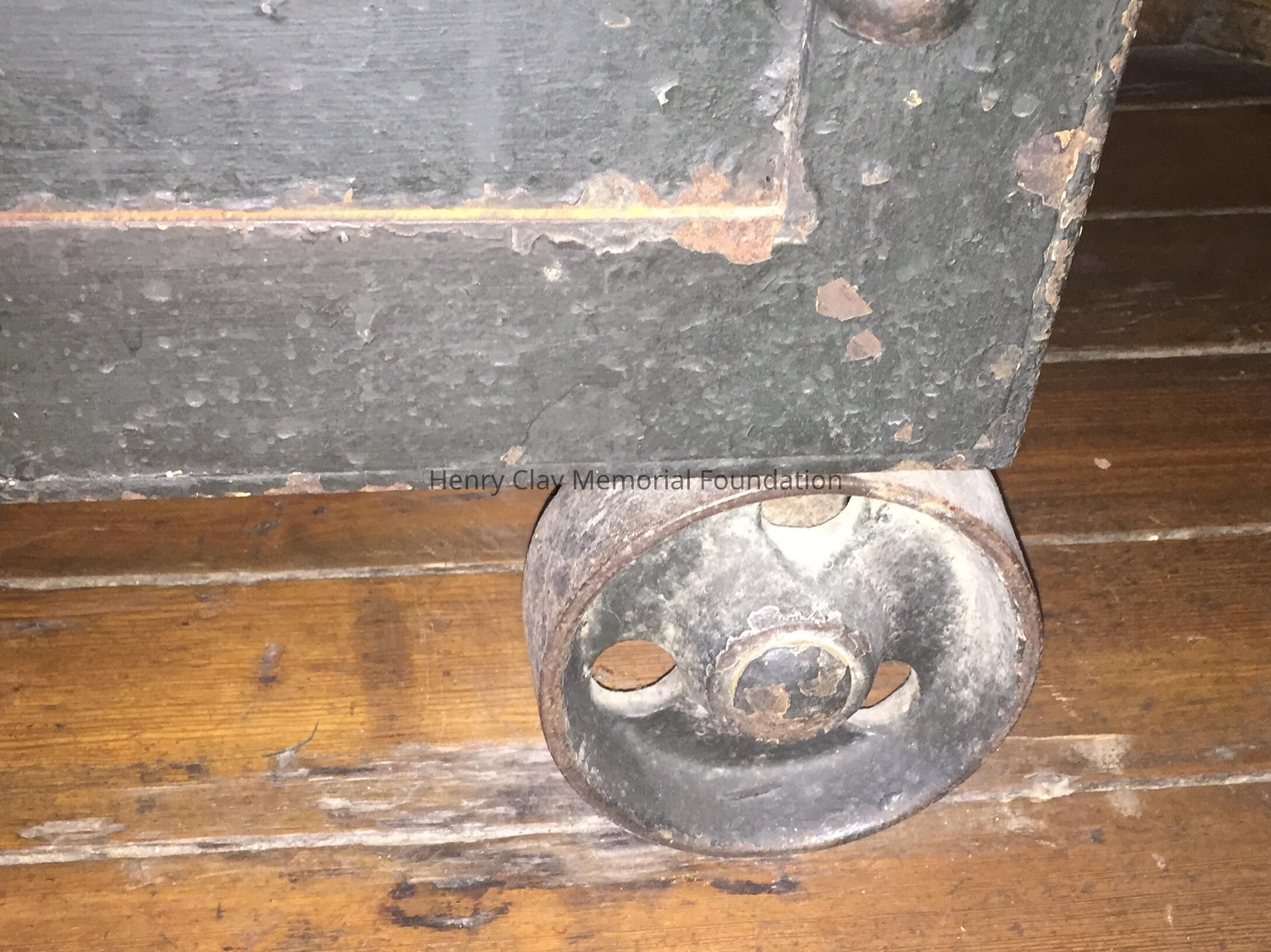 Large safe, painted black. Ring Handles on either side. Door has visible hinges protruding from the right front, a brass knob, brass lock cover, and broken key inserted into lock. Safe rests on four wheels. A brass plate on door reads, "Wm. C Barr / successor to / Lippincott & Barr / No. 127 SE Cond St. / Pittsburgh Pa."Dimensions