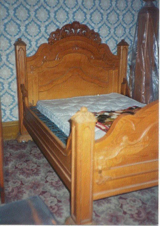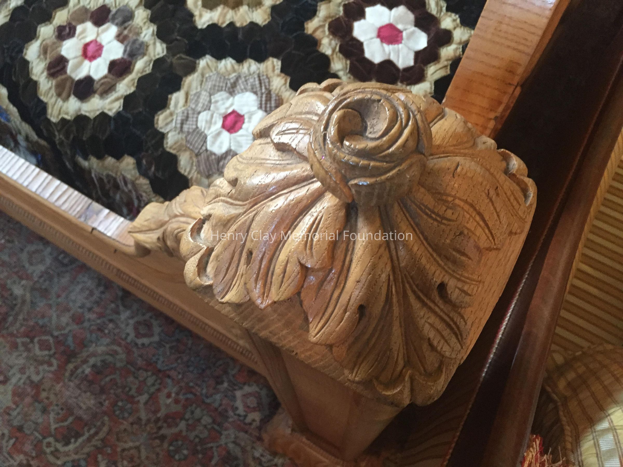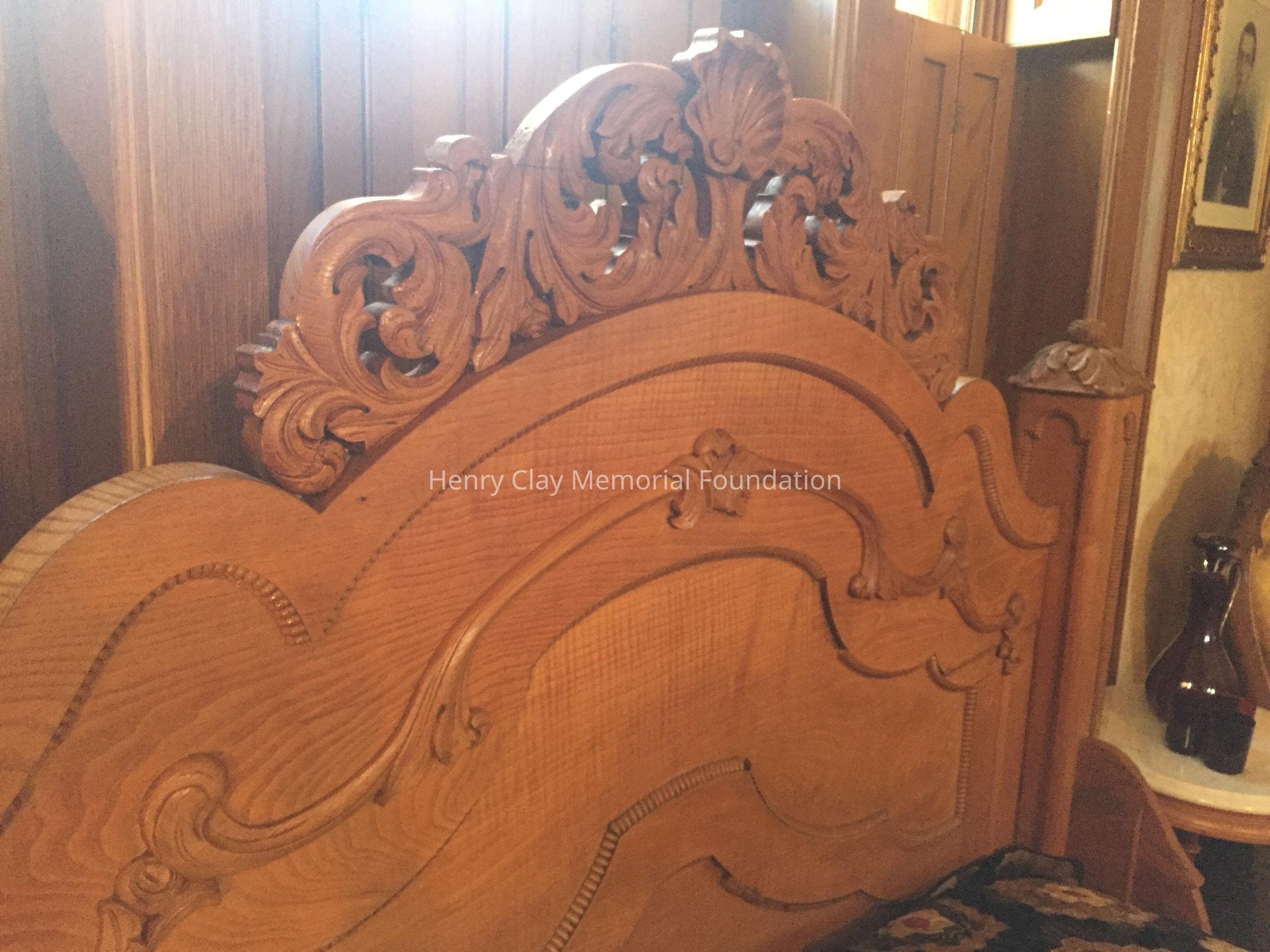 Ash, ornately carved with four rectangular posts topped by carved flowers and a high carved headboard.