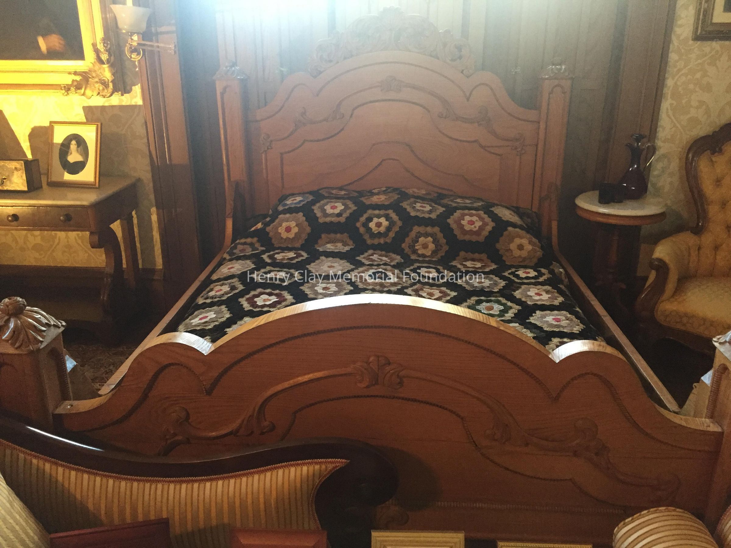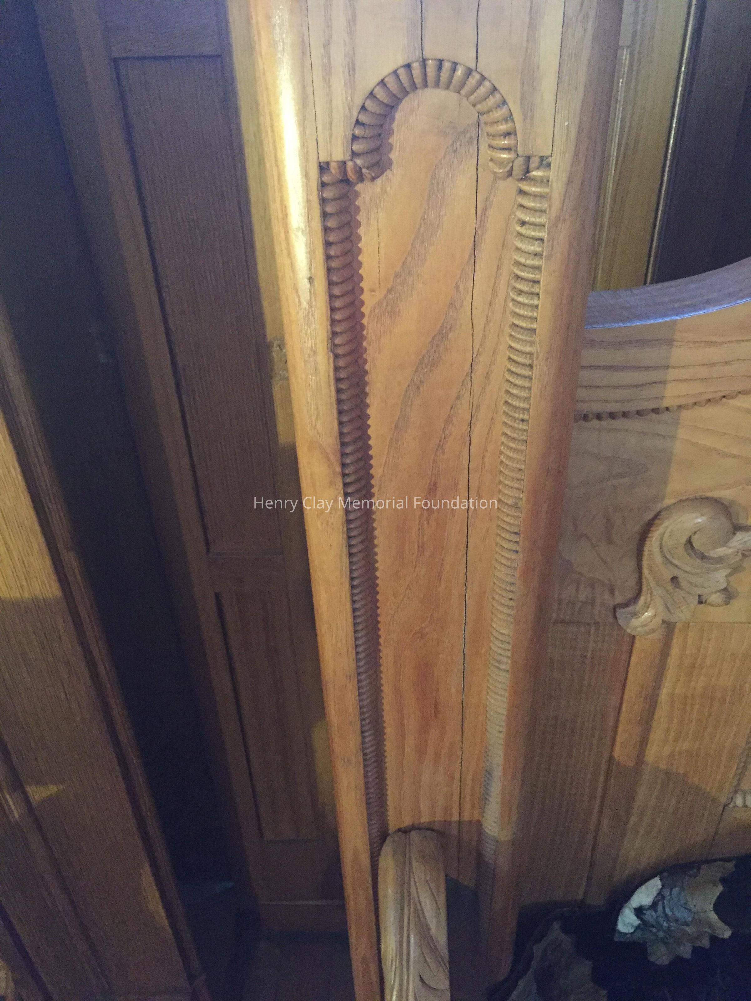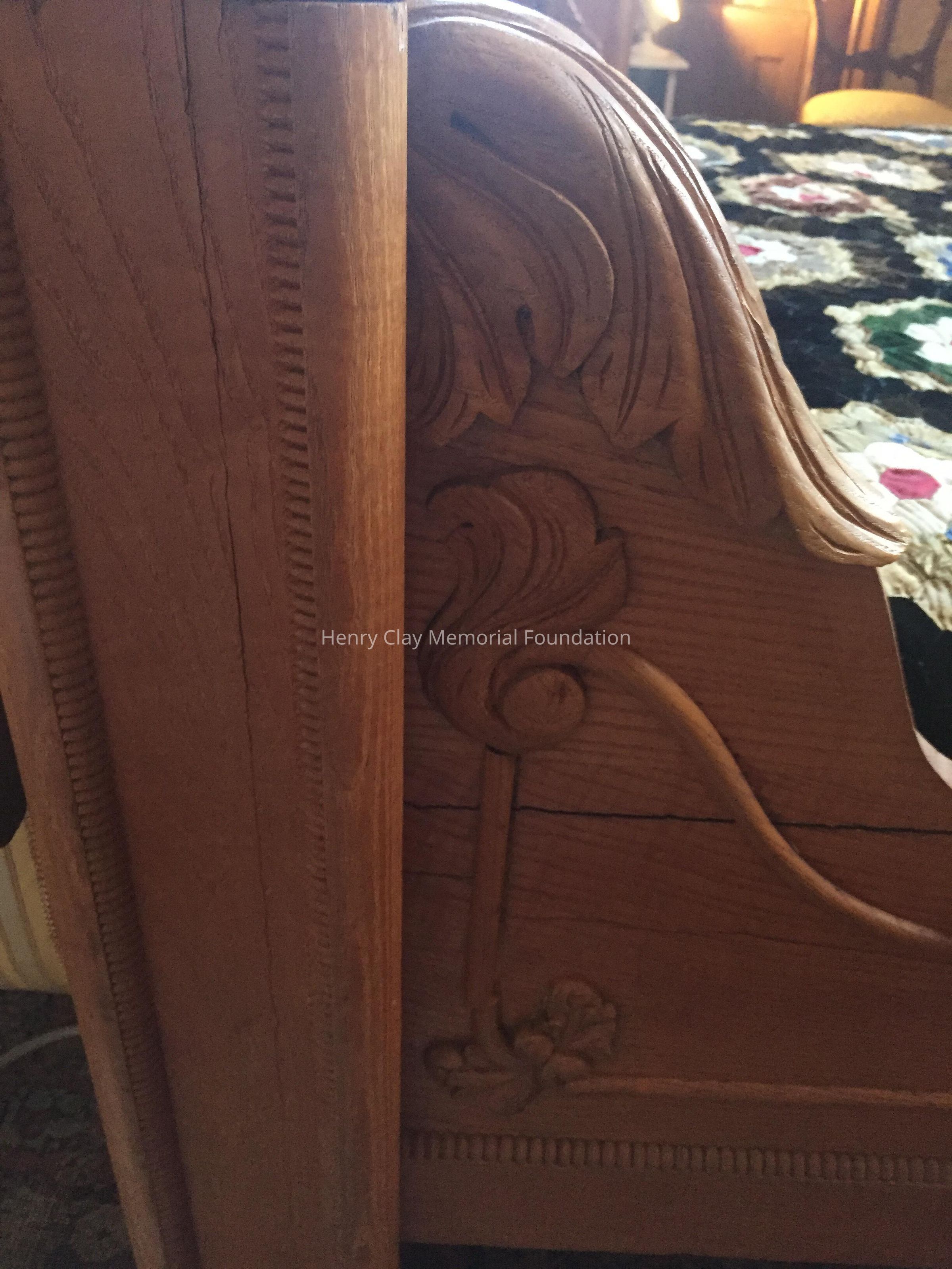 Ash, ornately carved with four rectangular posts topped by carved flowers and a high carved headboard.