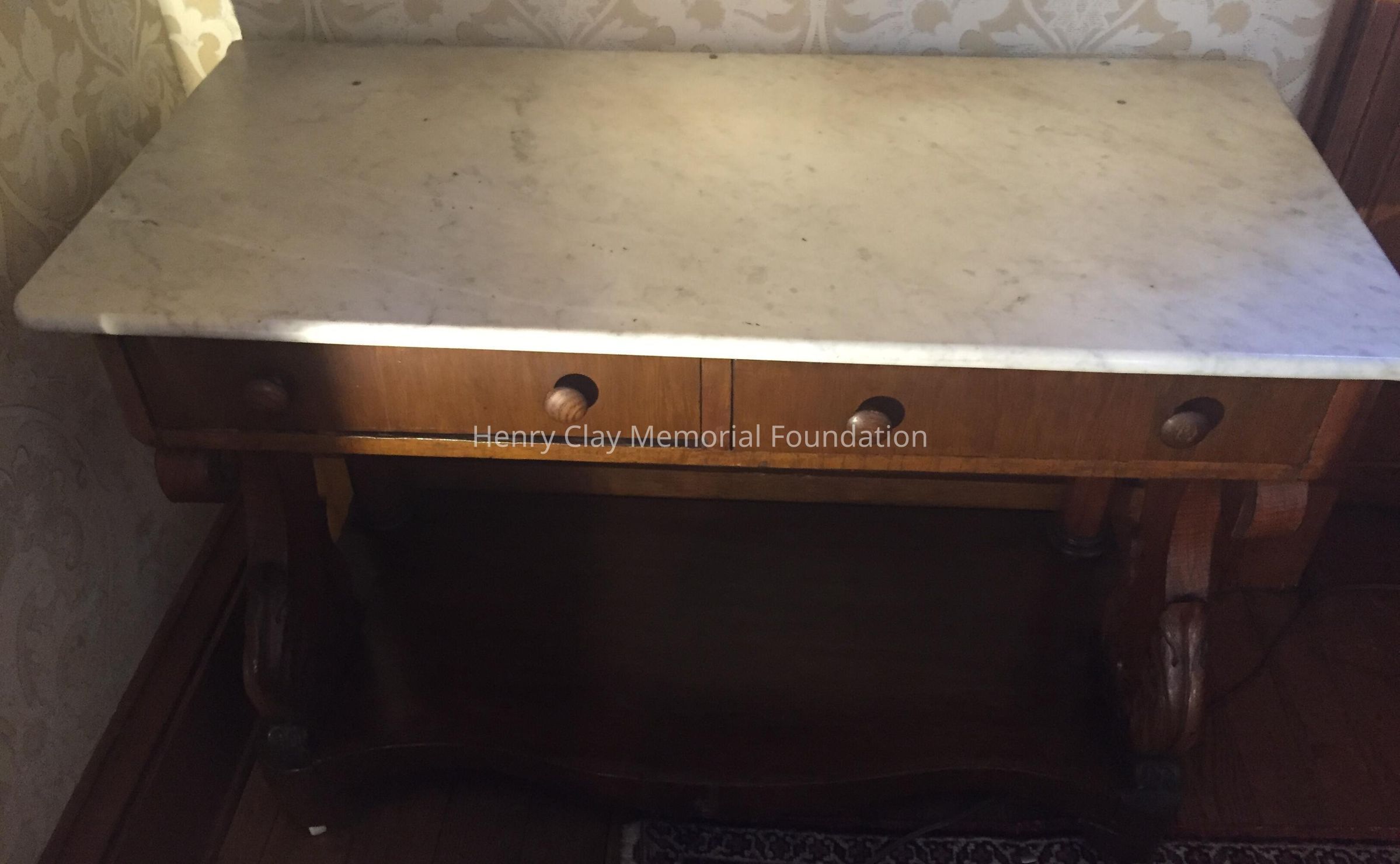 Ash, with marble top and bowed front bottom shelf. 2 drawers.
