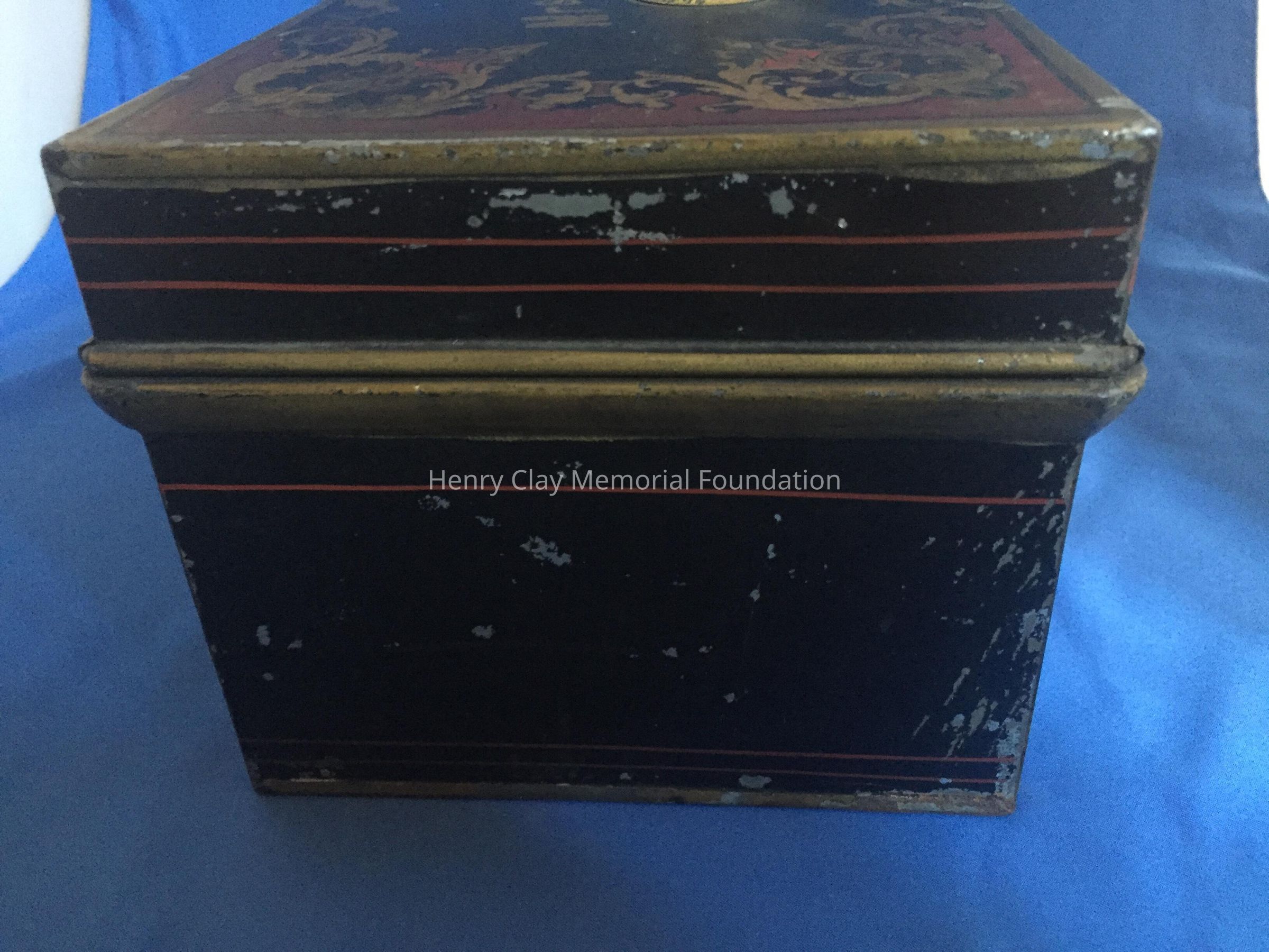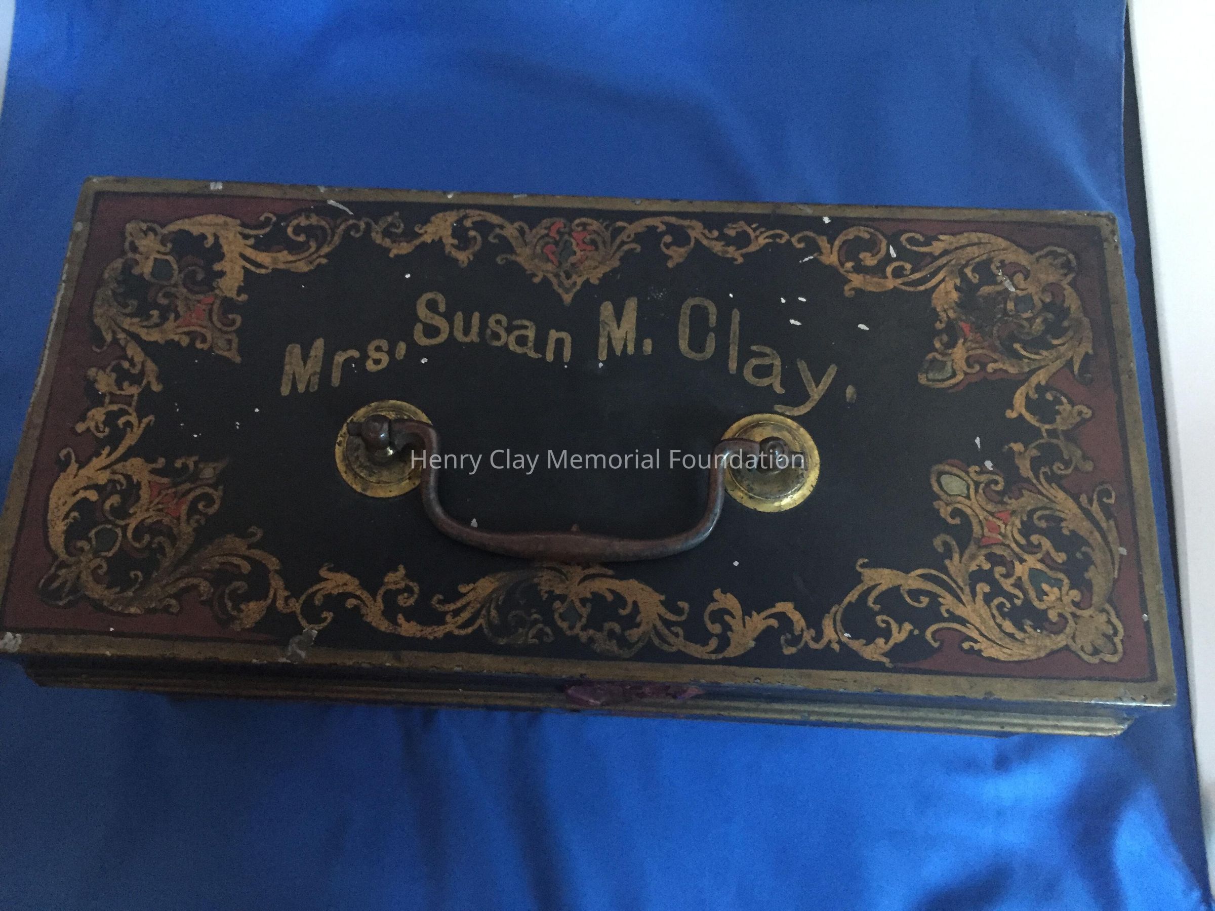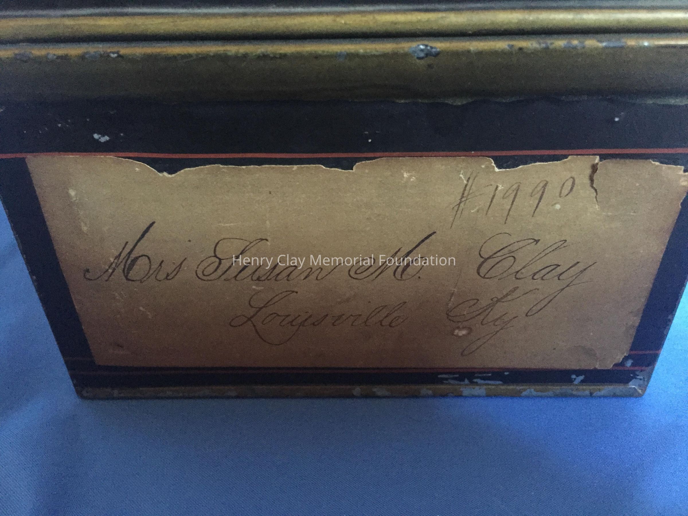 Metal letter box painted black, red, and gold. Painted on the lid: "Mrs. Susan M. Clay." Two red wax seals on front "The Adams Express 1004 Lexington." Also has a paper label on one end inscribed: "Mrs. Susan M. Clay, Louisville, KY." She was the wife of James B. Clay.