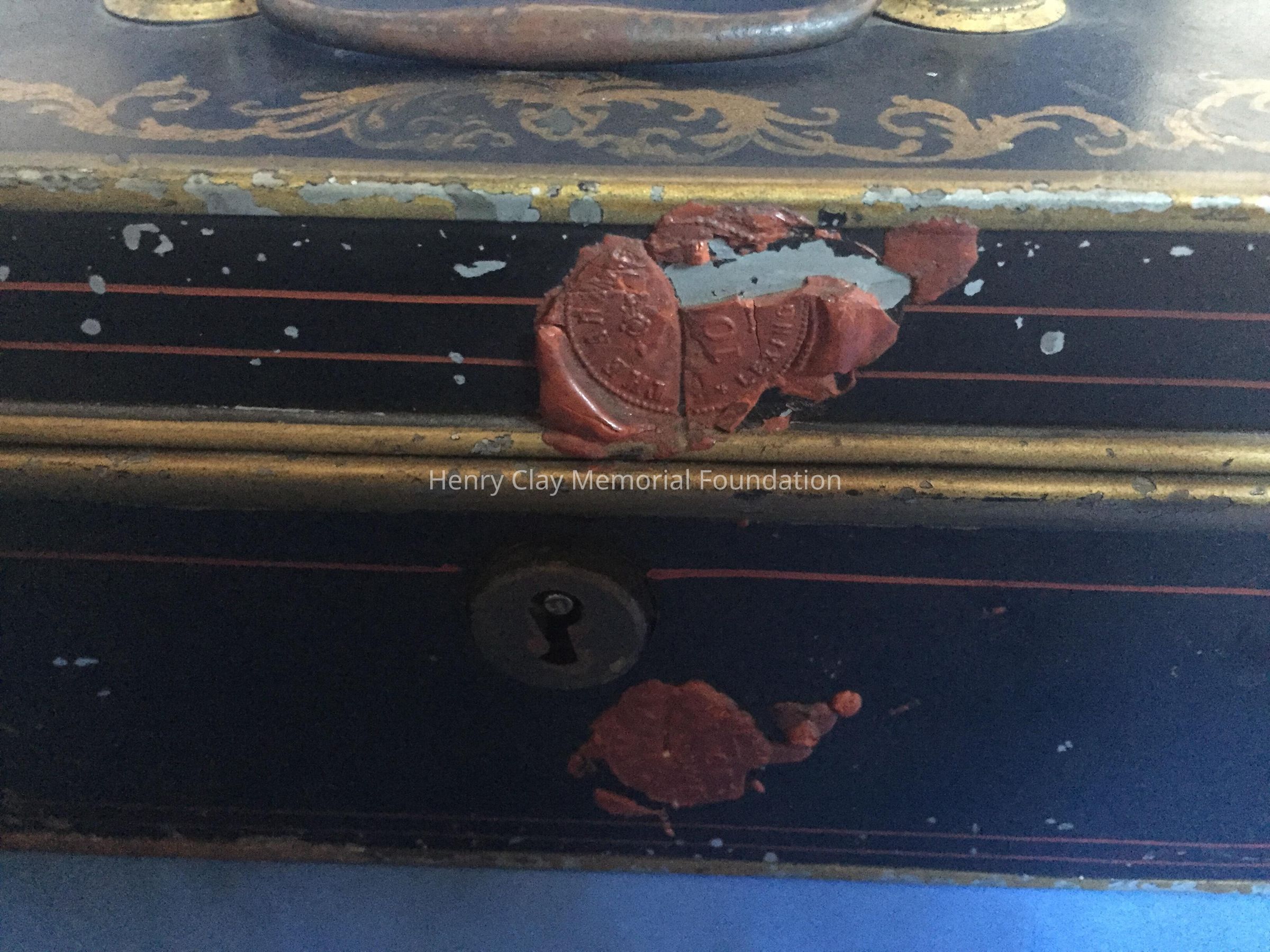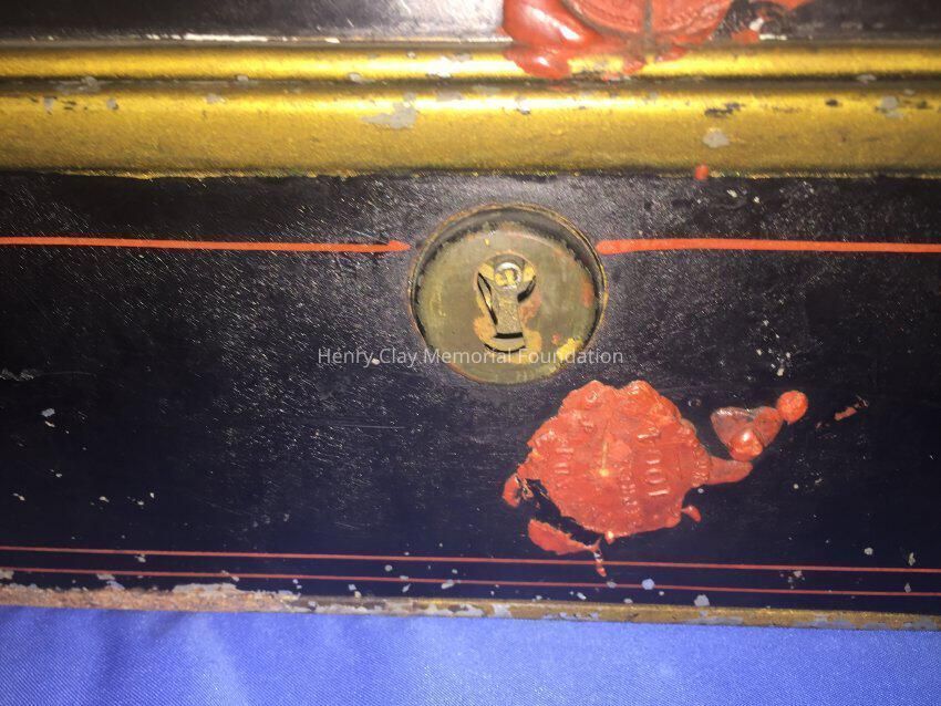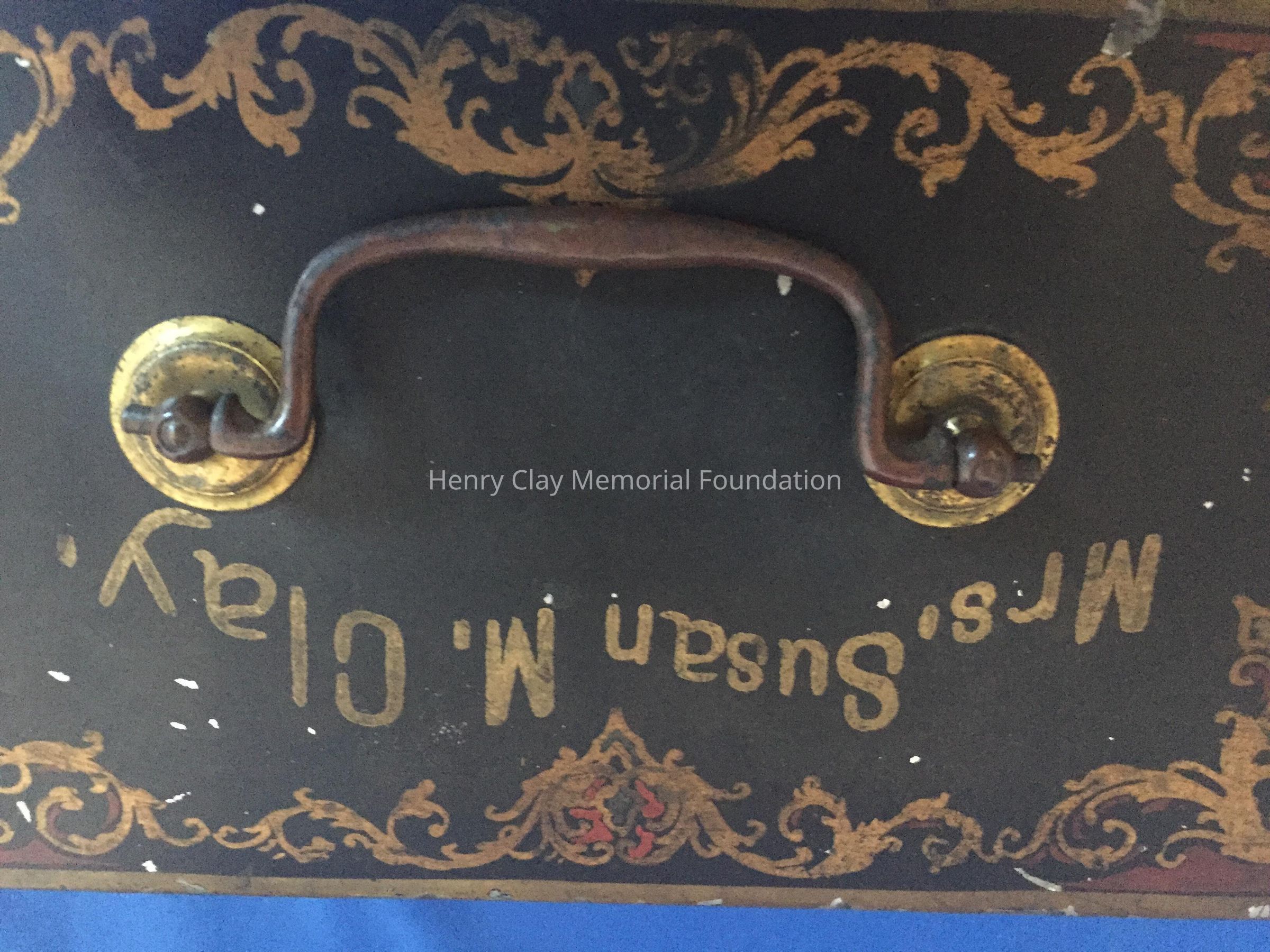 Metal letter box painted black, red, and gold. Painted on the lid: "Mrs. Susan M. Clay." Two red wax seals on front "The Adams Express 1004 Lexington." Also has a paper label on one end inscribed: "Mrs. Susan M. Clay, Louisville, KY." She was the wife of James B. Clay.