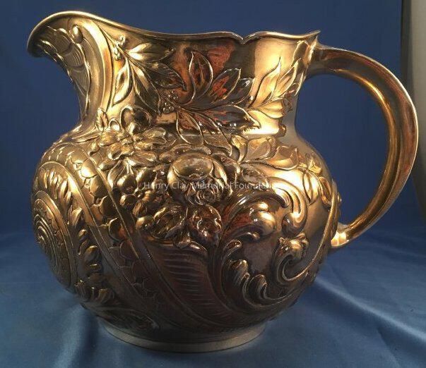 Sterling Repousse wide-bodied pitcher marked with hallmarks and "1665 / Sterling" on bottom.