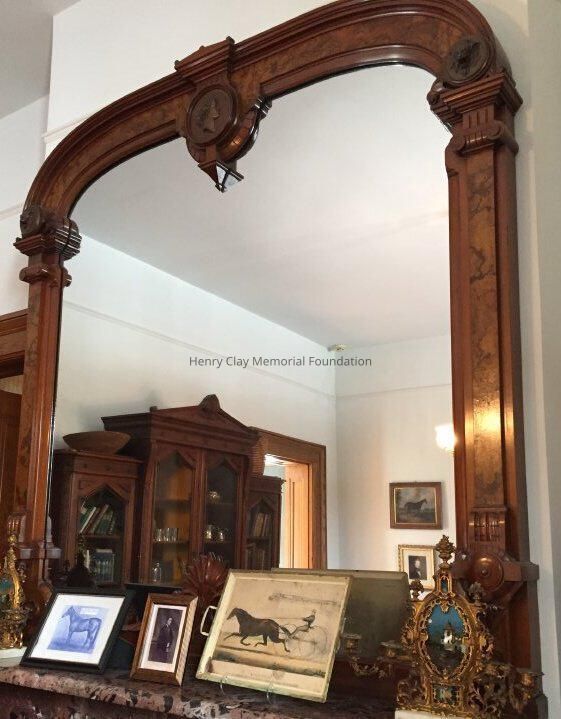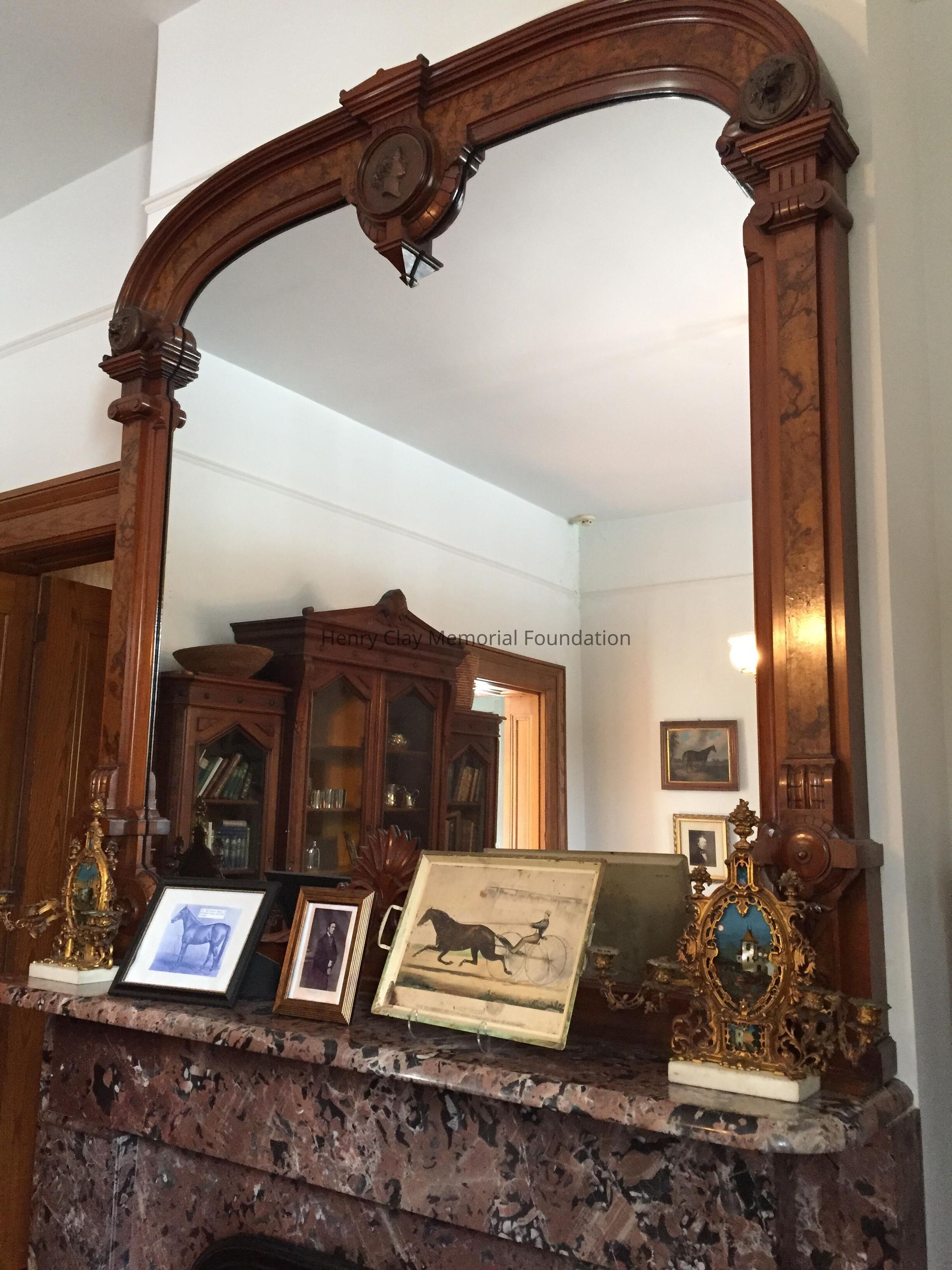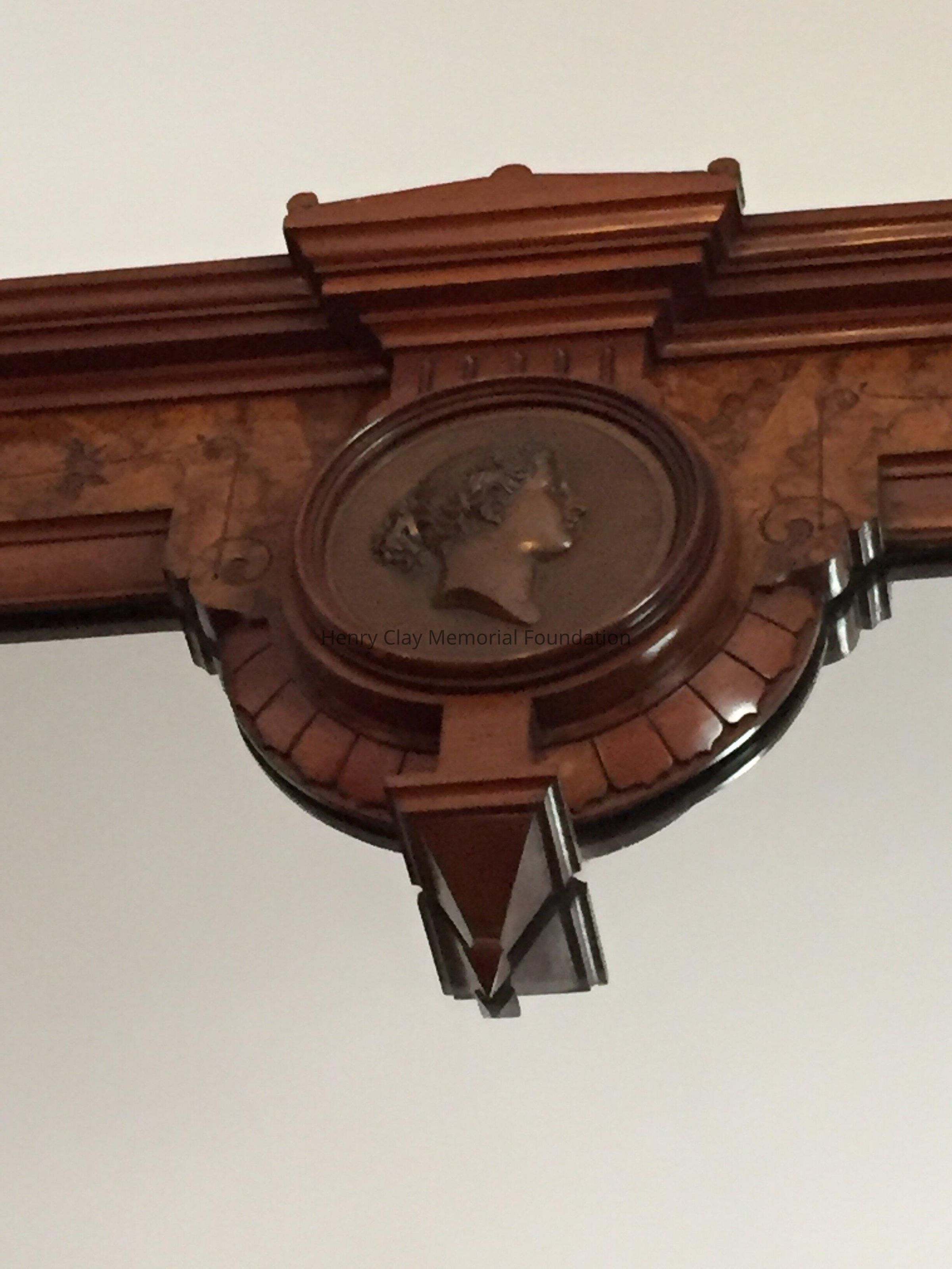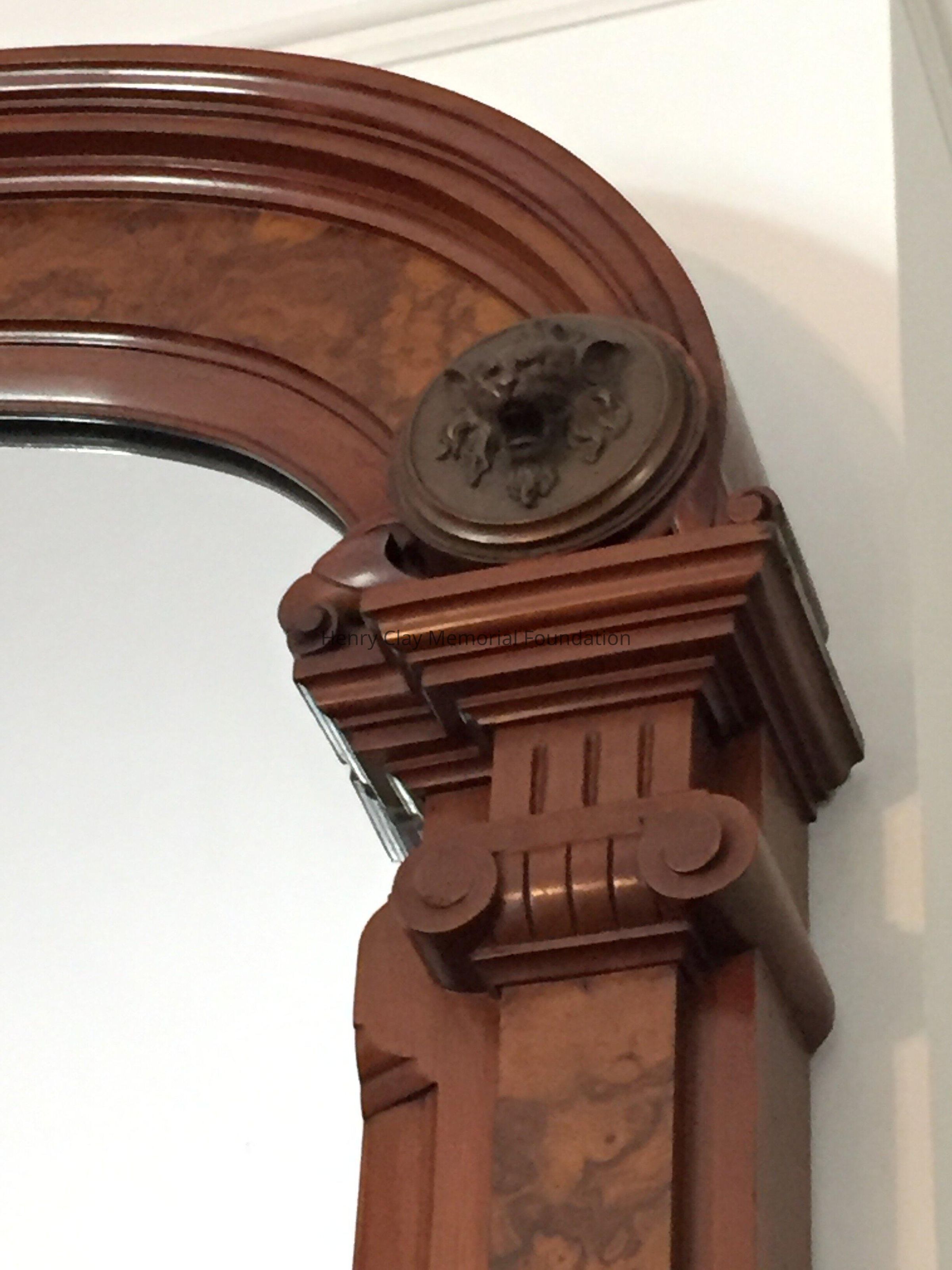 Walnut, with burl inlay, over mantel in Billiard Room, center cartouche with woman's head. The cartouche and animal heads at the side are probably bronze.