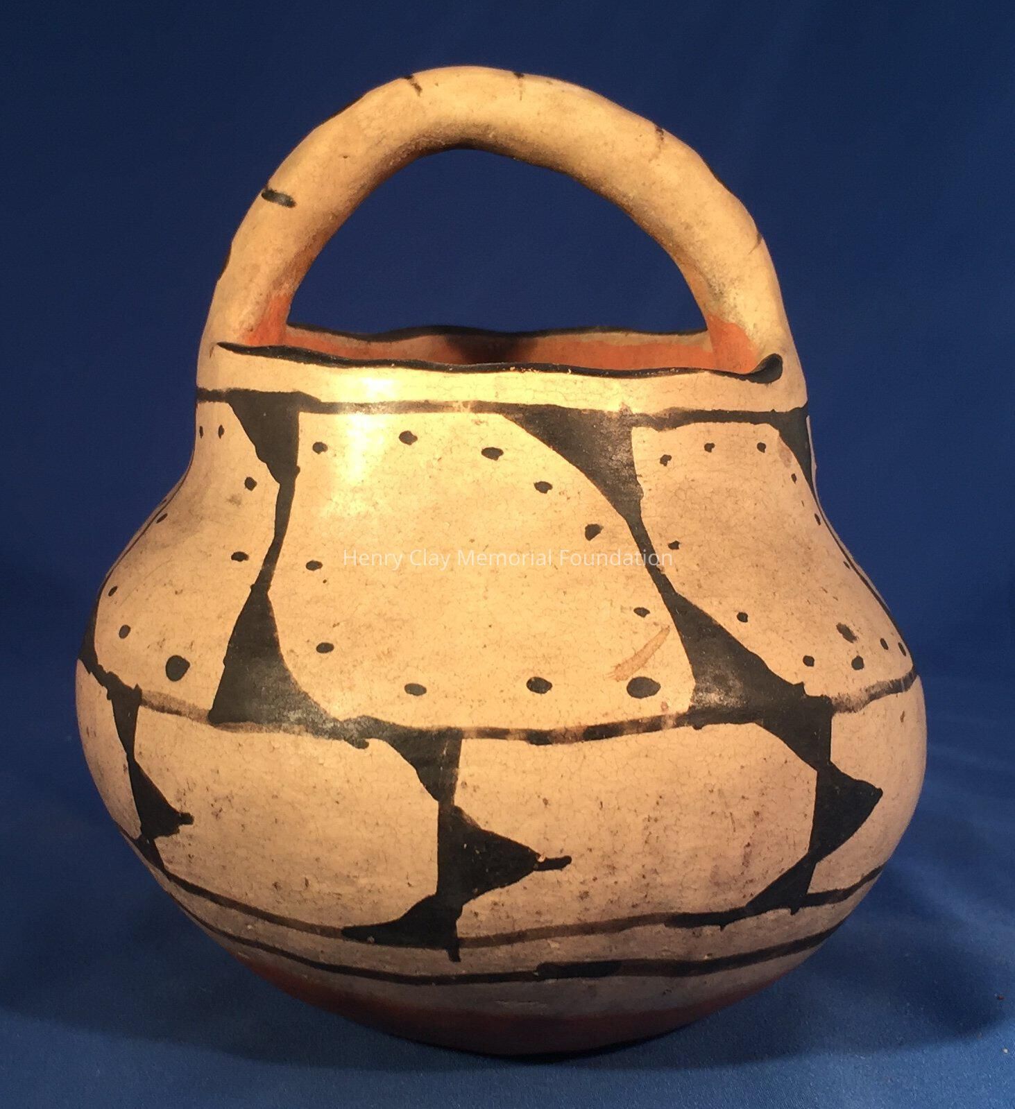 Small red pottery pot with applied handle. Pot is bublous with flared round bottom. Pot is painted white with black dots and lines on the handle and a geometric design on the body with dot borders. Bottom of pot is red.