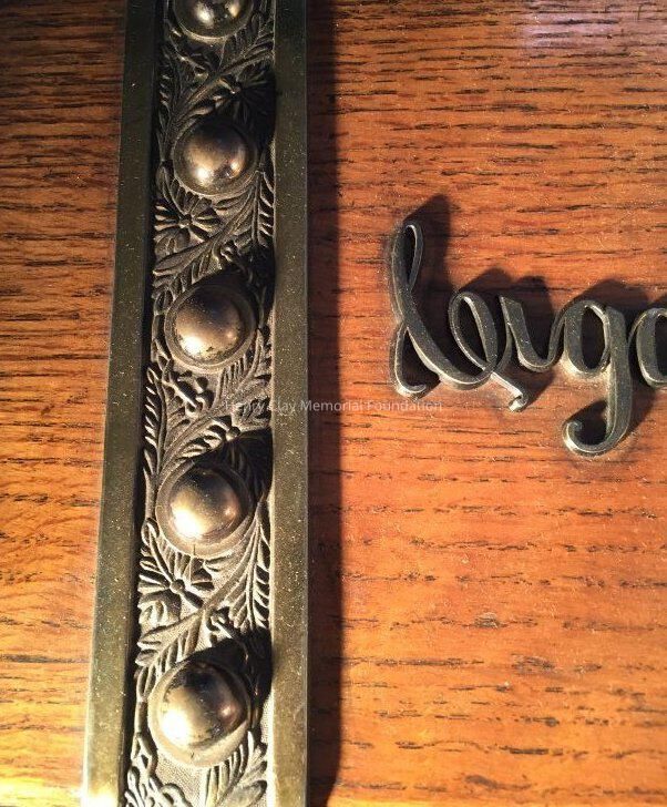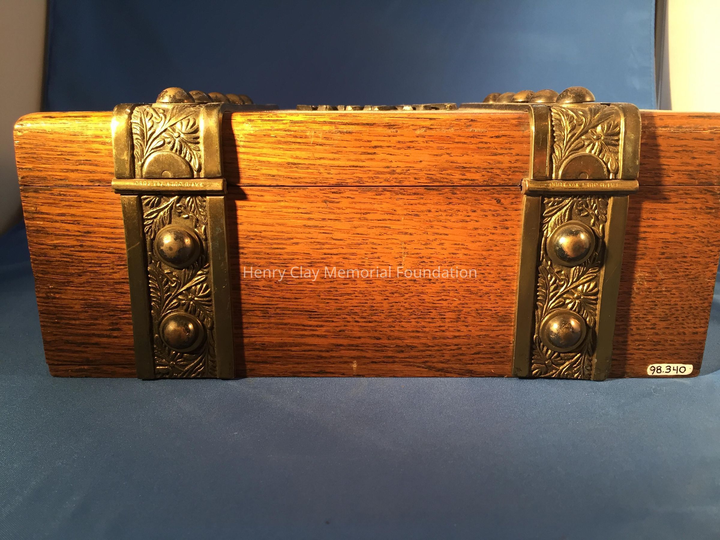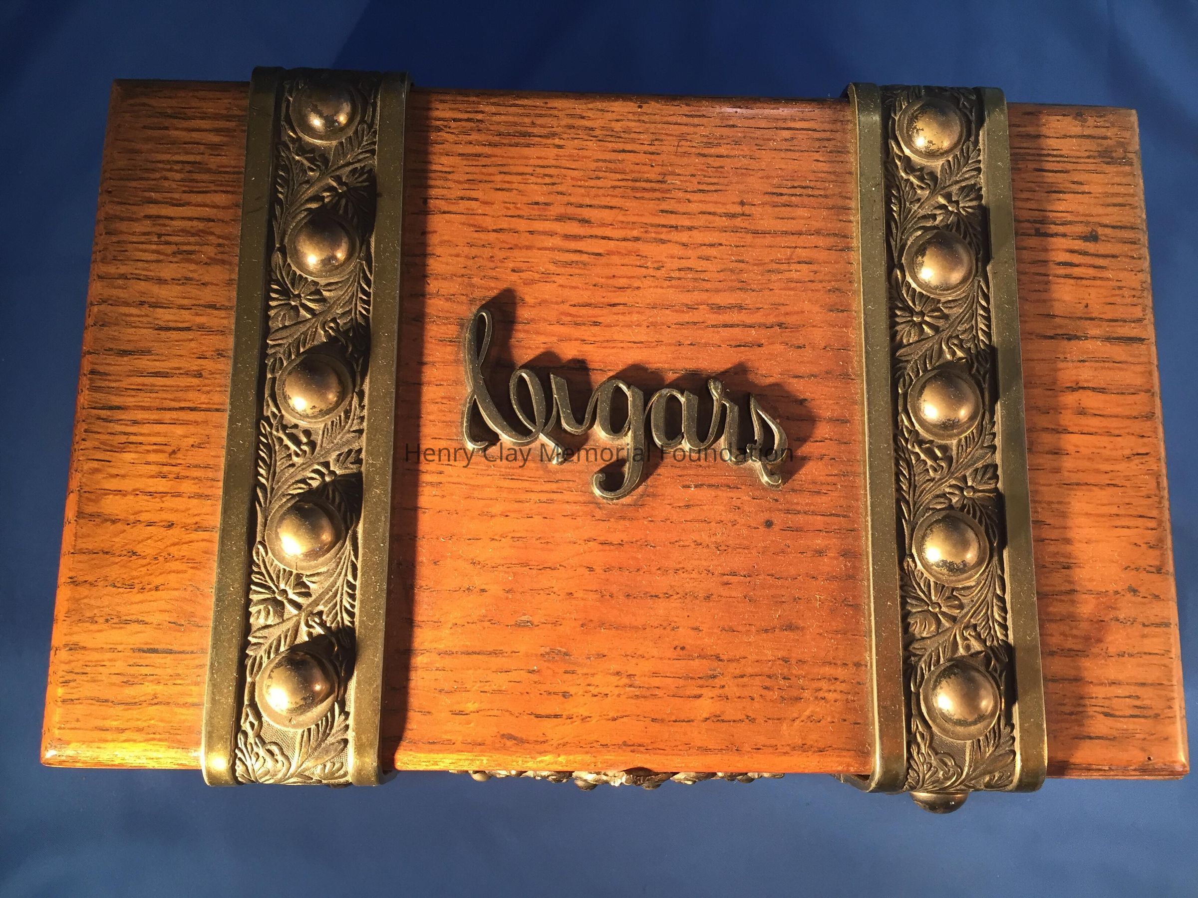 Wooden box with hinged lid and lock. "Cigars" is written on top of box in metal. There are two metal bands that wrap around top of box. Bands have beaded studs on them. Inside is lined with metal (tin?) with a pierced removable piece in back. Top inside of lid is also pierced with decorations.Dimensions