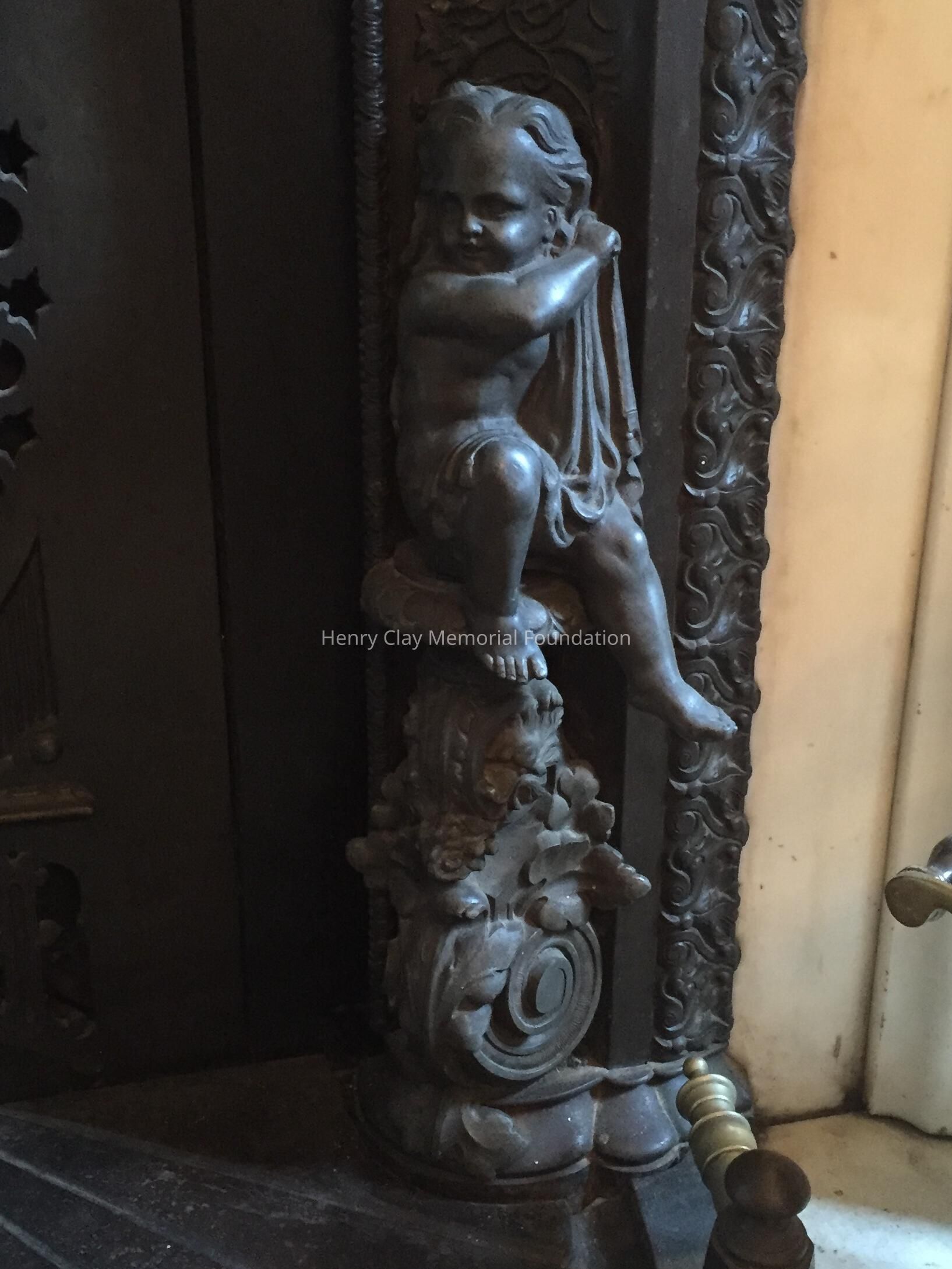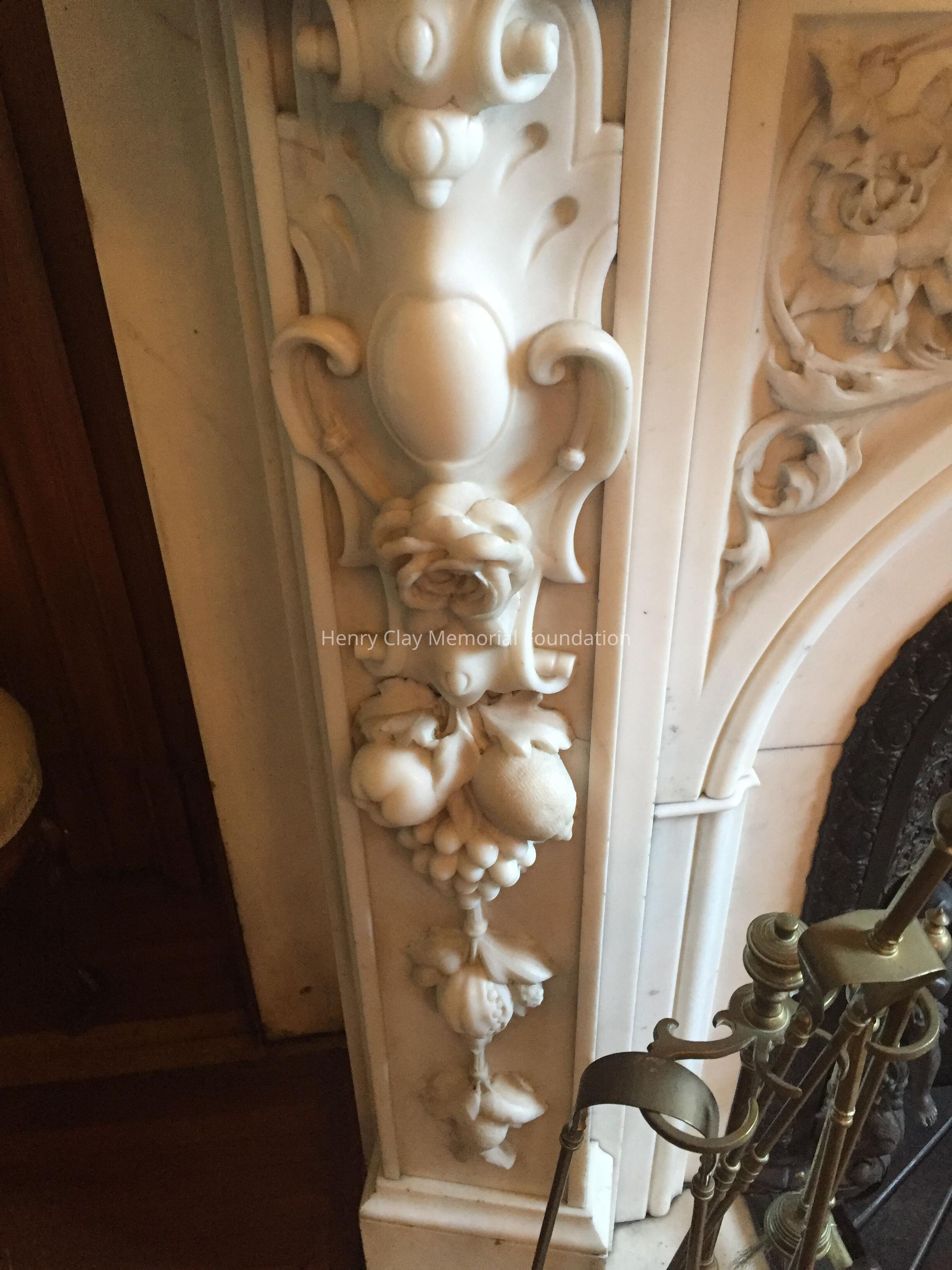 White Carrara marble, shaped shelf, highly carved with cast iron firebox surround.Dimensions