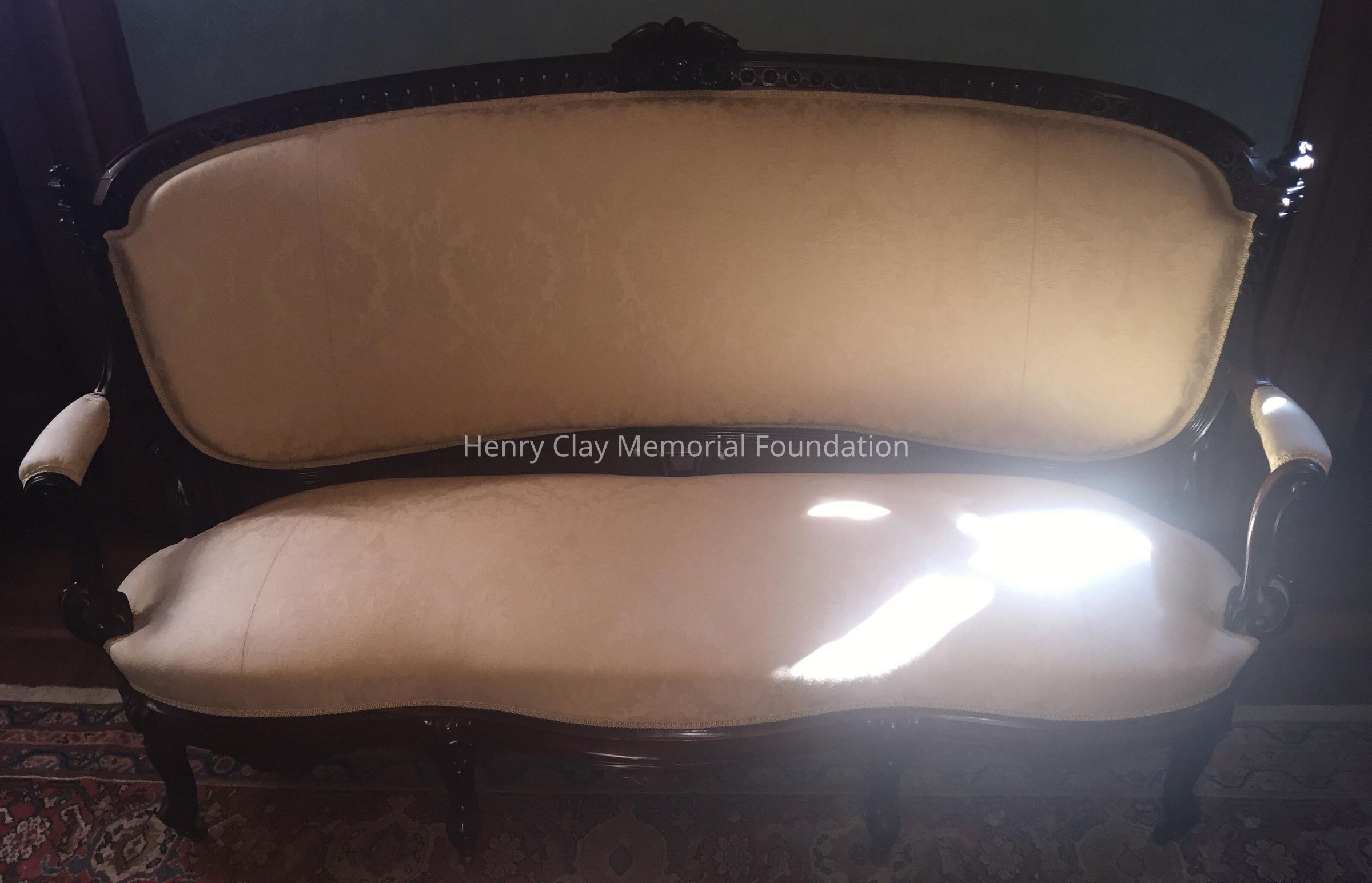Rosewood sofa, with upholstered back, seat, open arms, upholstery gold damask, part of set of seven.