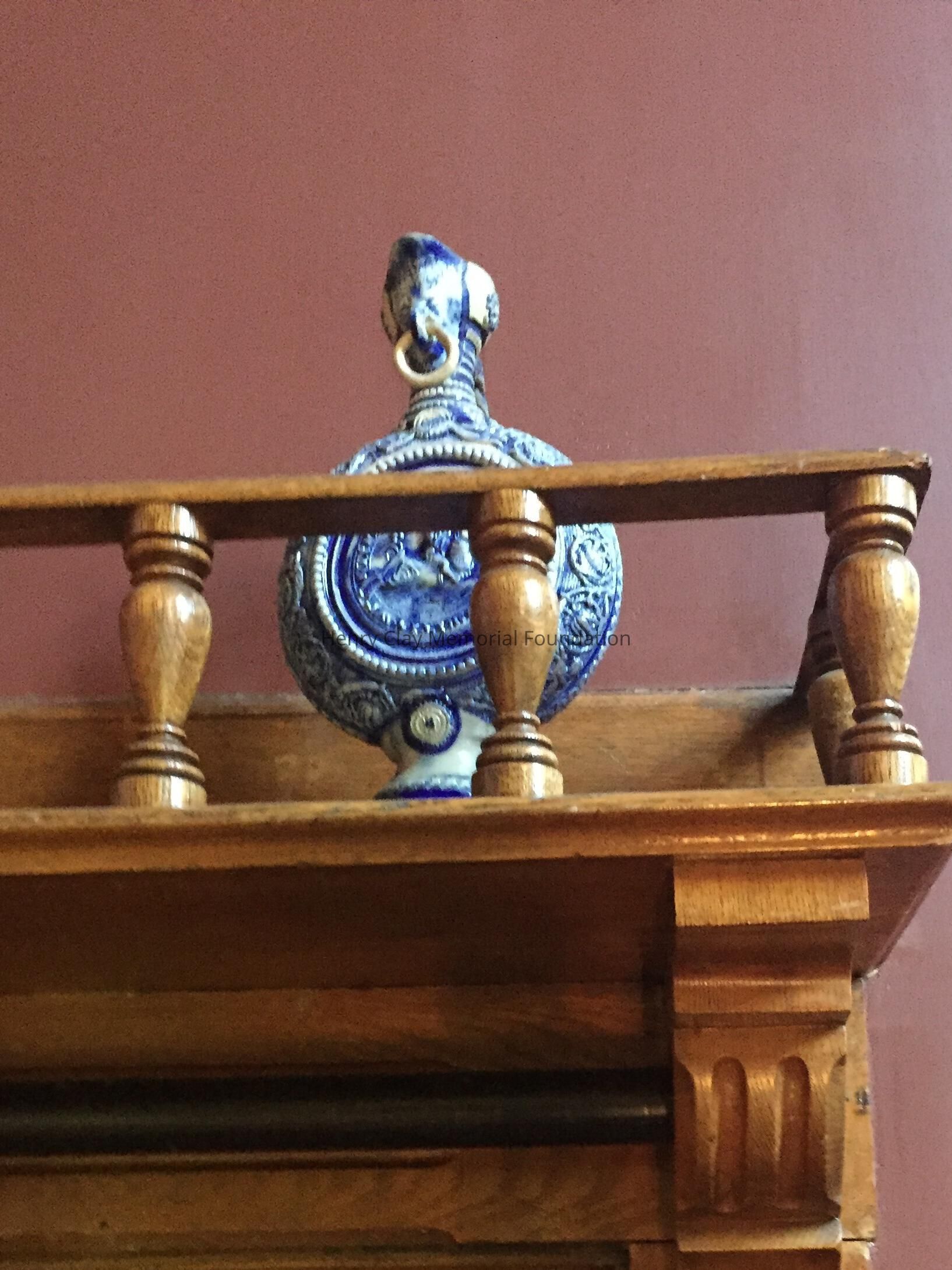 A) blue and grey reliefed pitcher. On front, scene with horse and rider (knight) with Latin inscription going around; on back, flower decoration. All over, organic design. Animal face spout with loose ring being held.