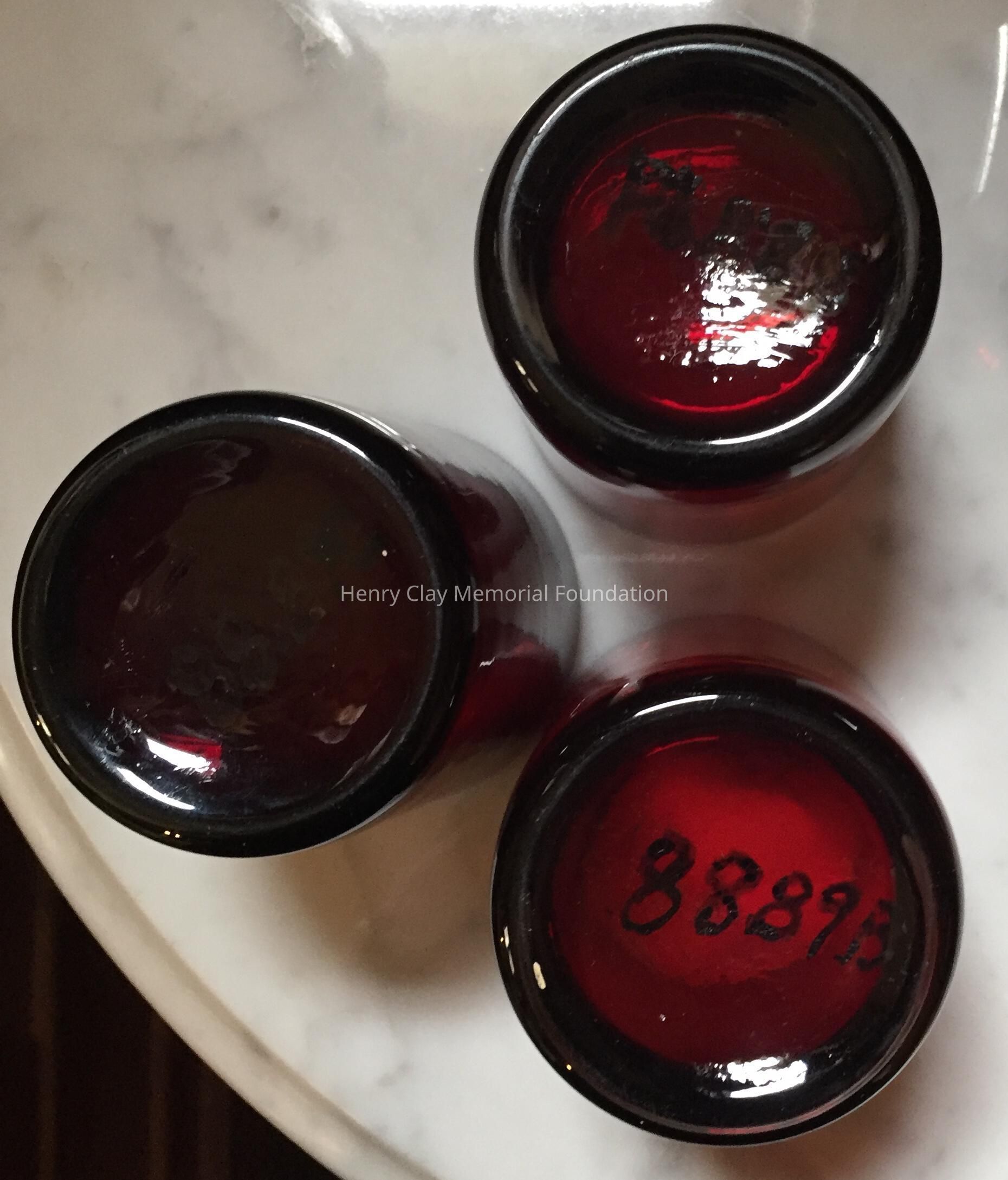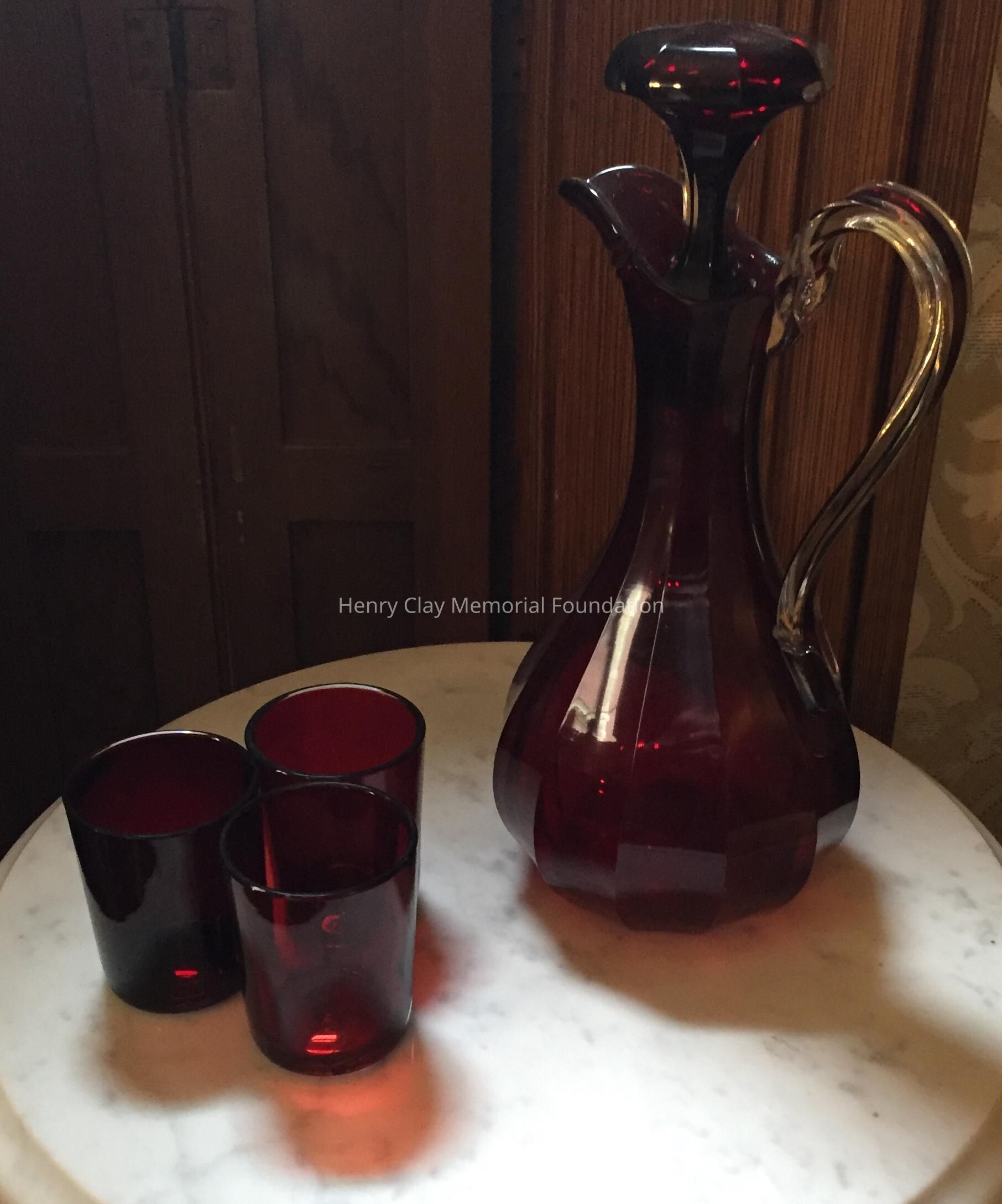 Of red Bohemian-style glass. Pitcher has stopper and curved handle. 3 tumblers.
